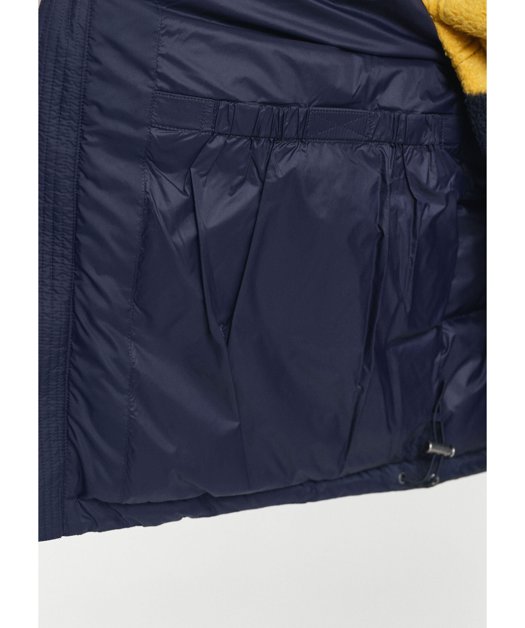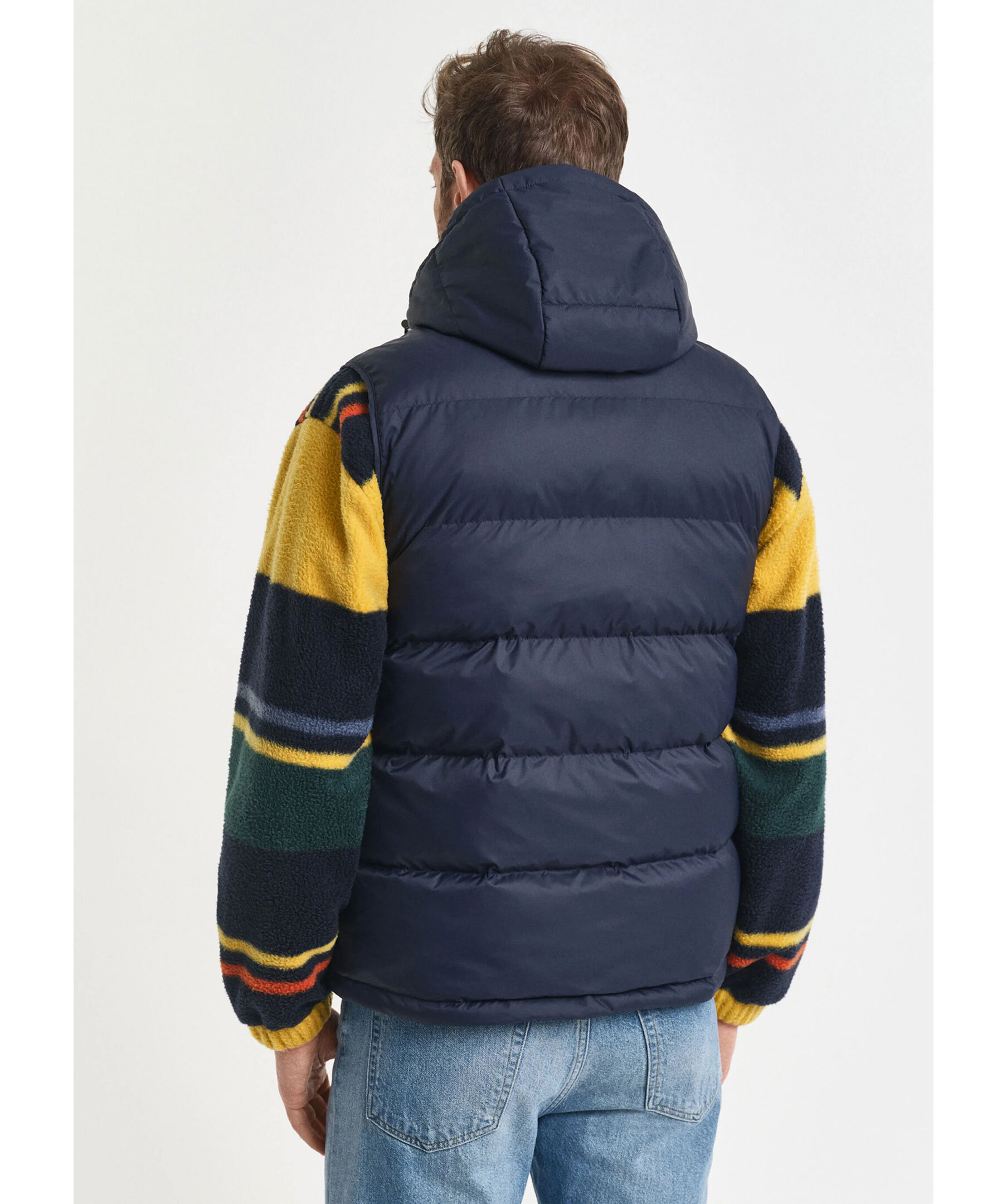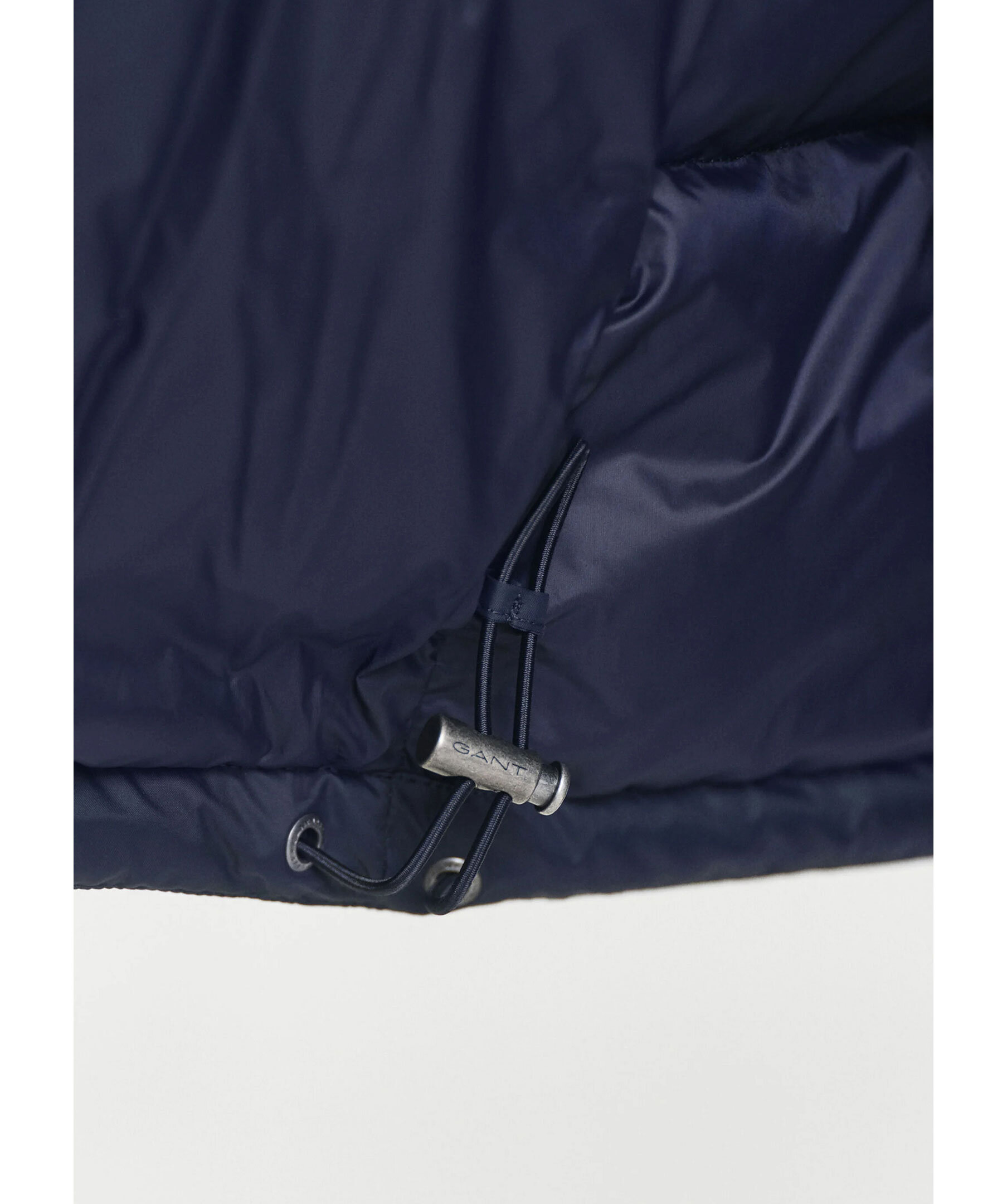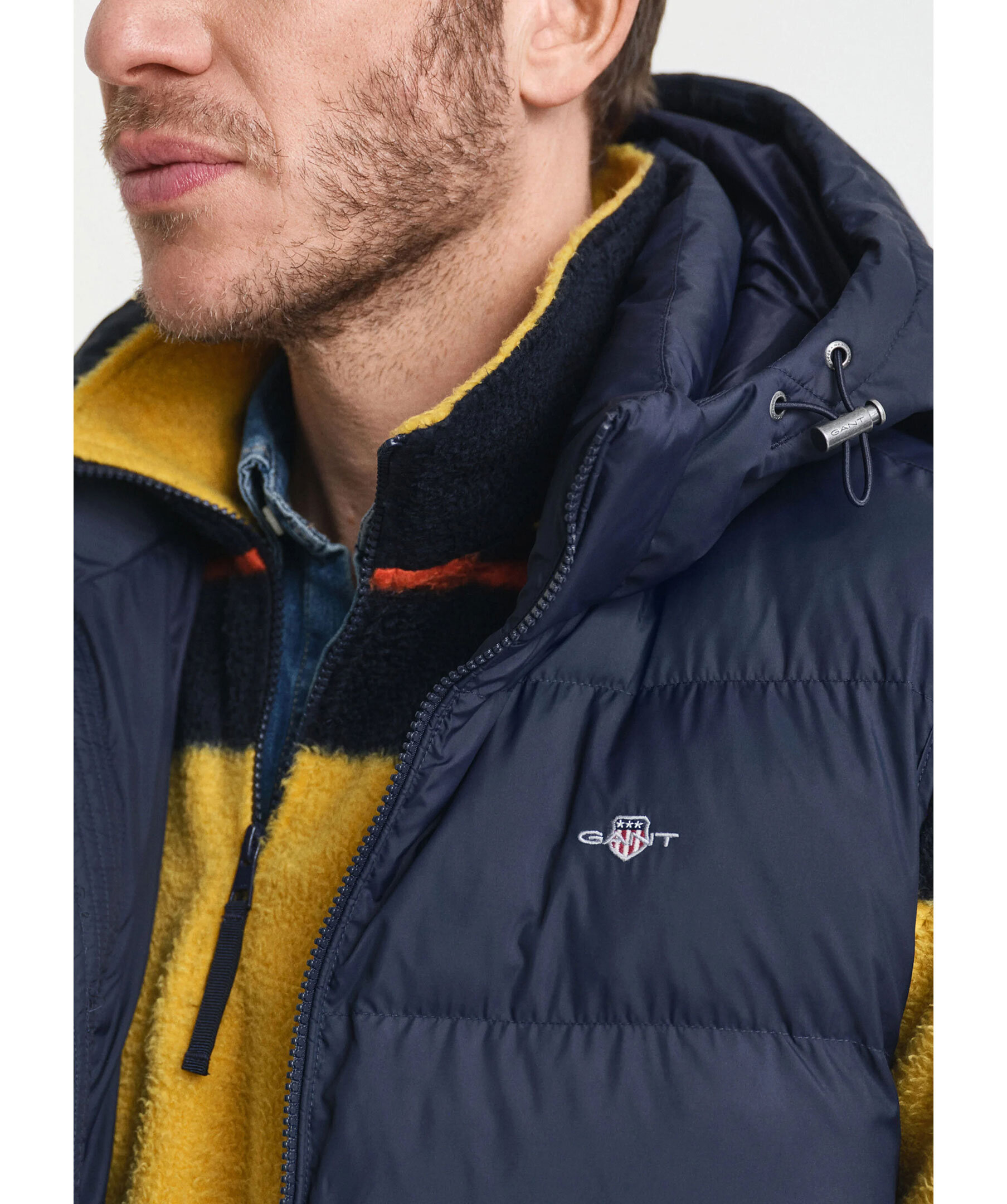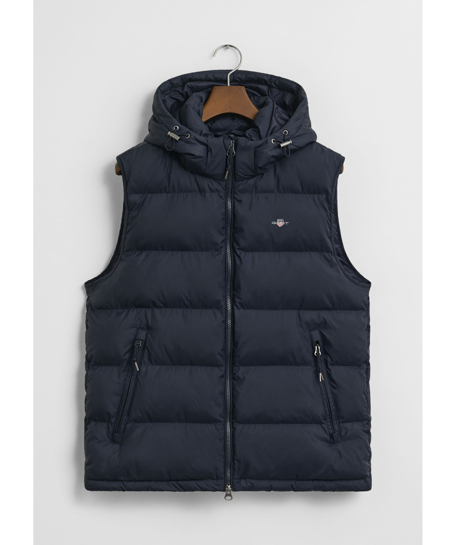 Mörkblå väst från Gant. Västen stängs med tvåvägsdragkedja och har avtagbar huva, snedställda sidfickor med dragkedja samt en vattenavvisande DWR-beläggning (Durable Water Repellent) som hjälper till att leda bort vatten i lätt regn. Tillverkad i polyester.