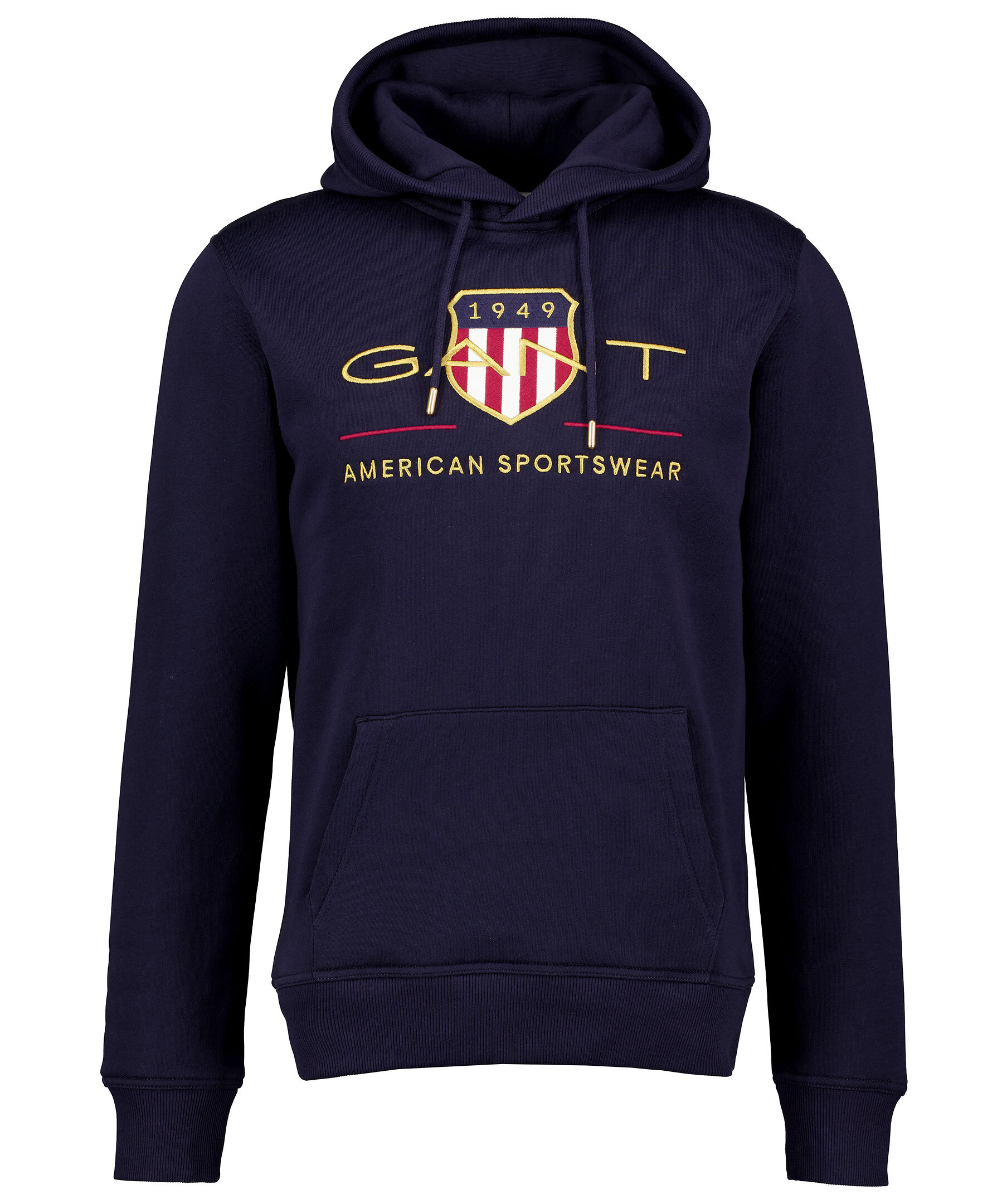 Marinblå hoodie från Gant i skön bomull. Tröjan har luva med snörning samt stor ficka på magen. Ribbstickade muddar och broderad logotyp på bröstet. Har en borstad insida och är tillverkad i bomull och polyesterblandning. * Broderad logotyp * Magficka * Ribbade muddar
