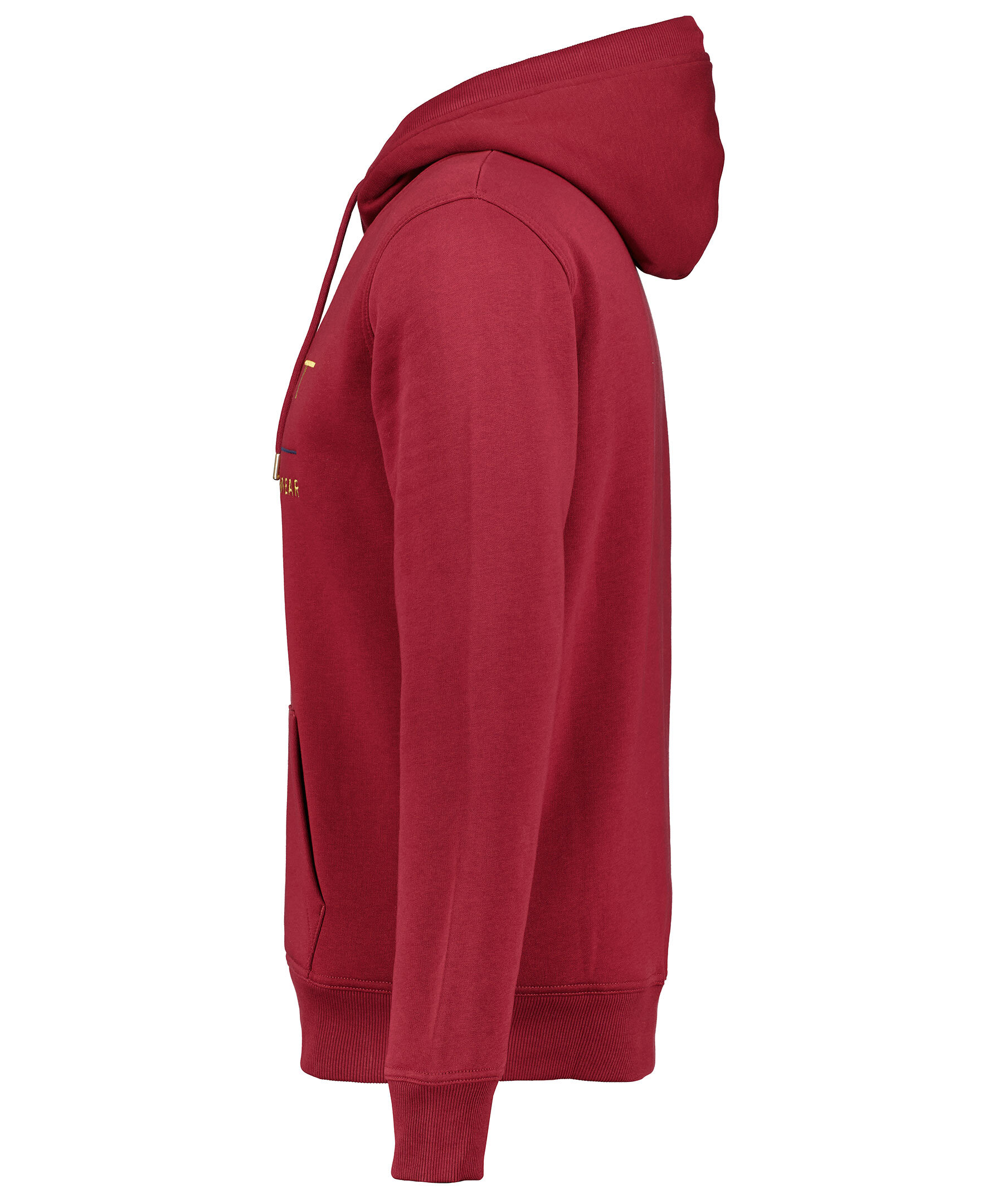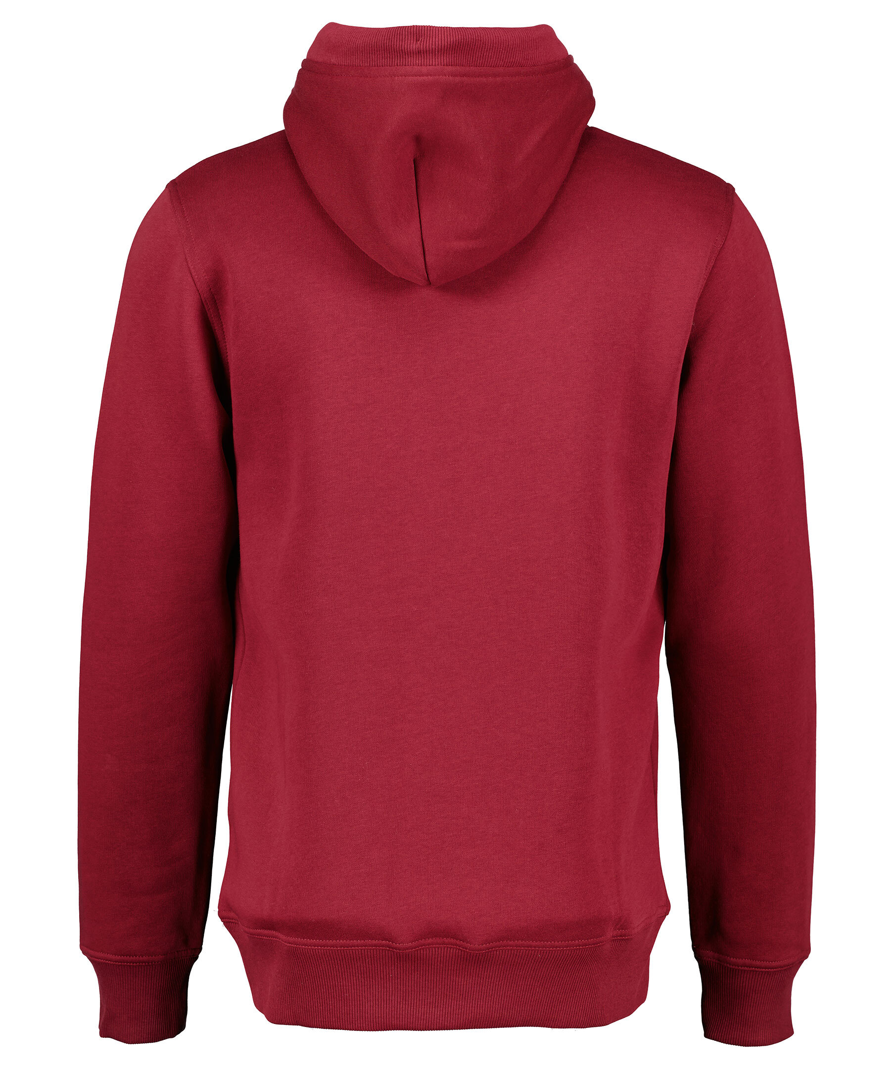 Vinröd hoodie från Gant. Tillverkad i en bomullblandning med en mjuk borstad insida. Tröjan har luva med snörning samt stor ficka på magen. Ribbstickade muddar och broderad logotyp med sköld på bröstet.