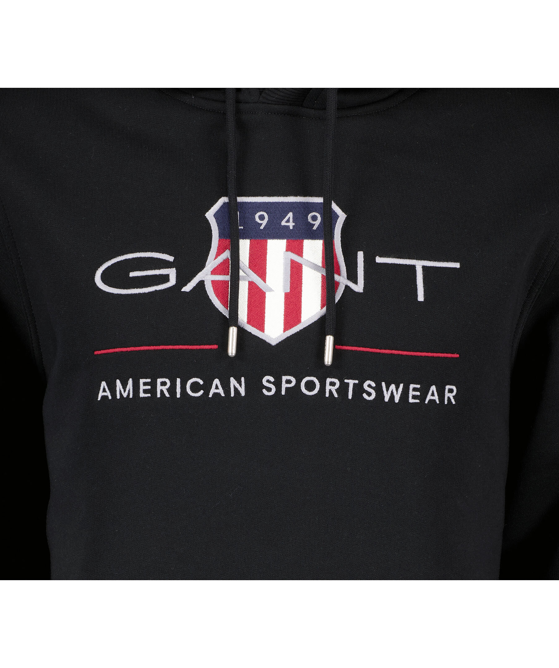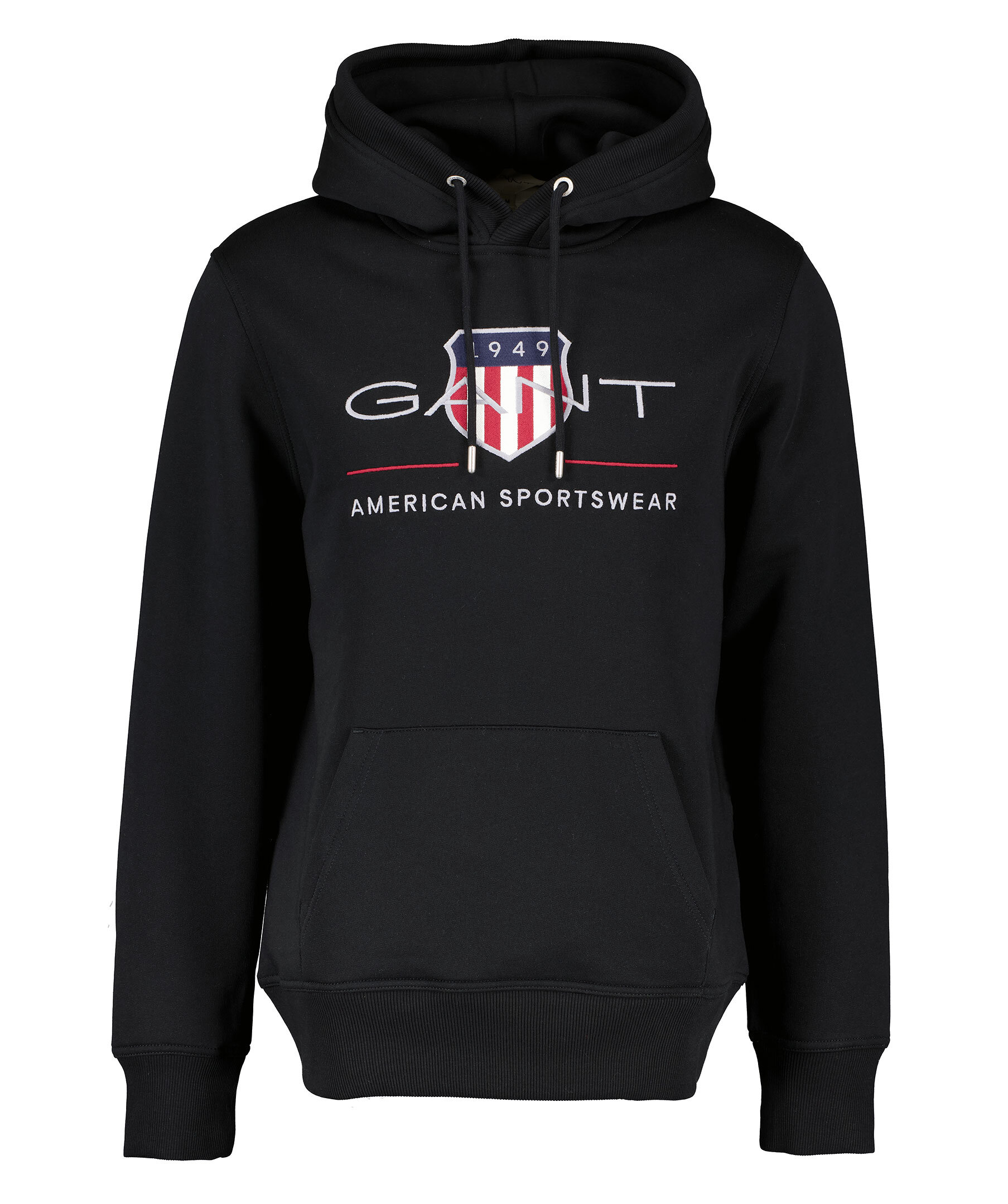 Svart hoodie från Gant. Hoodien har en 80-talsinspirerad sköldlogotyp med retrolook och är i normal passform för en ledigare look. Tröjan är designad för komfort och matchas lika väl med sweatpants som med jeans. Tillverkad i en bomullsblandning. Känguruficka på magen.