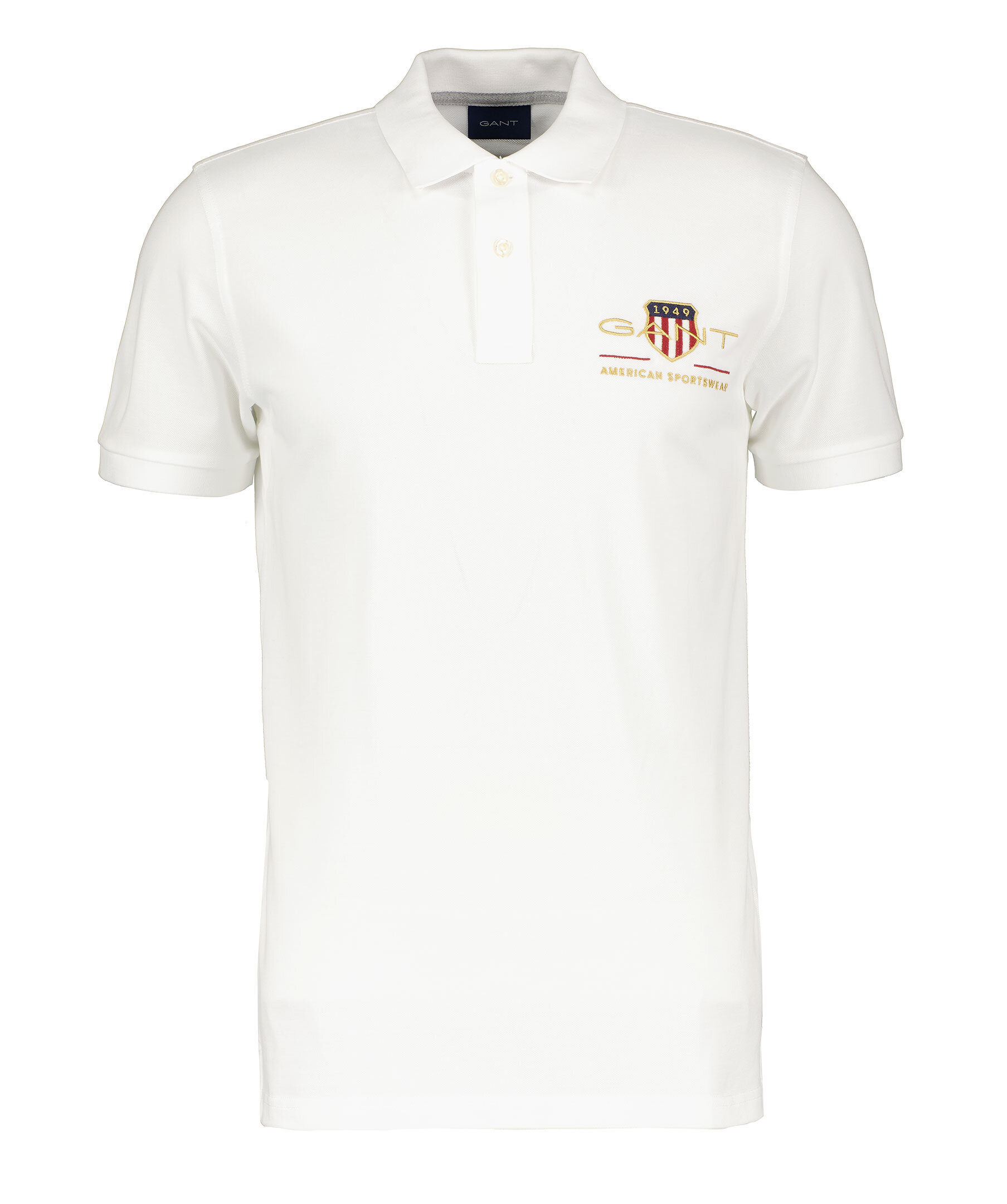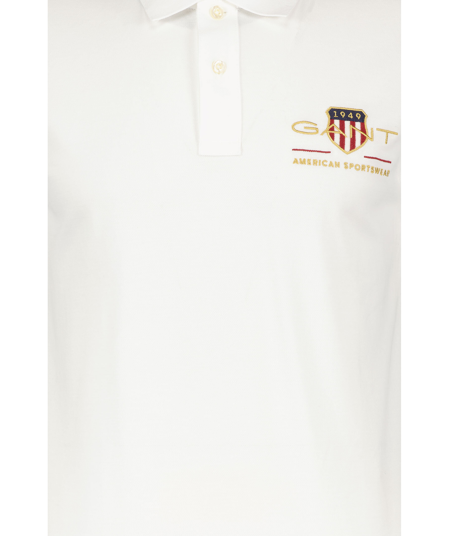 Vit kortärmad piké från Gant. Tröjan har en normal passform och är gjord i 100% bomull. Krage i twill material. Mellanstor broderad logotyp med GANT-sköld på ena sidan av bröstet.