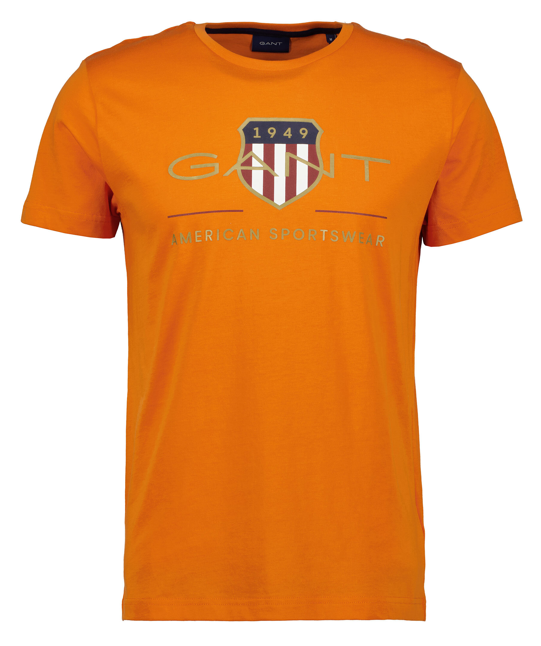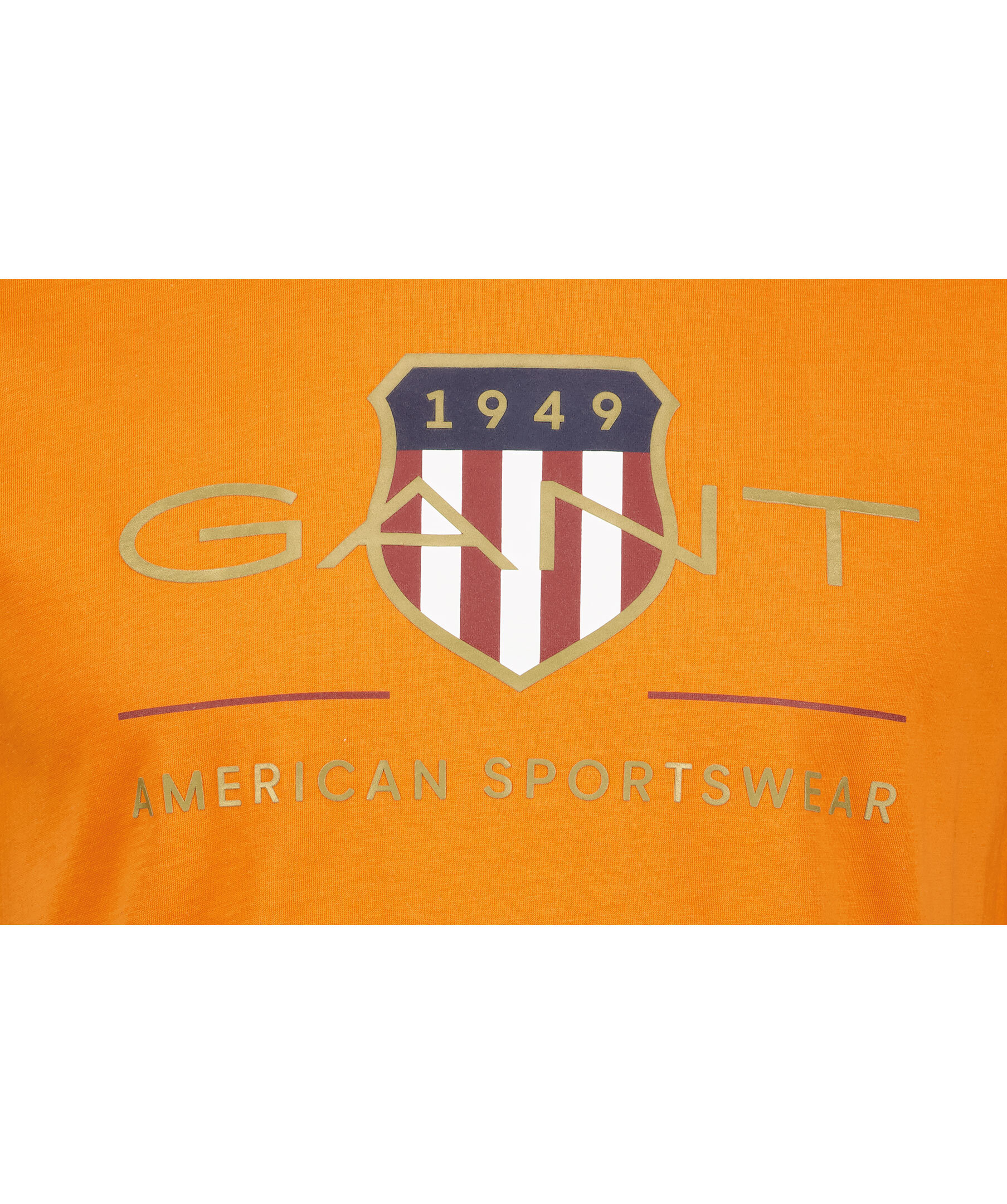 Orange t-shirt i stretchig bomull från Gant. Rund halsringning och rak modell. Tryckt logotyp och sköld mitt på bröstet. Tillverkad i 100% Bomull.