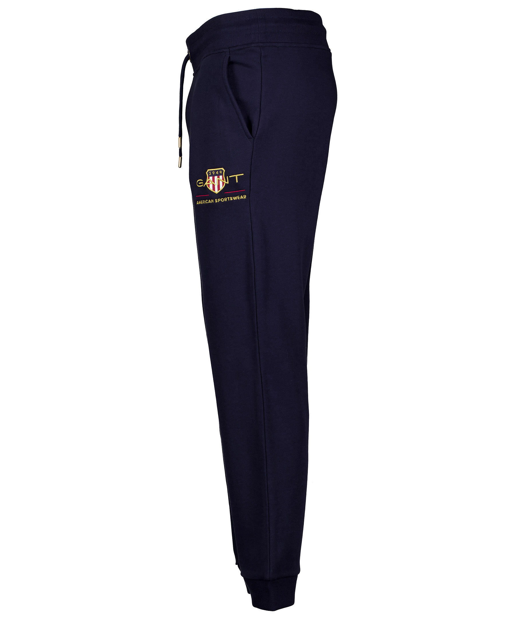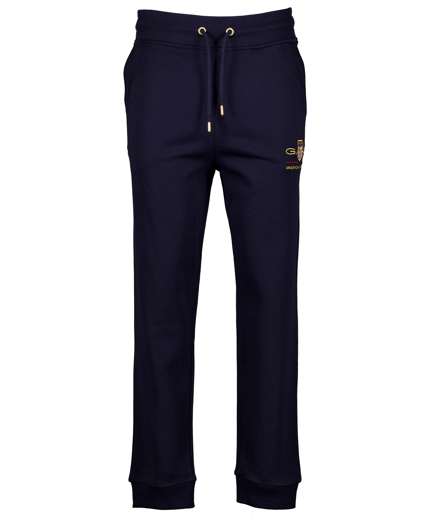 Marinblå mjukisbyxor från Gant. Mudd och snörning i midjan, muddar i benslut, två framfickor och en bakficka. Brodyr och sköld på vänster byxben. Tillverkade i bomullsblandning.