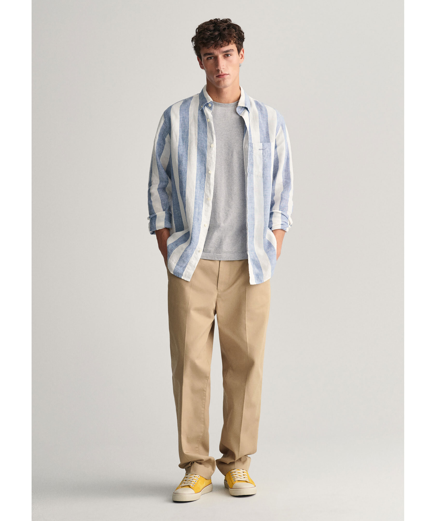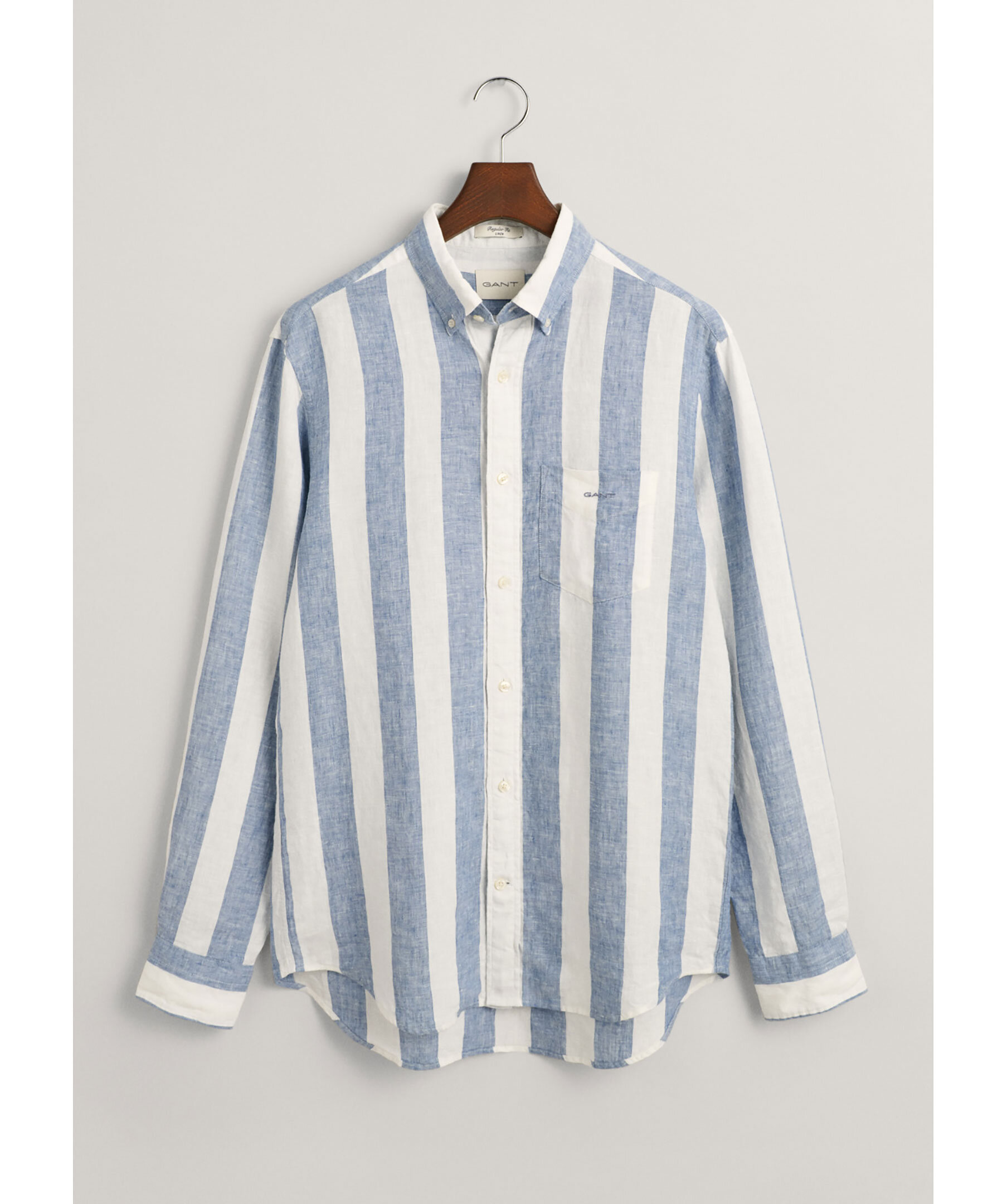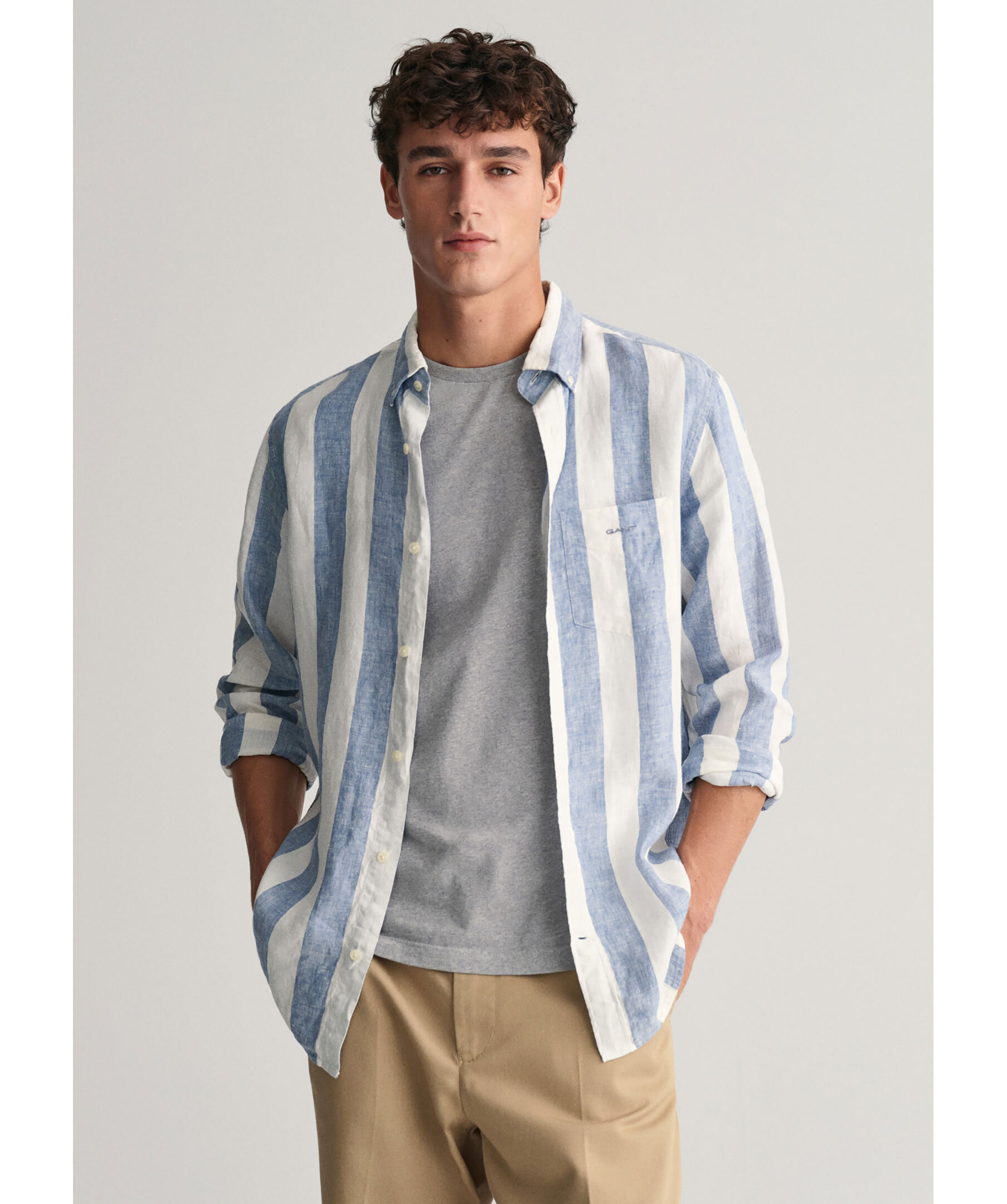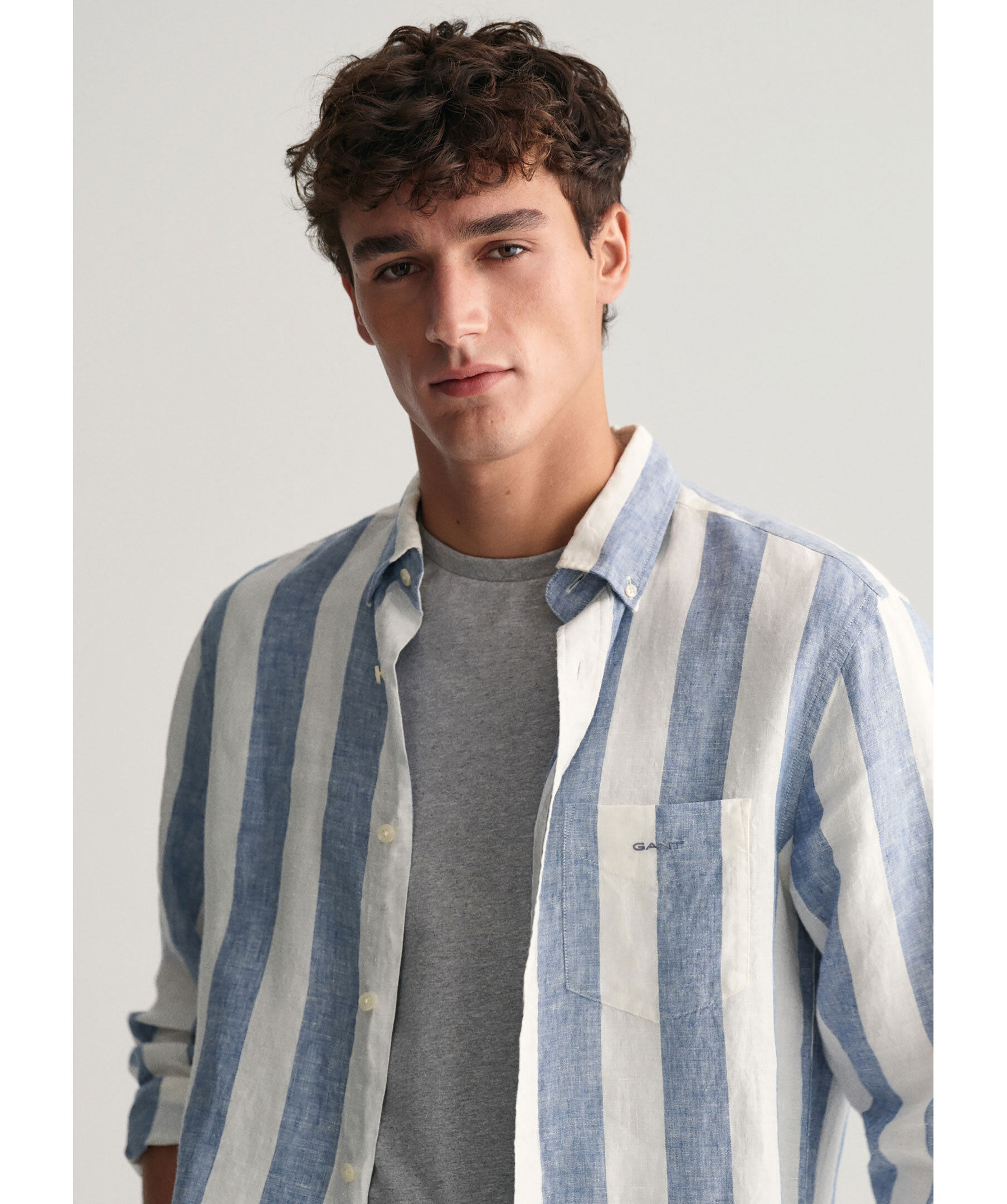 Blå och vit randig linneskjorta från Gant. Tillverkad i 100% linne med breda ränder. Button down-krage, rundad fåll, en bröstficka med broderad logotyp och locker loop i ryggen. Normal passform.