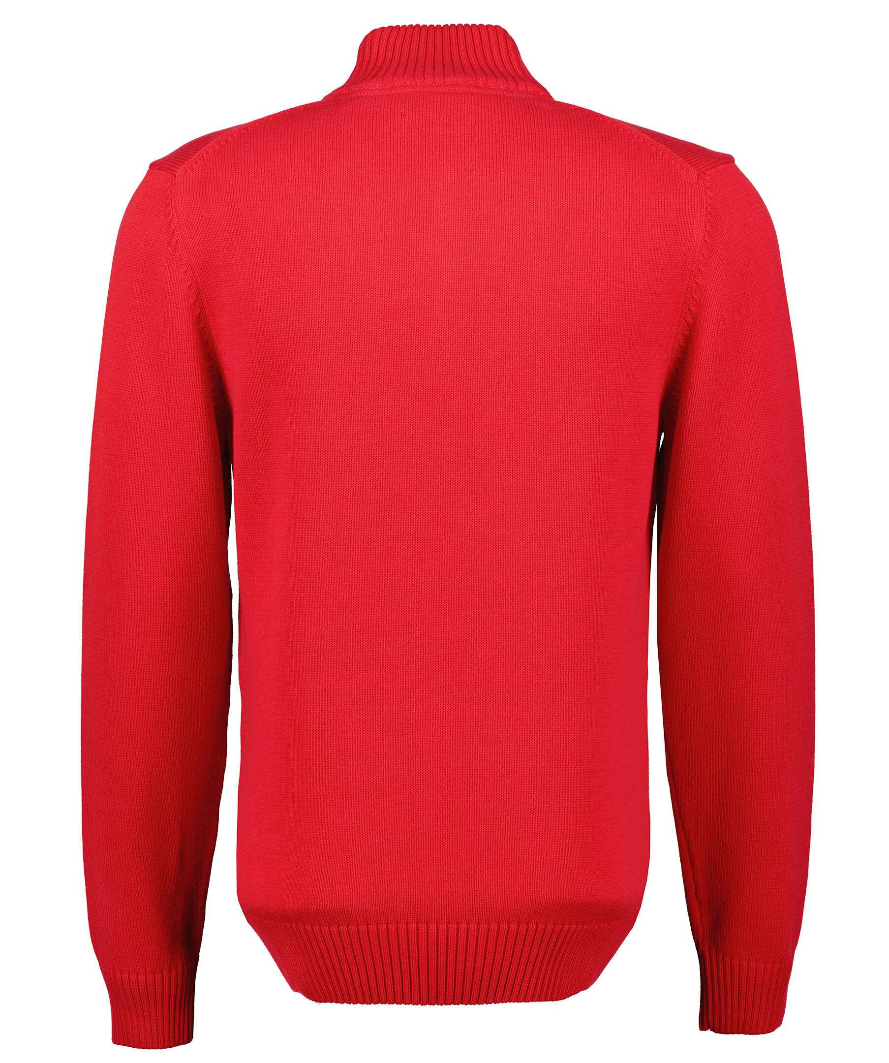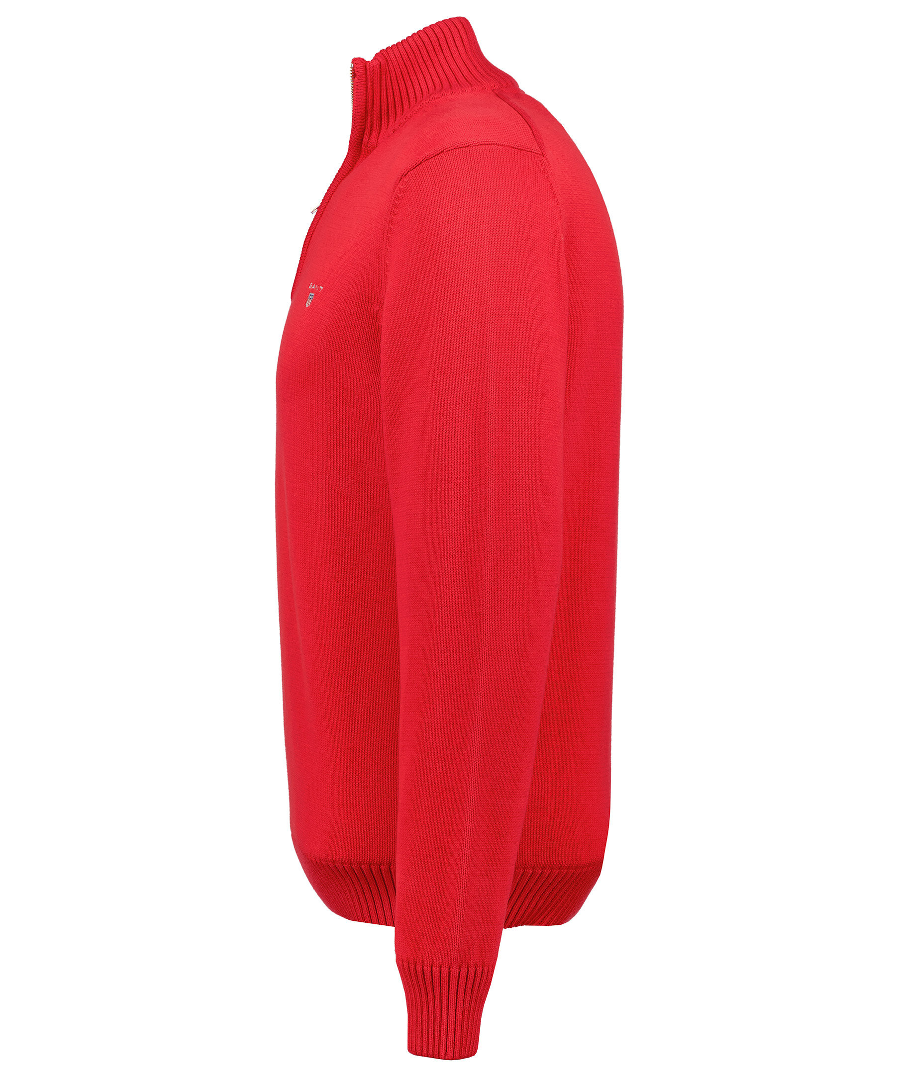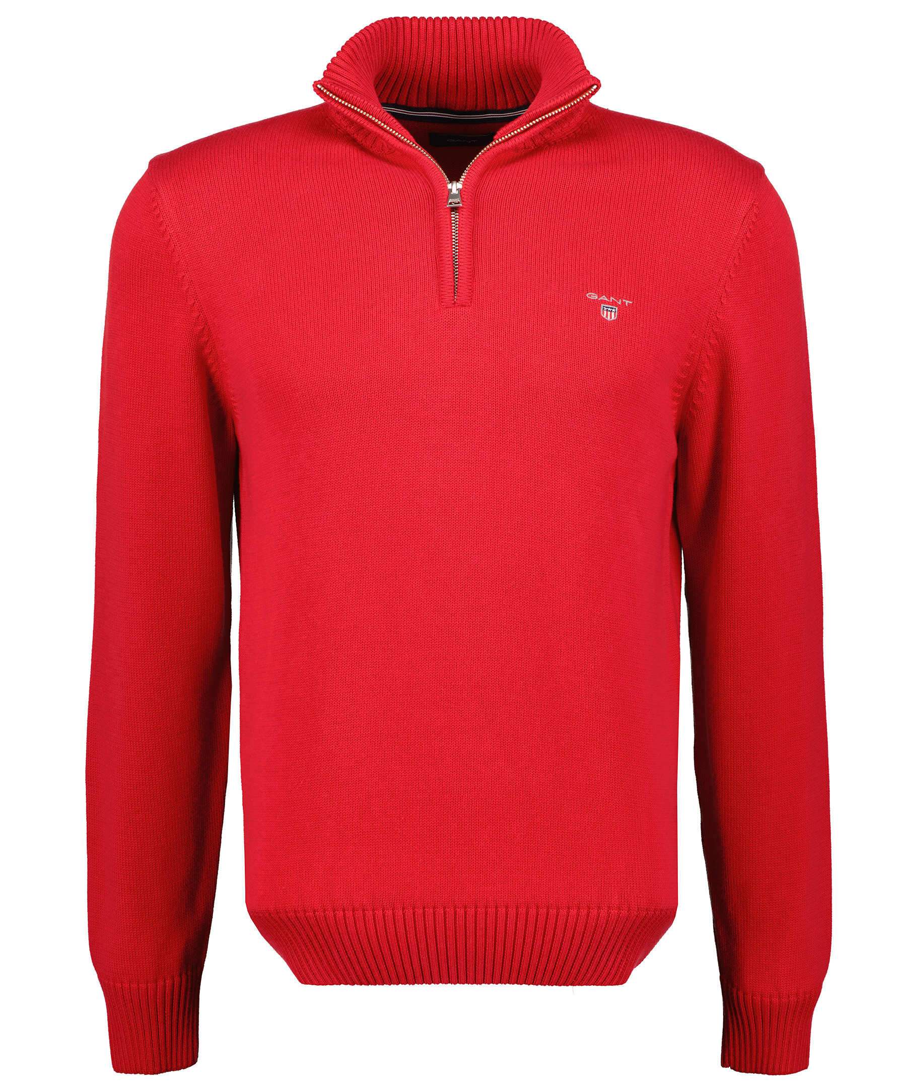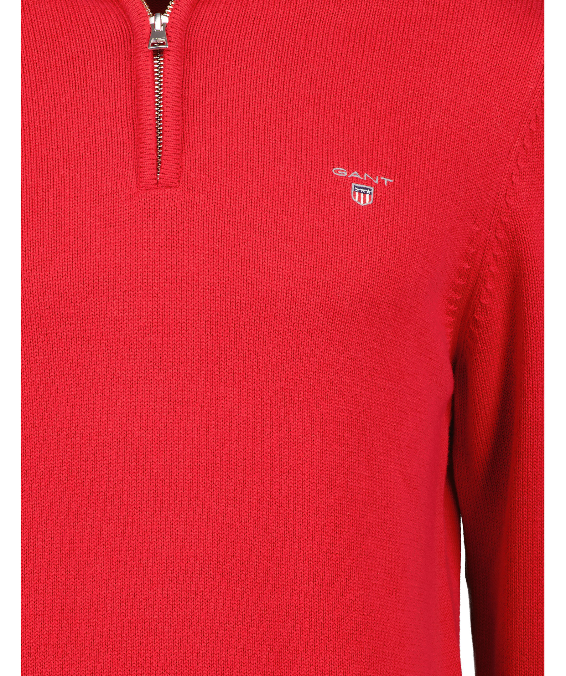 Röd finstickad tröja från Gant. Hög krage med halvzip, broderad logga på bröstet, stickade muddar. Tillverkad i 100% bomull.