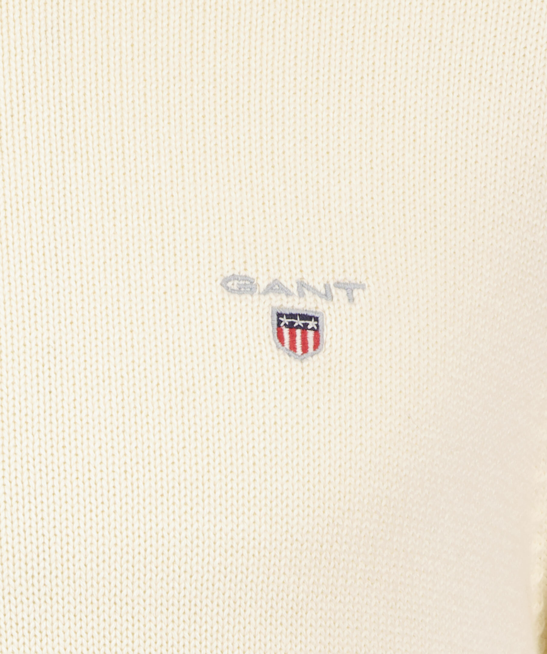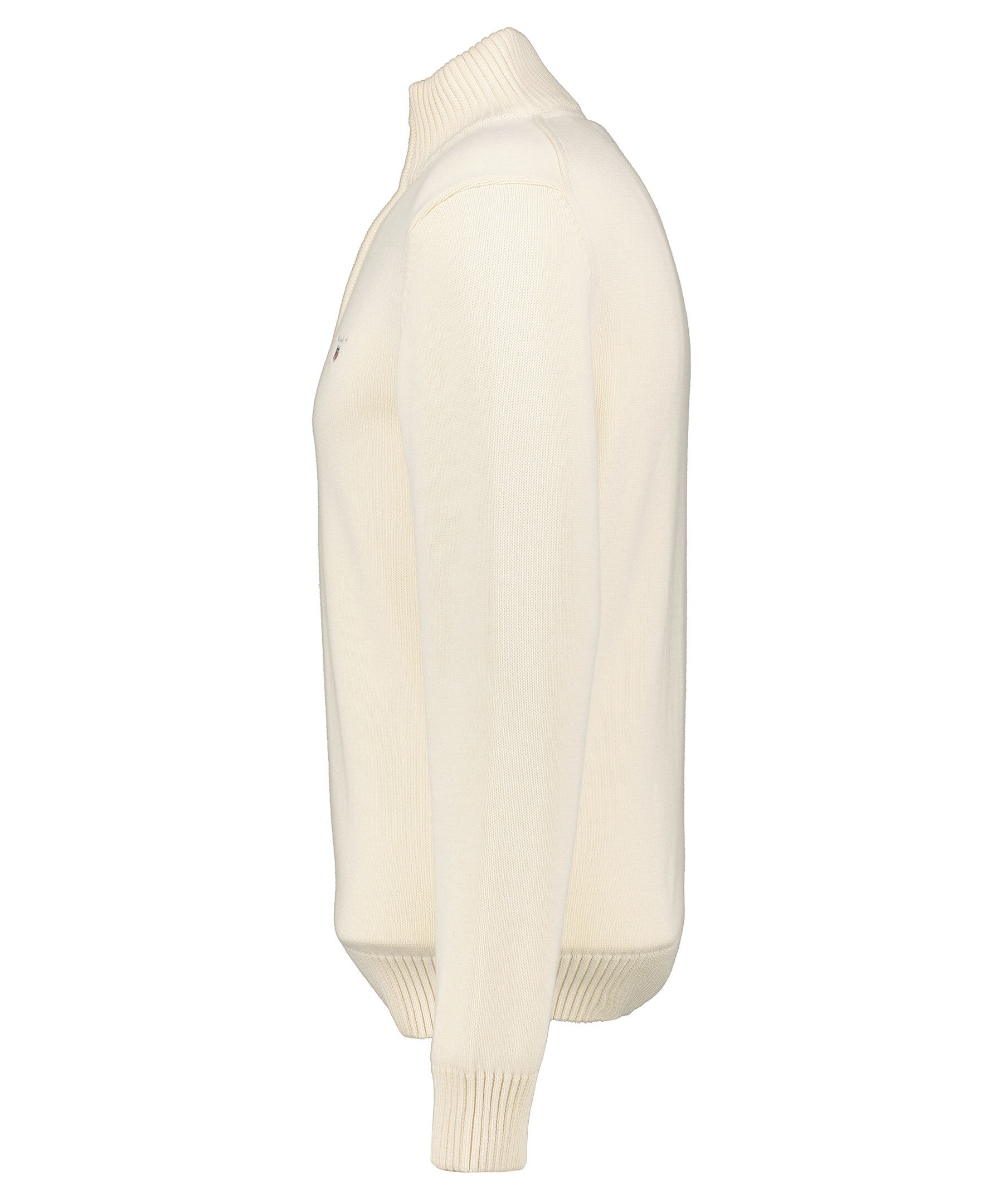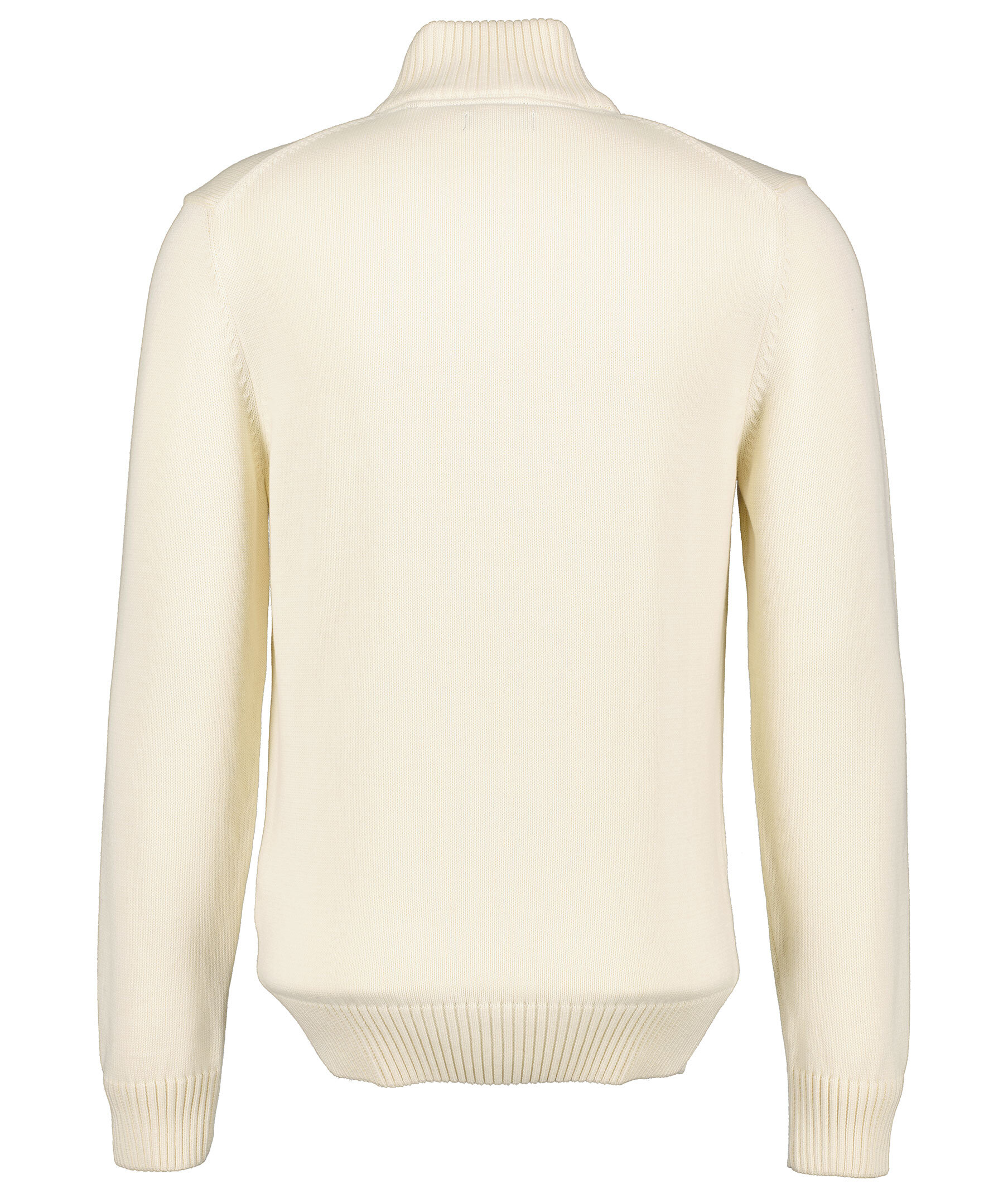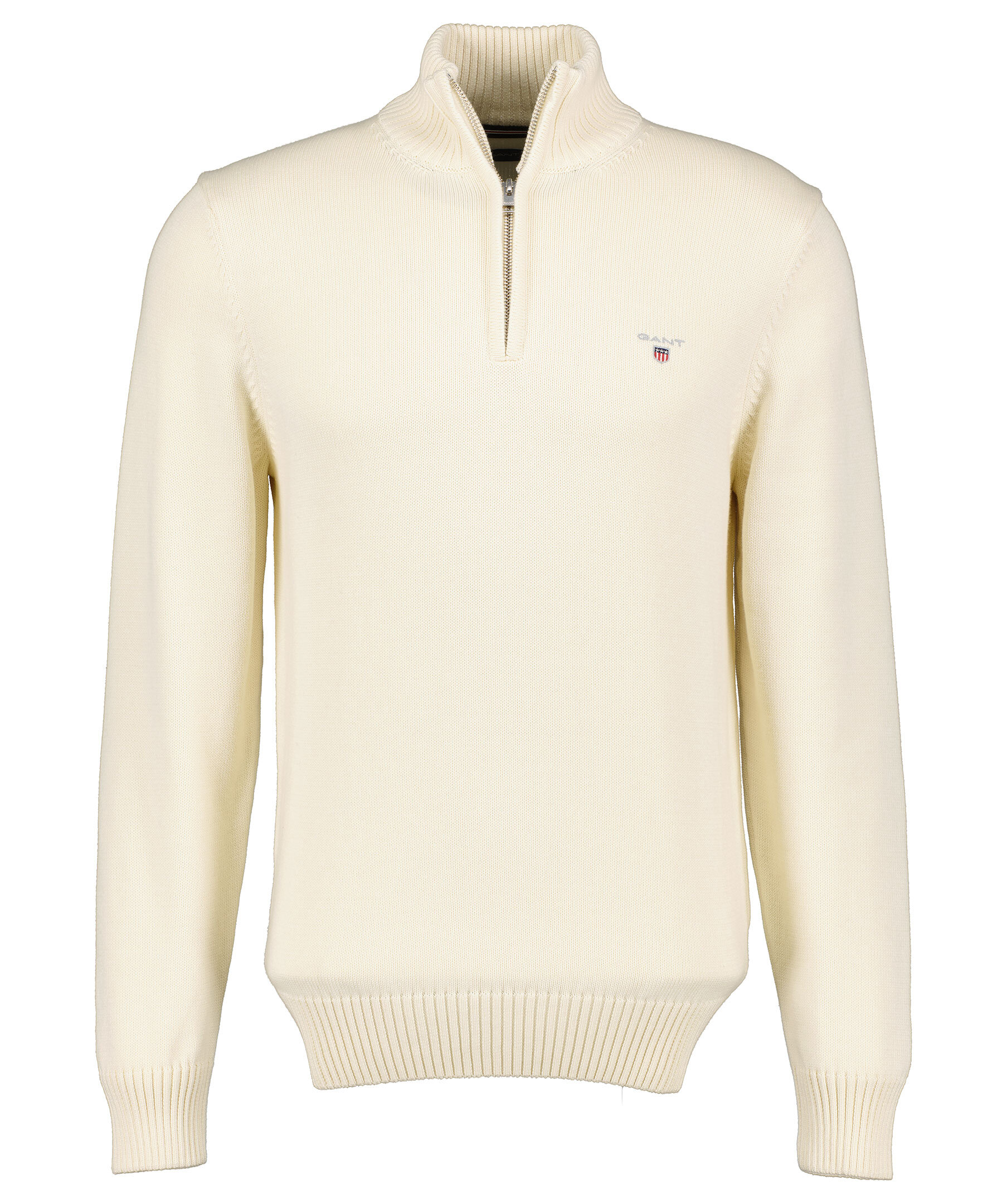 Gräddvit finstickad tröja från Gant. Hög krage med halvzip, broderad logga på bröstet, stickade muddar. Tillverkad i 100% bomull.