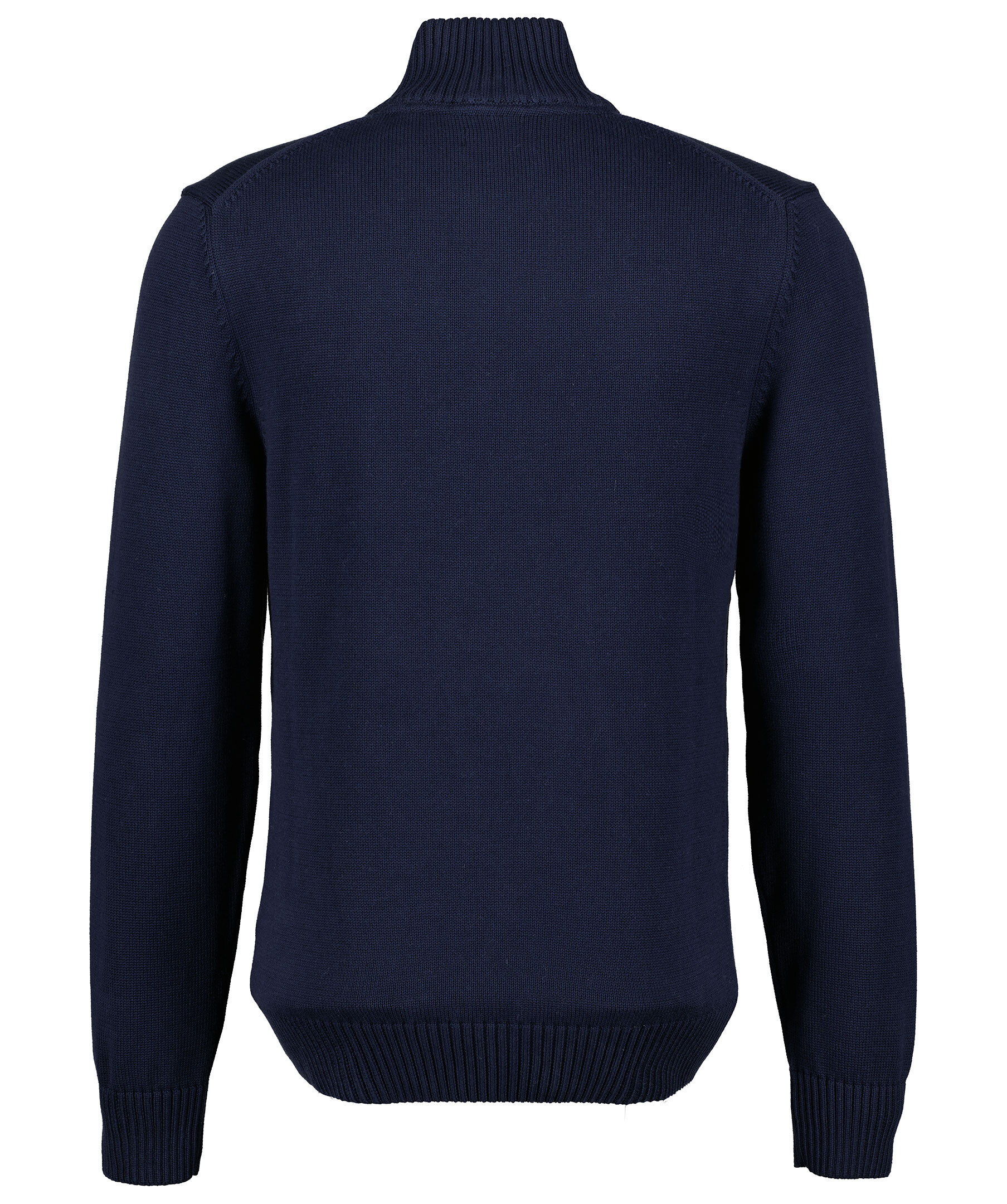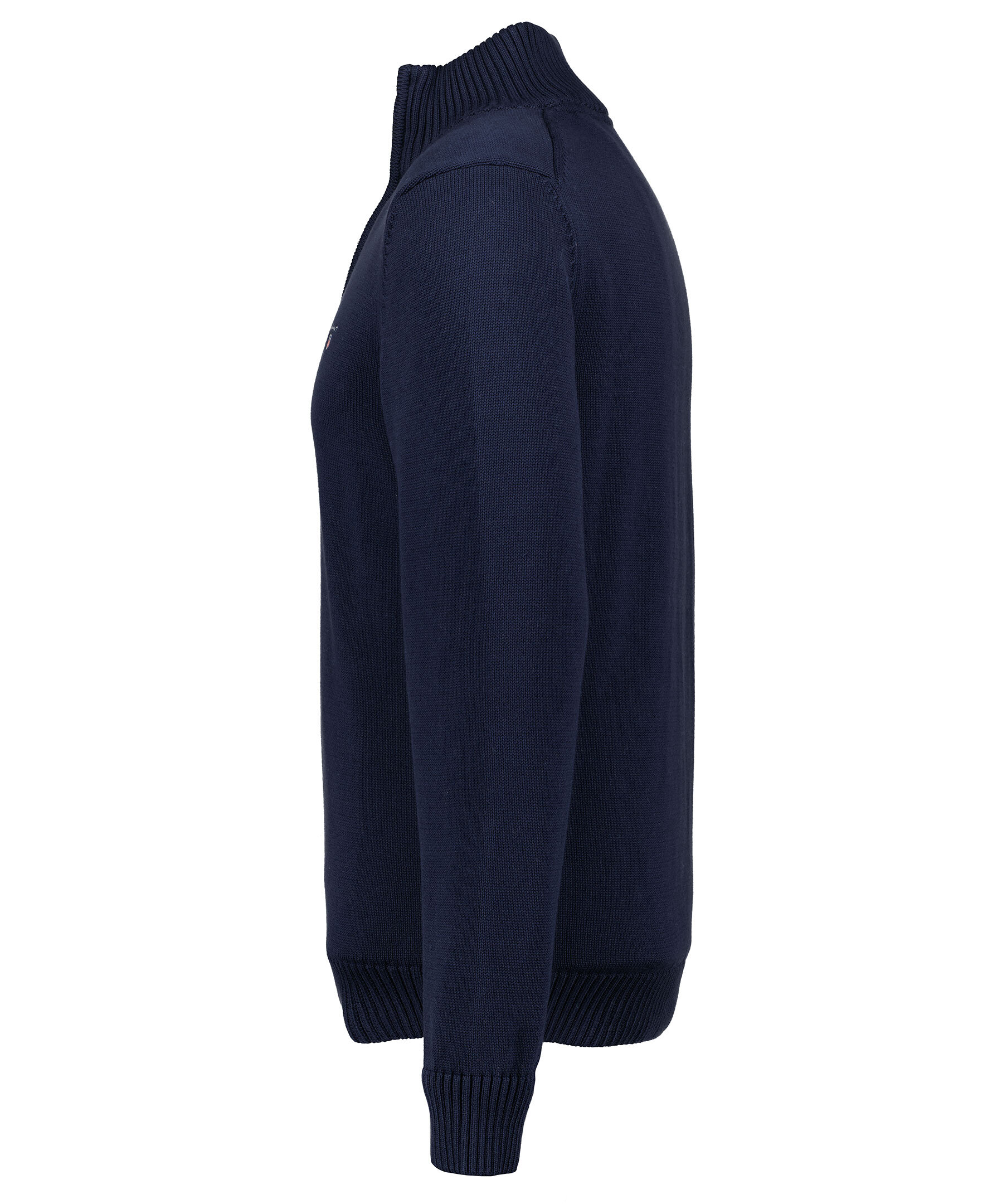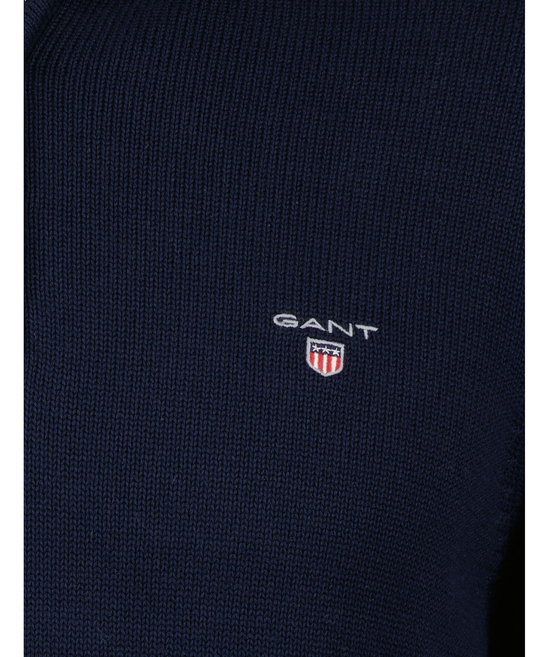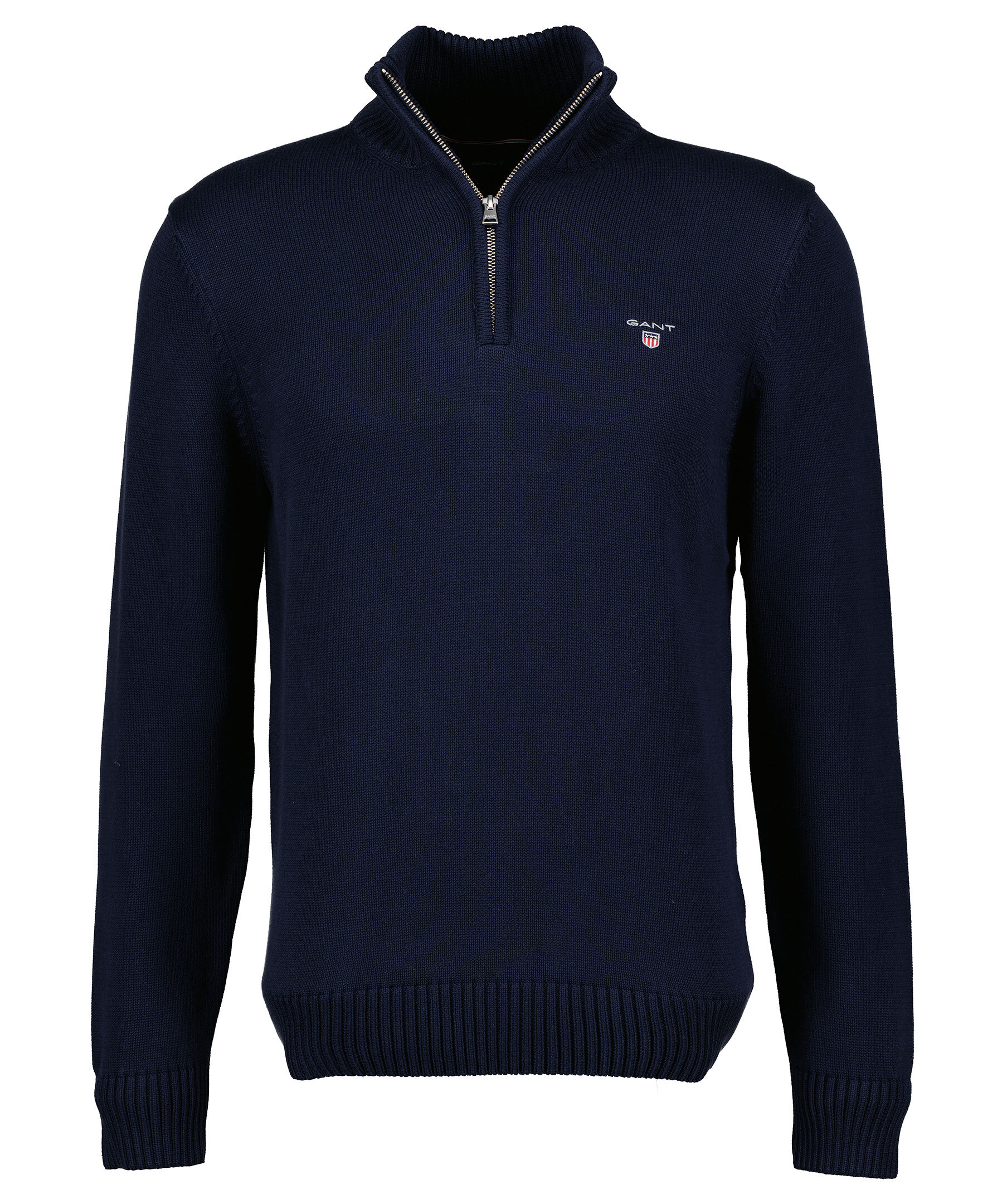 Marinblå finstickad tröja från Gant. Hög krage med halvzip, broderad logga på bröstet, stickade muddar. Tillverkad i 100% bomull.