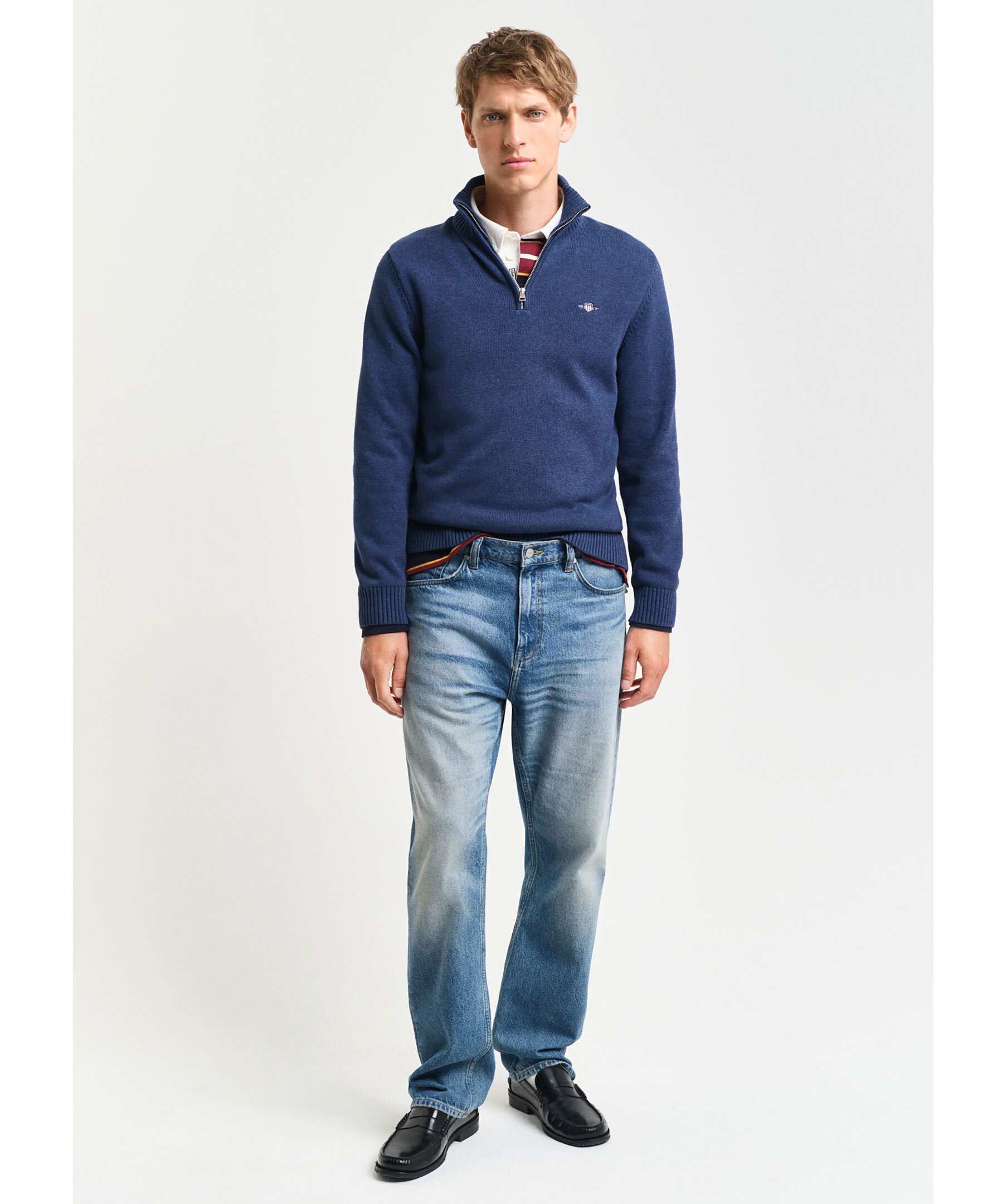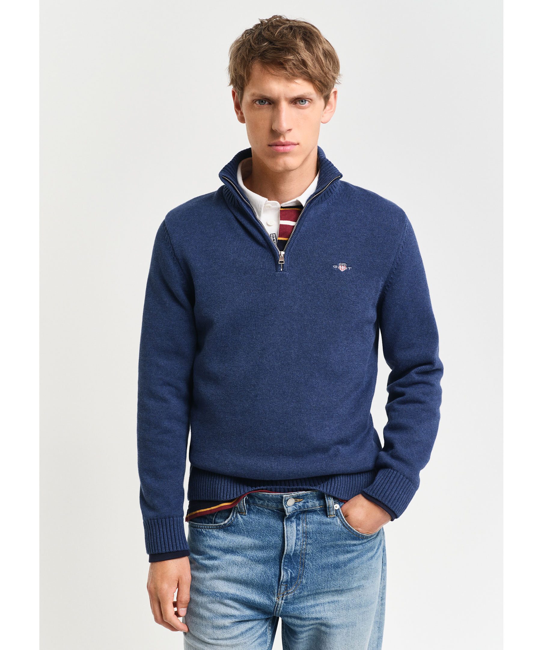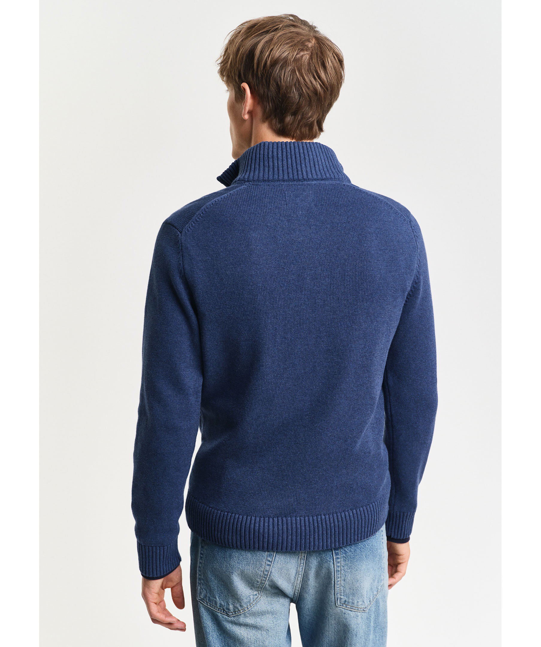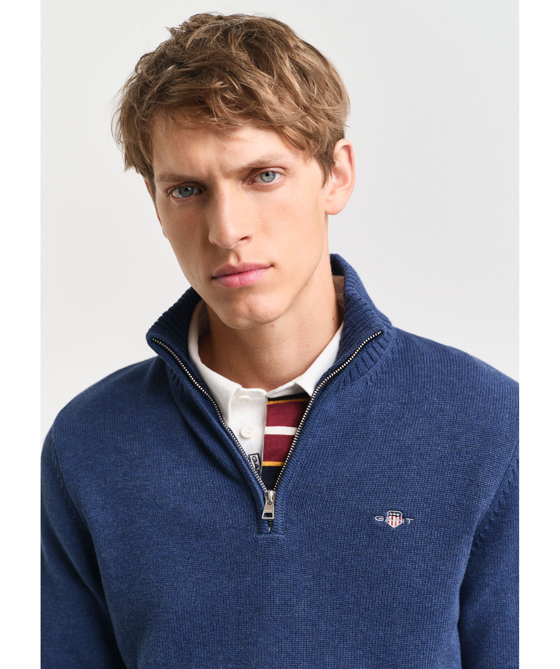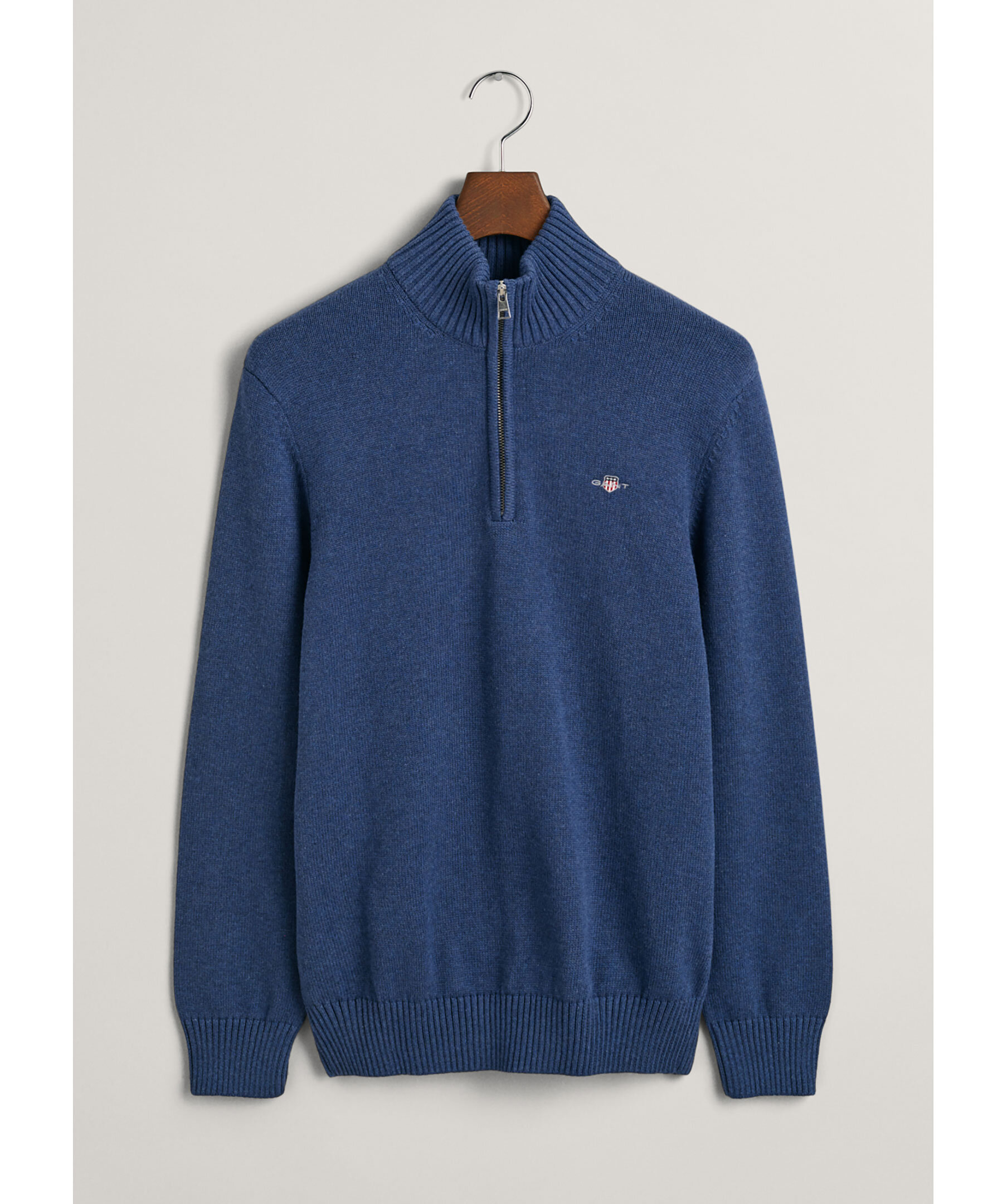 Blå, stickad tröja med krage och halv dragkedja i mellantjock bomull från Gant. Tröjan har, ribbstickade muddar och deras sköldlogotyp broderad på bröstet. Den är ett värmande stillager som du snyggt stylar med jeans eller välskurna byxor. Tillverkad i 100% bomull.