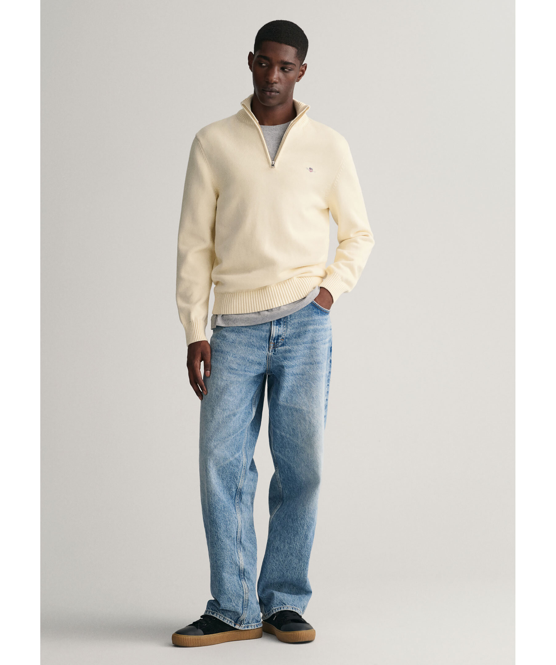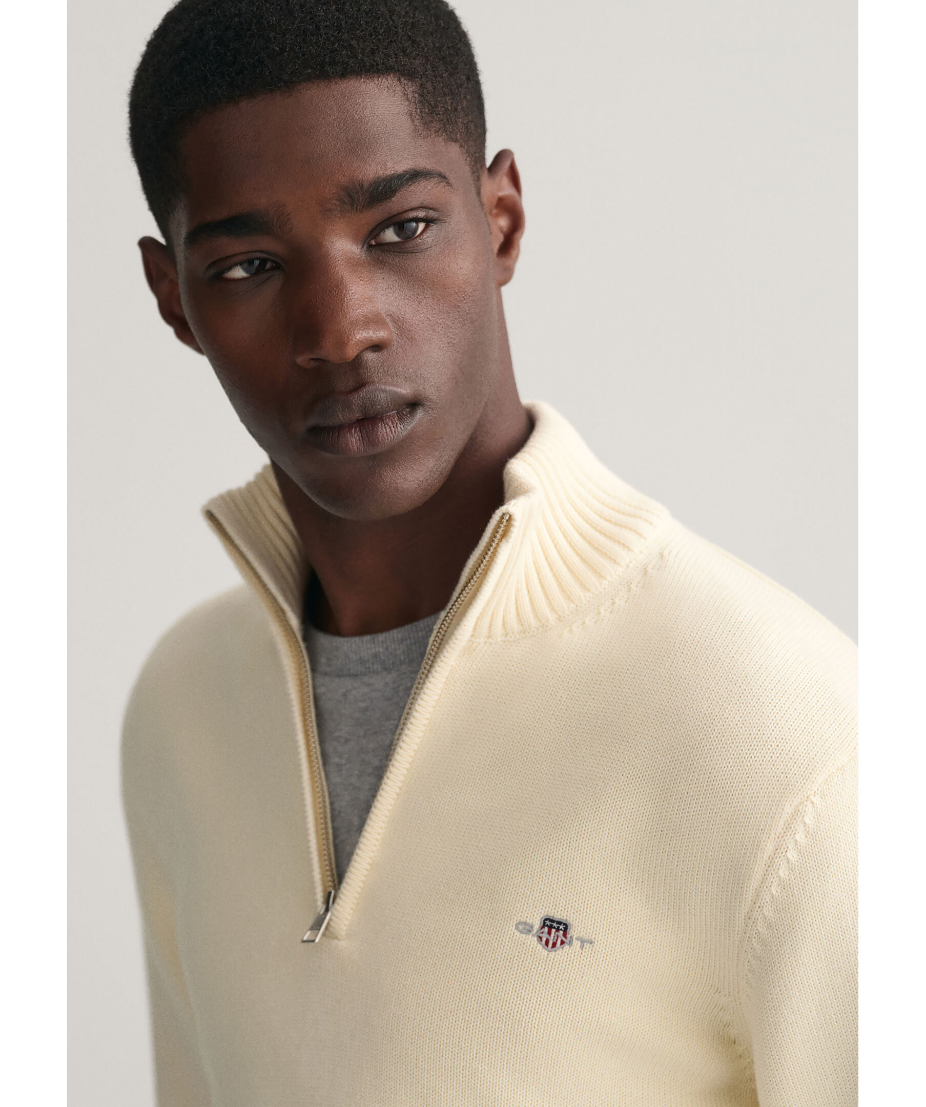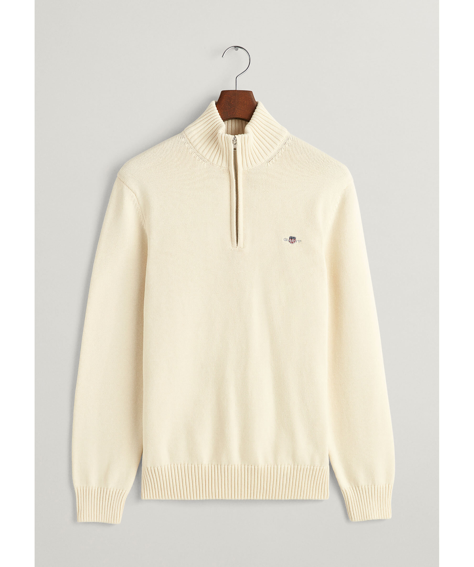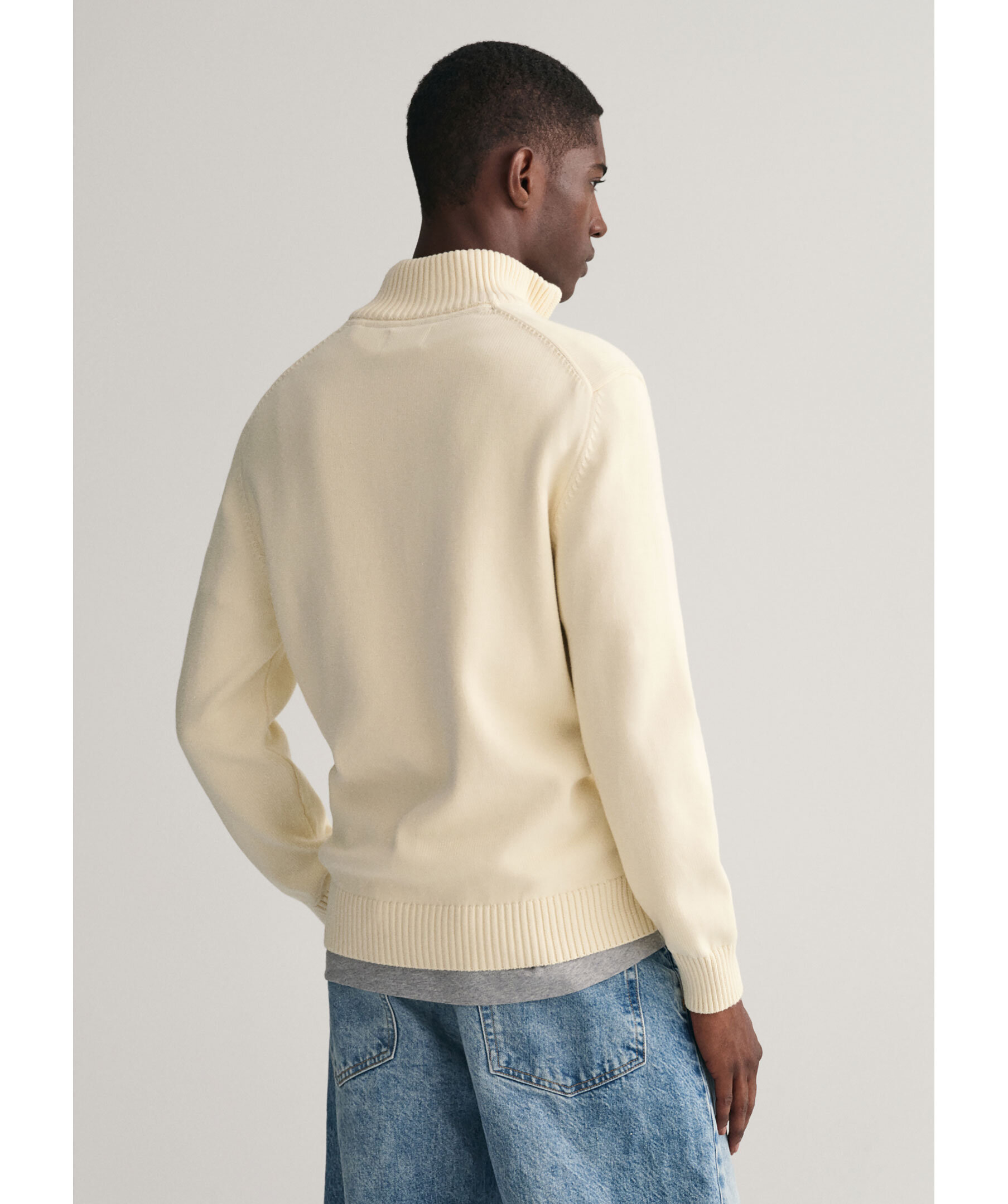 Krämvit stickad tröja med krage och halv dragkedja i mellantjock bomull från Gant. Tröjan har ribbstickade muddar och deras sköldlogotyp broderad på bröstet. Den är ett värmande stillager som du snyggt stylar med jeans eller välskurna byxor. Tillverkad i 100% bomull.