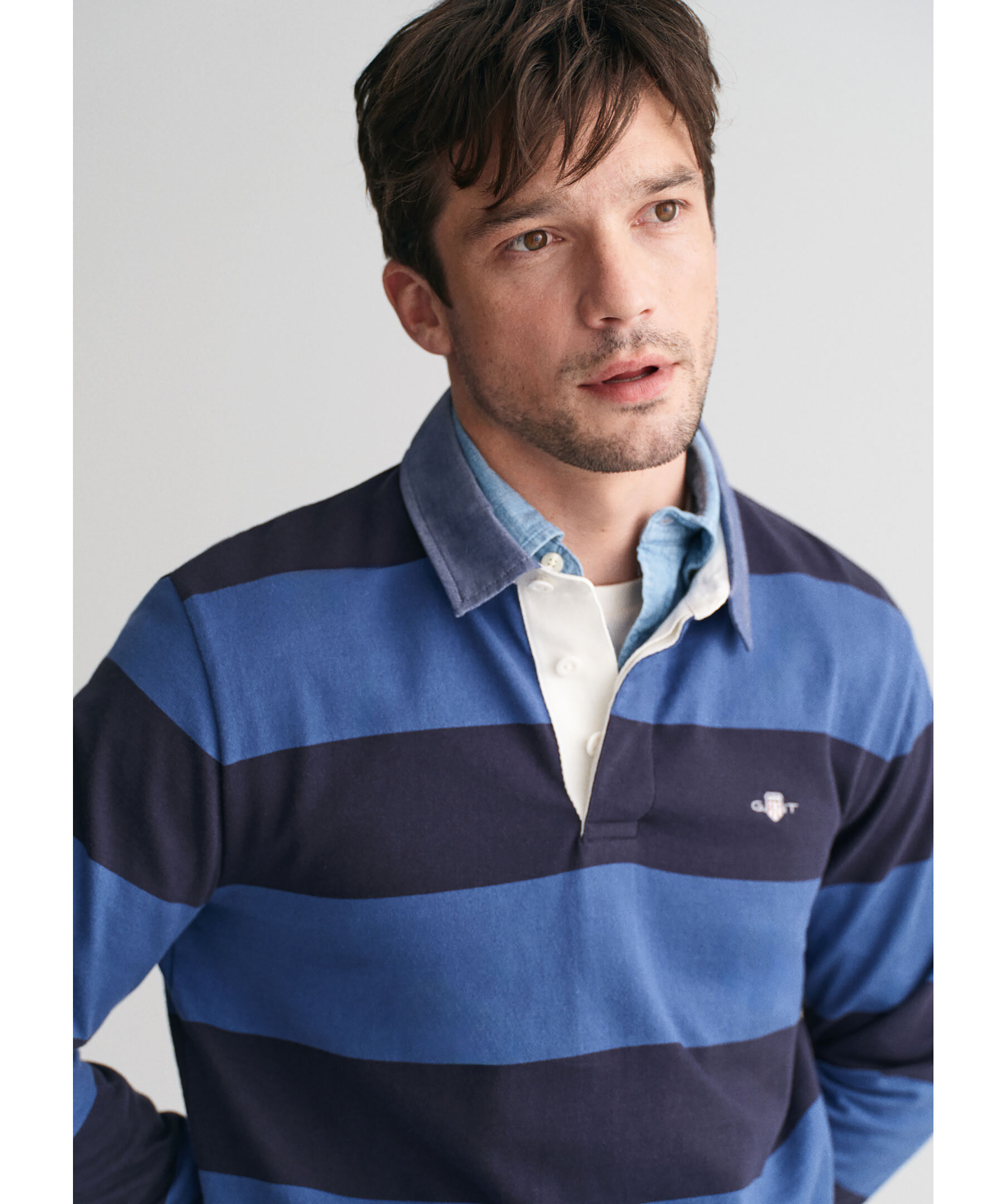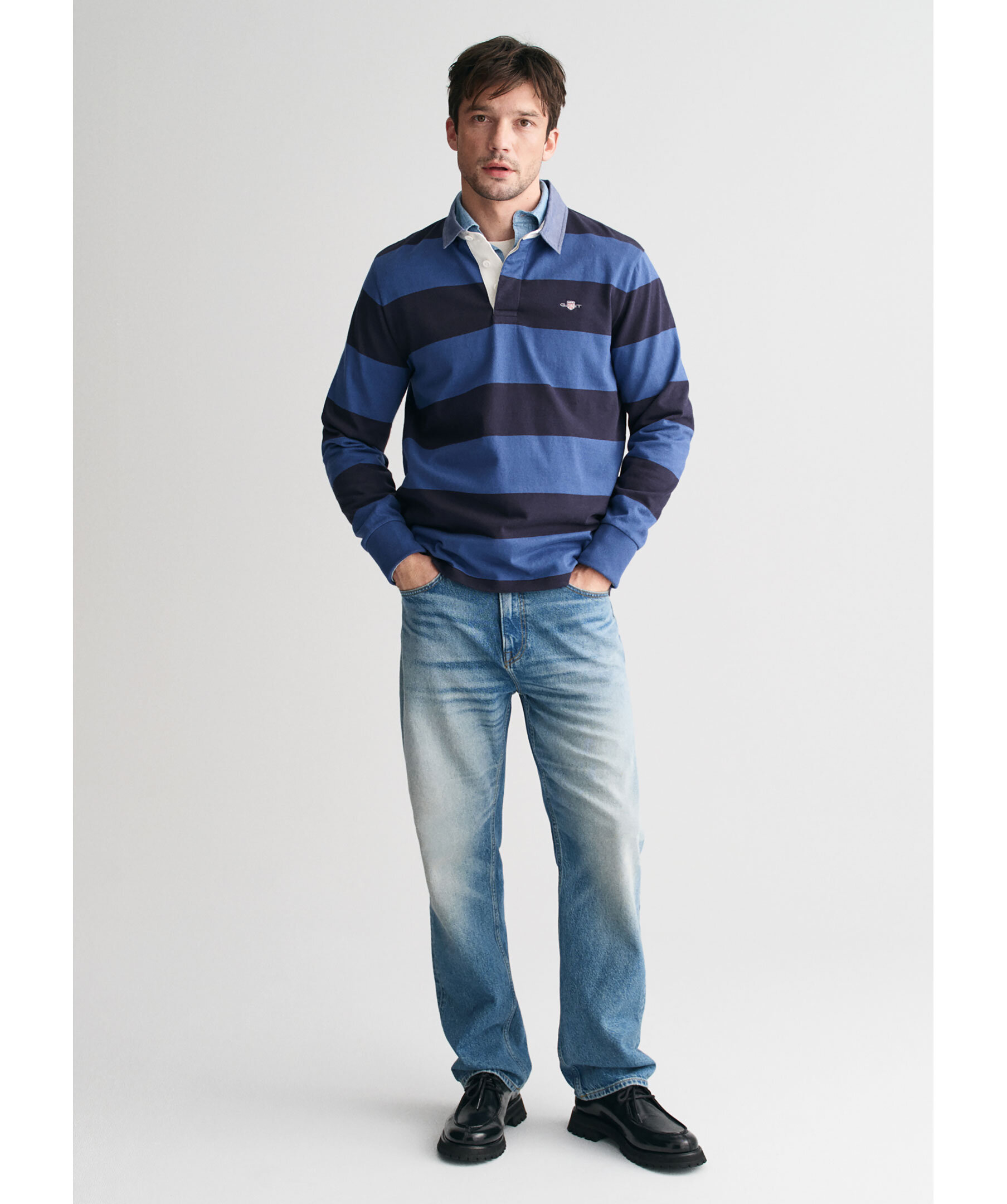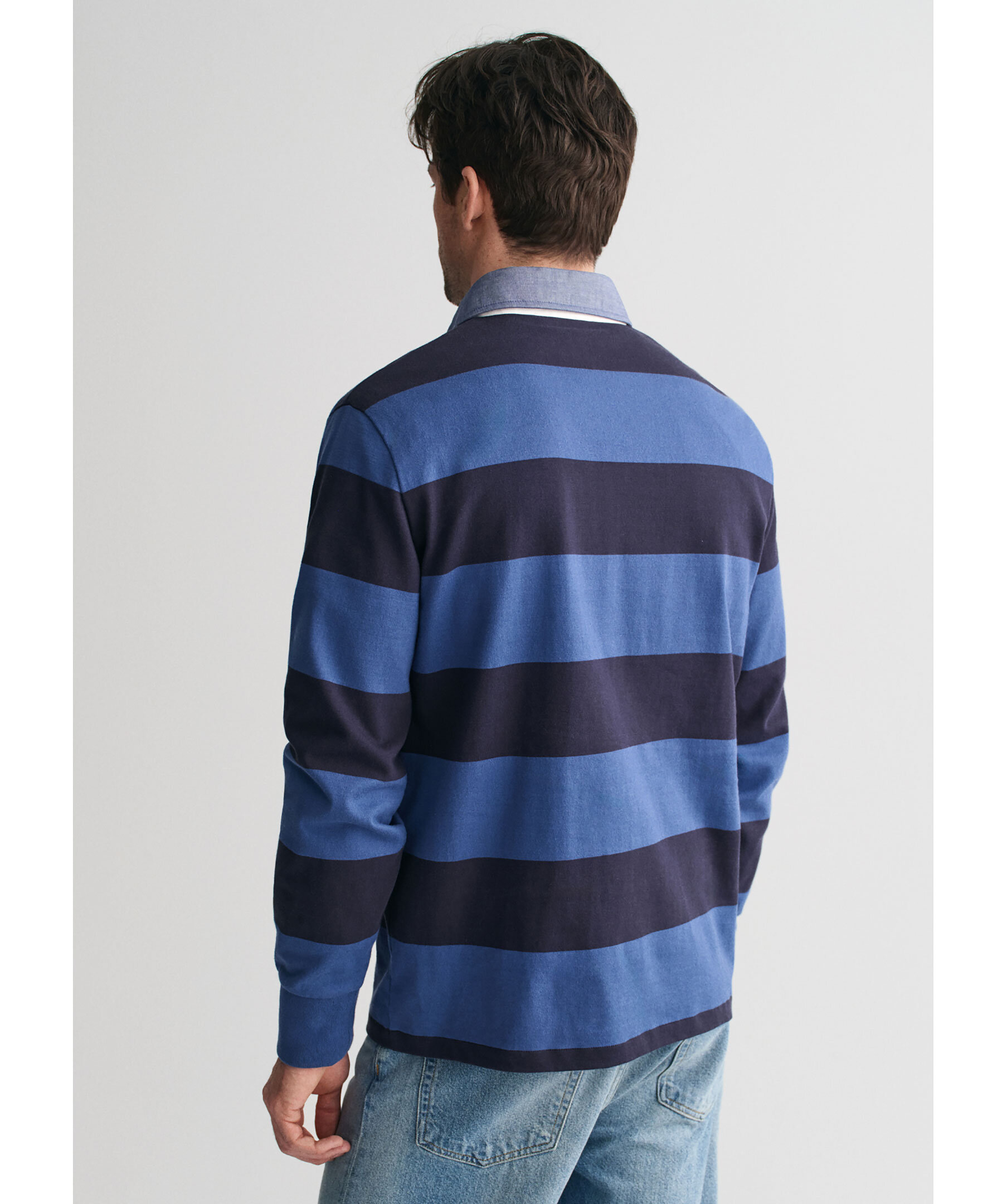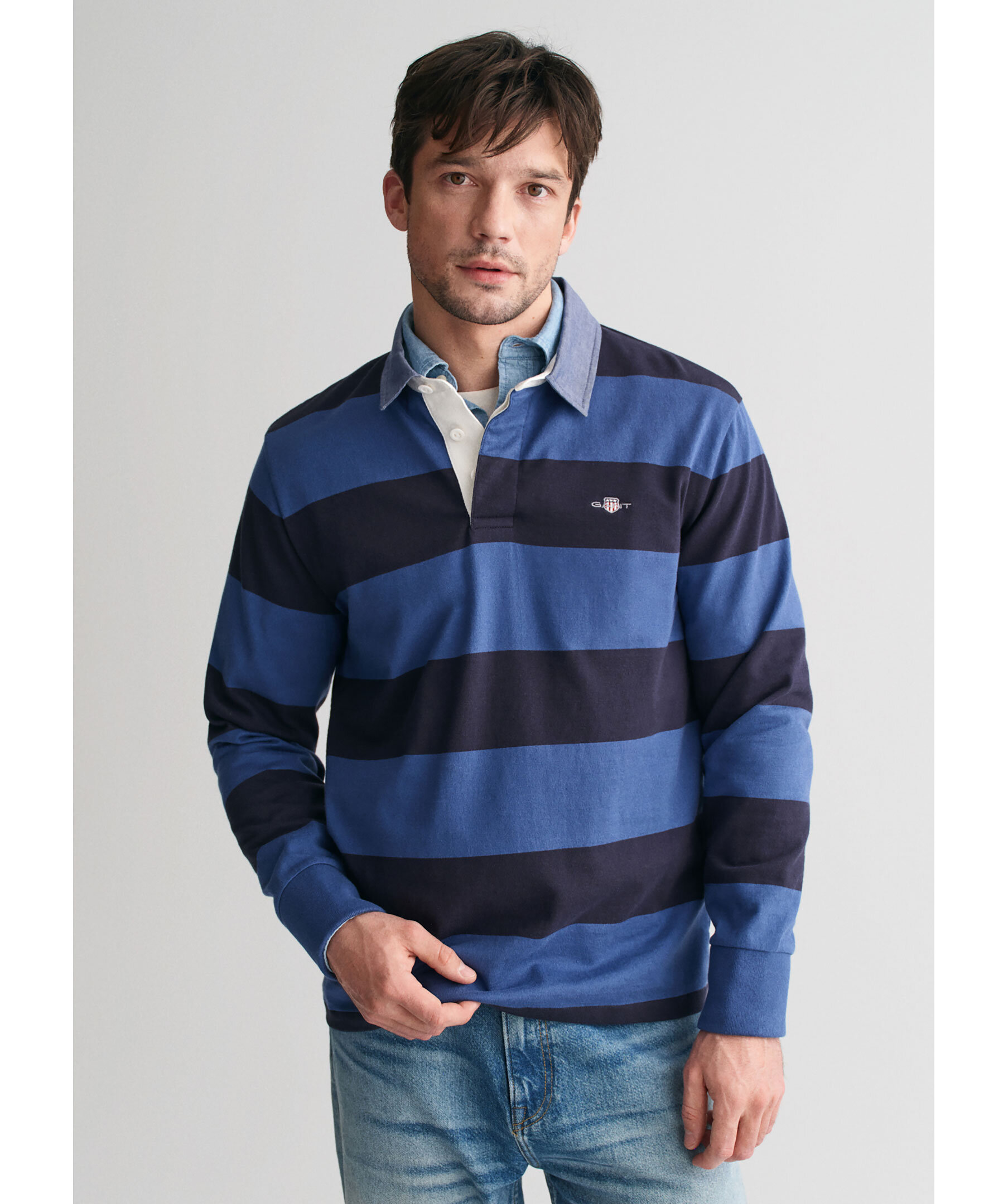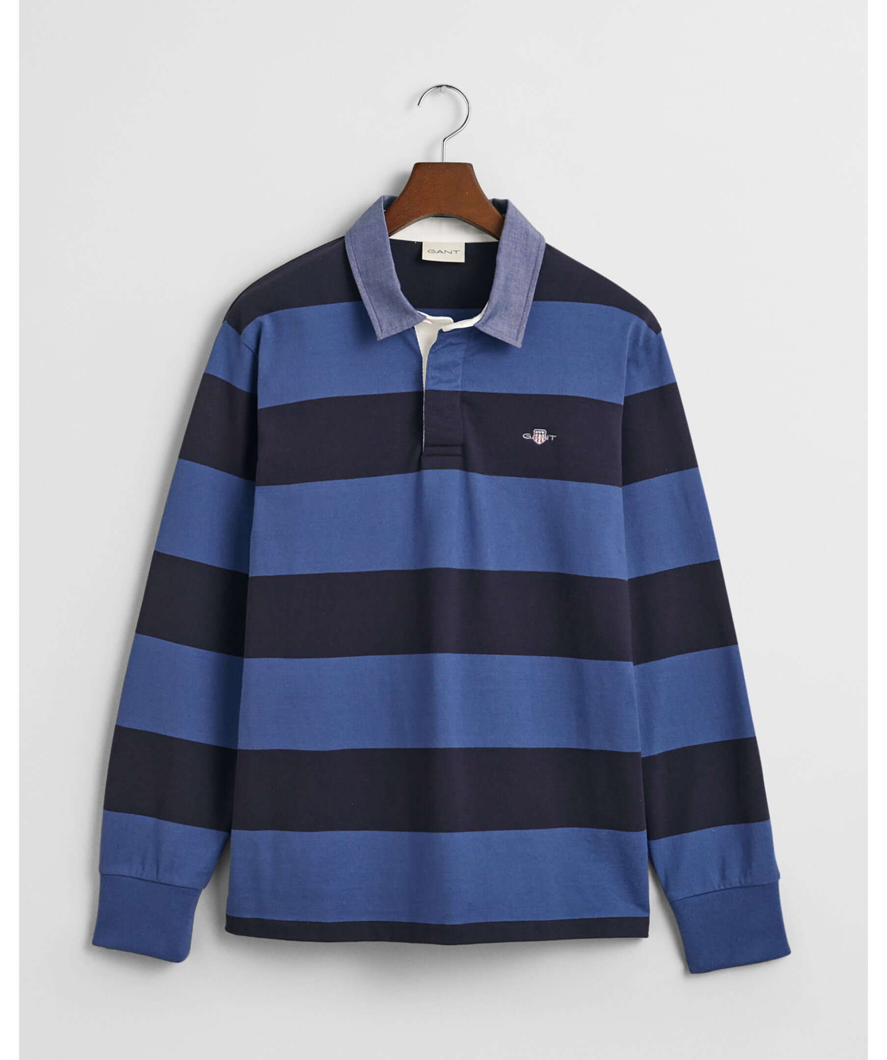 Blå och mörkblårandig rugbytröja från Gant. Tröjan har twillkrage och klassisk knappslå med tre knappar samt liten broderad logotyp på bröstet. Tillverkad i bomull.