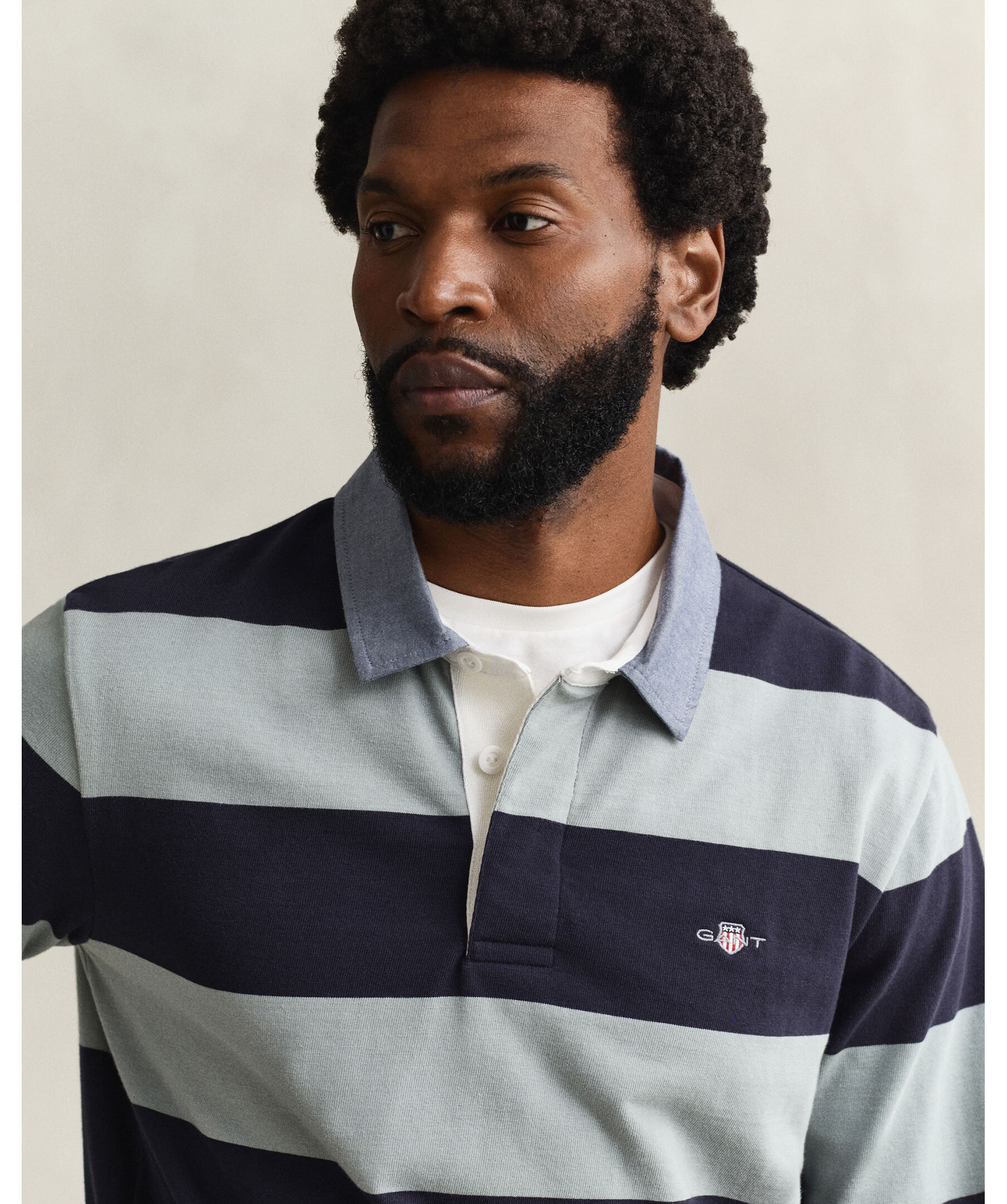 Randig rugbytröja som är tillverkad i 100 % bomull med en regular fit. Den har en chambraykrage, klassisk treknäppning och ett litet broderat sköldemblem på bröstet för en tidlös look.