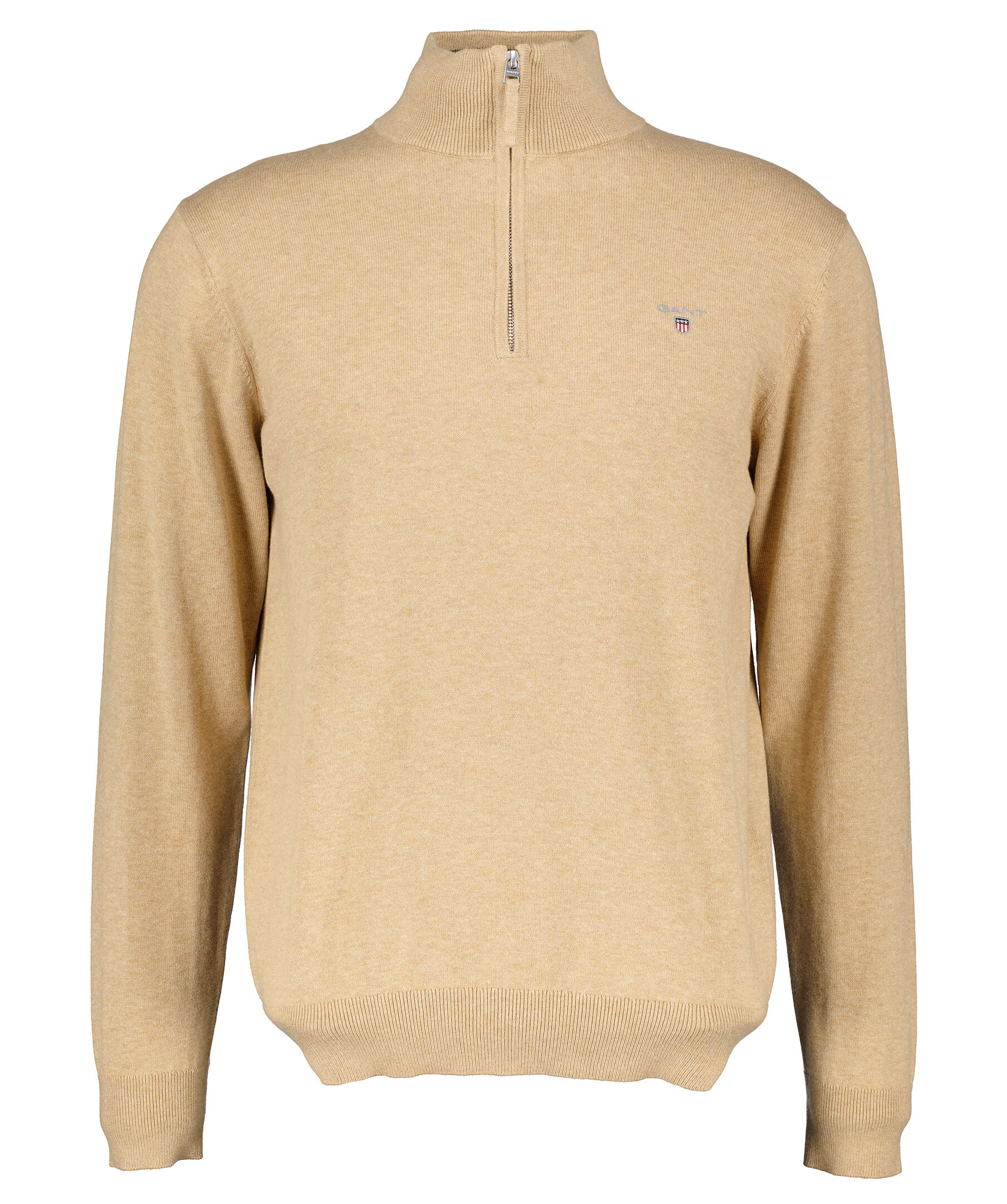 Beige half zip tröja från Gant. Tillverkad i 100% finstickad bomull. Ribbade muddar, hög krage med dragkedja, normal passform och broderad logotyp på bröstet.