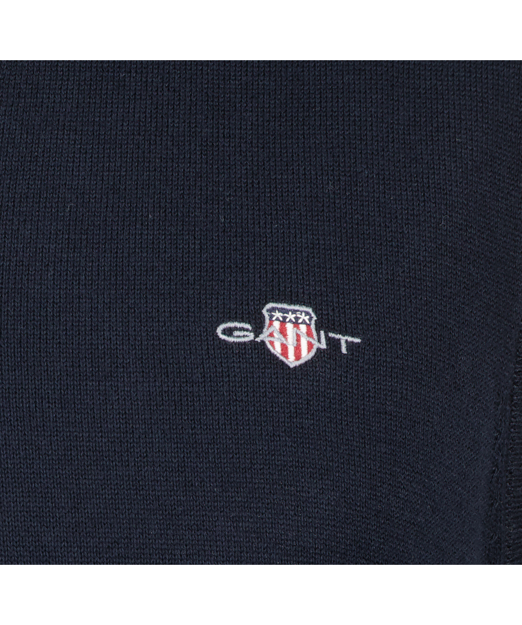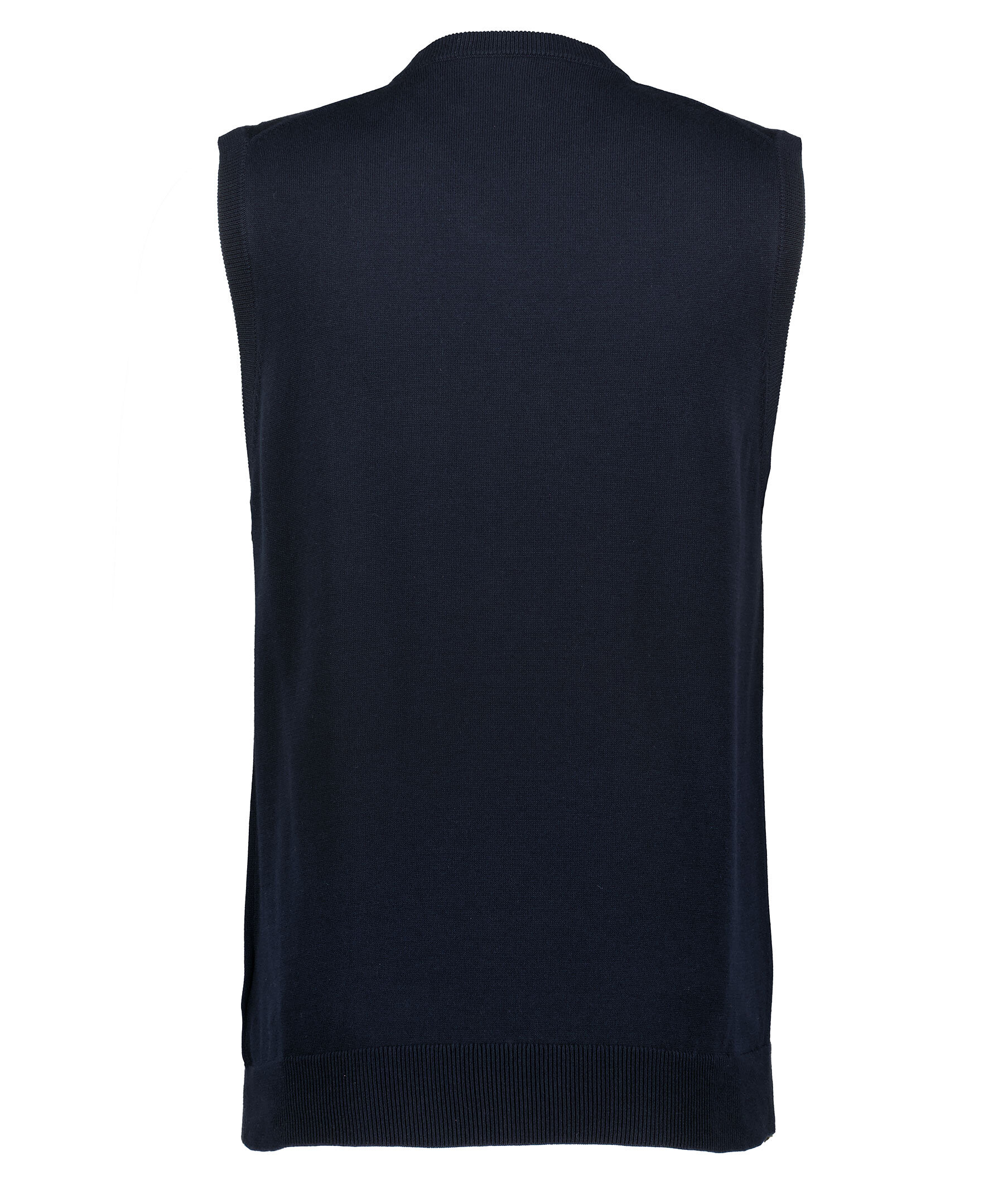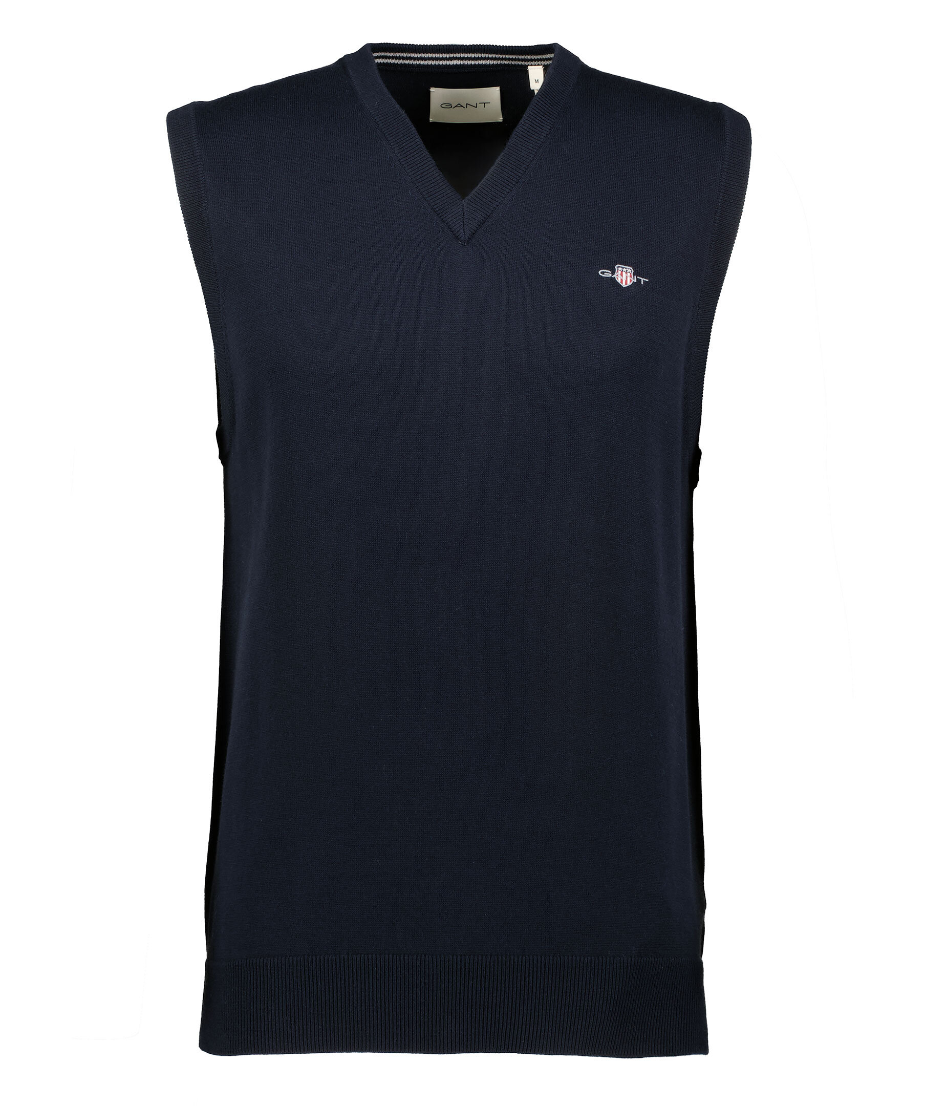 Marinblå klassisk och mångsidig slipover väst i bomull med en normal passform från Gant. Den har ribbstickad fåll, klassisk V-ringning och en liten sköldlogotyp broderad på bröstet. Styla med en skjorta och välskurna byxor eller en T-shirt och jeans för en äkta tidlös stil.