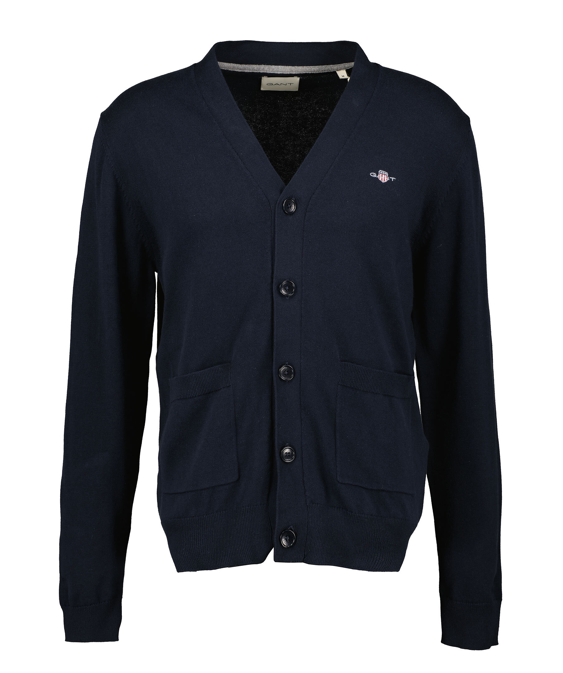 Marinblå, klassisk och mångsidig cardigan i bomull med V-ringning och normal passform från Gant. Den har detaljer som ribbstickade muddar, corozoknappar med logotyp, två fickor och en liten GANT-sköld broderad på bröstet. Bär över en skjorta med välskurna byxor och en elegant sko för en tidlös stil.