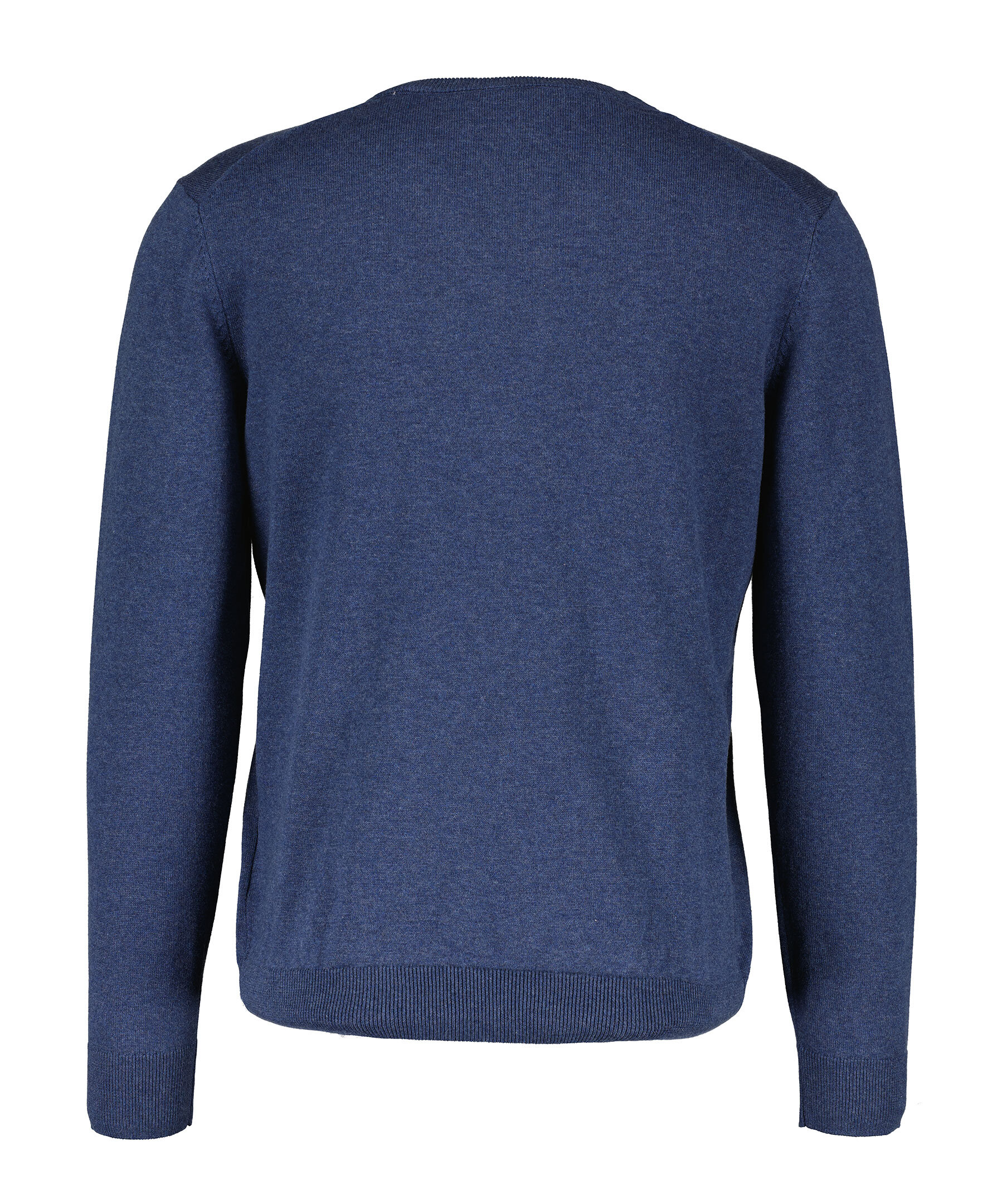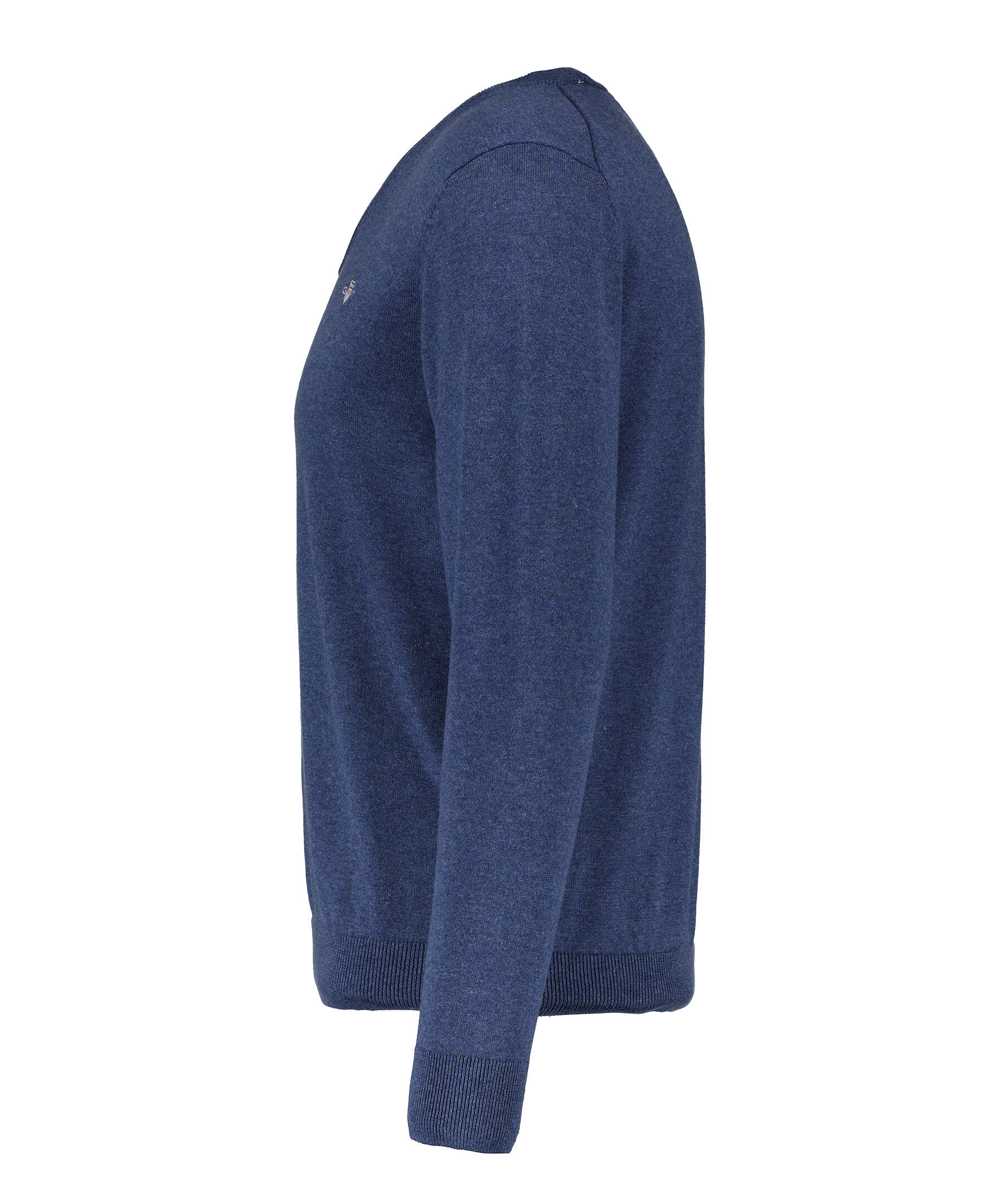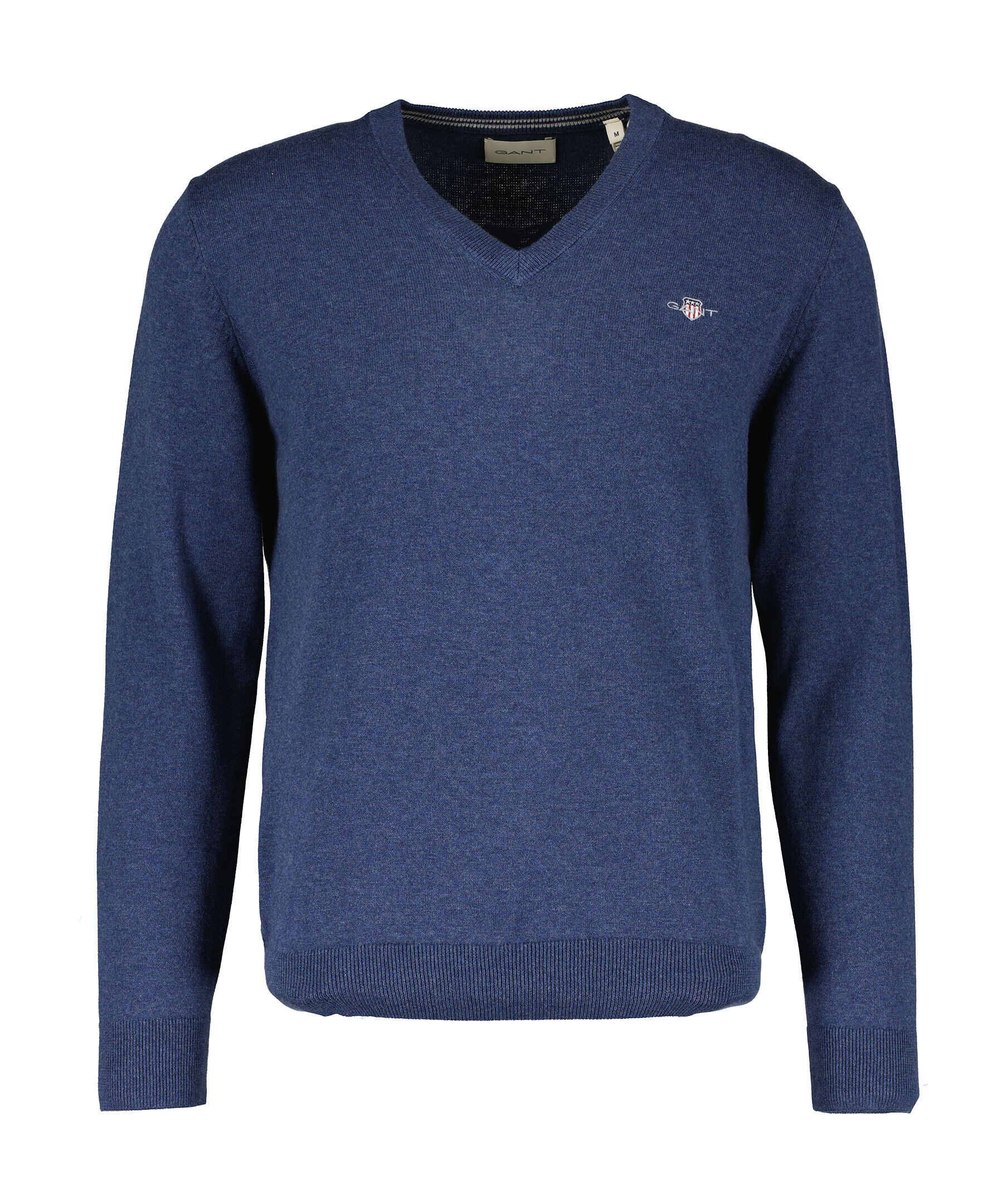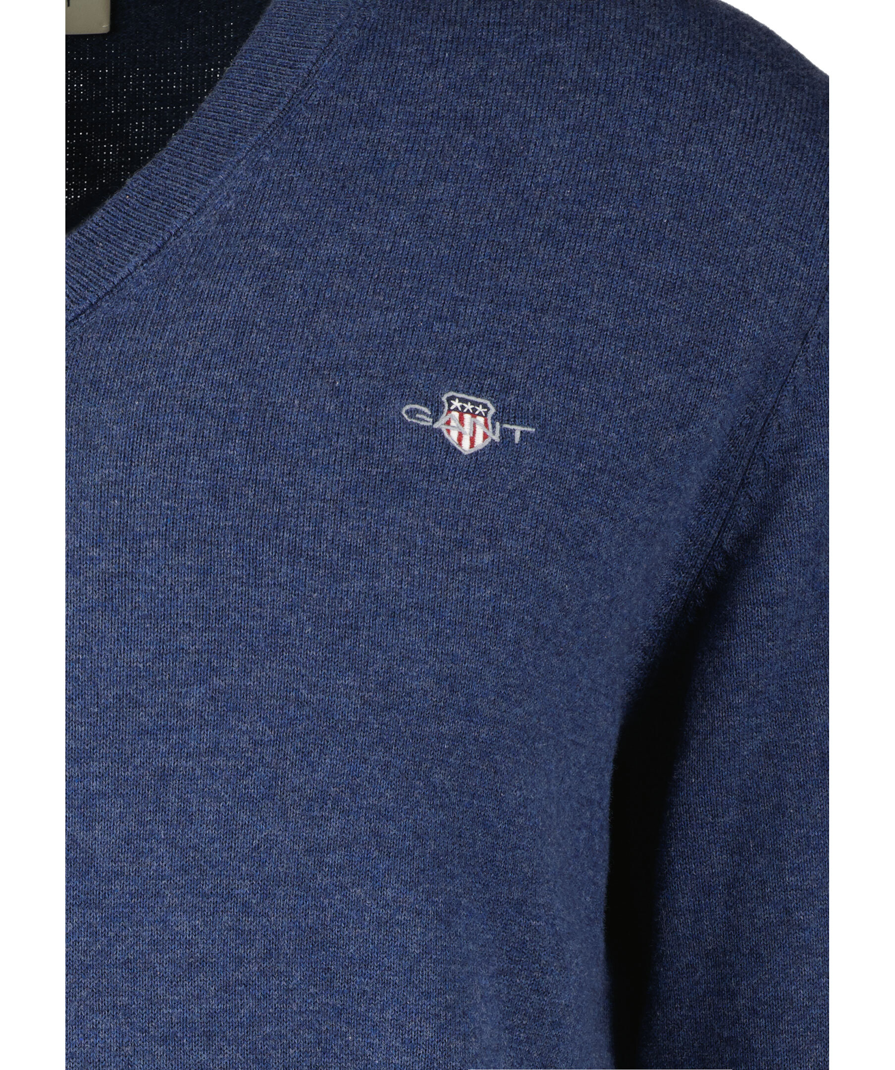 Blå, finstickad V-ringad tröja från Gant. Tillverkad i 100% bomull. Broderad GANT-logotyp på bröstet. Ribbstickade muddar. Normal passform.