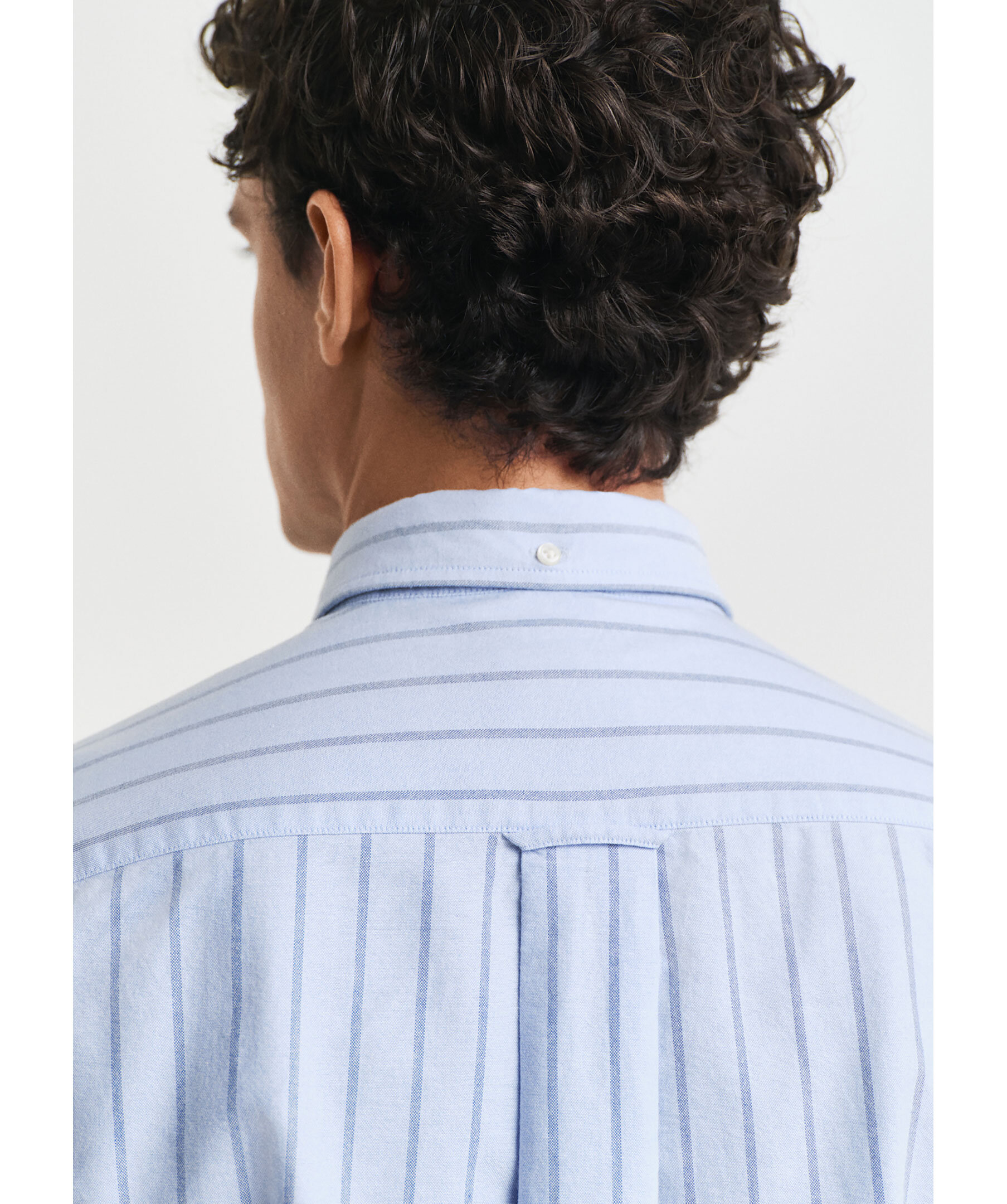 Blå, randig oxfordskjorta från Gant. Skjortan har button-down krage, en bröstficka med liten broderad logotyp, rundad fåll, justerbara ärmslut och boxpleat med deras klassiska locker loop i ryggen. Tillverkad i bomull.