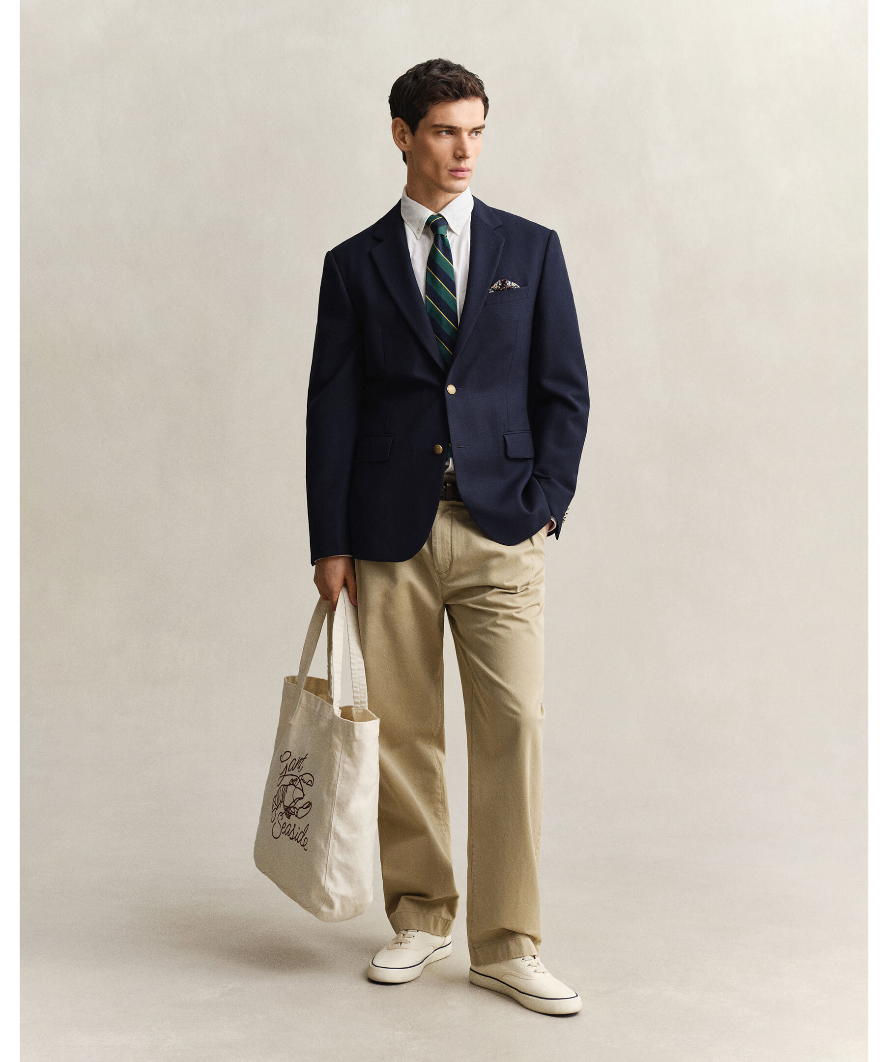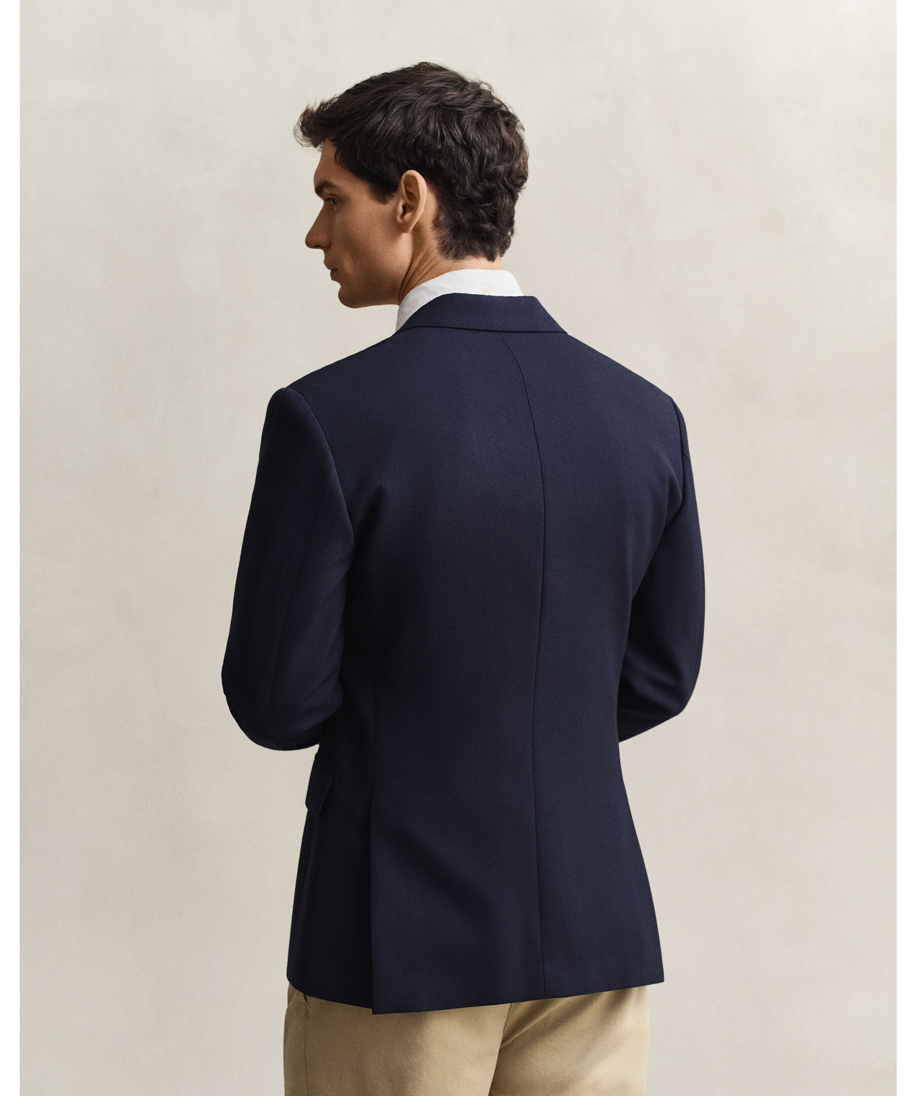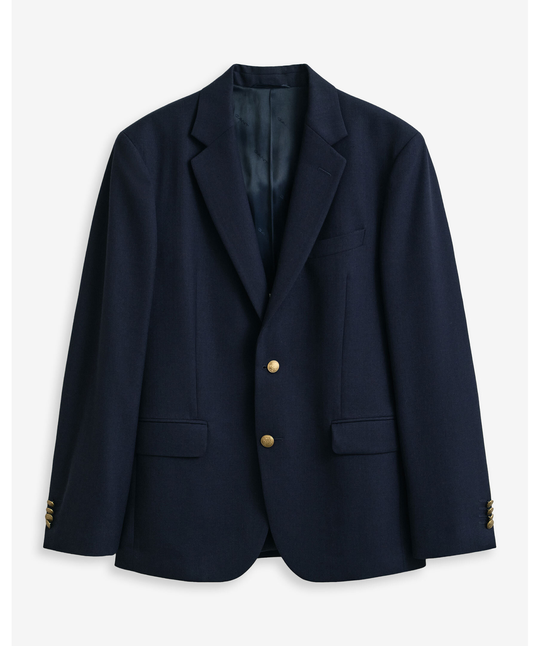 Marinblå blazer från Gant. Preppy klassiker med tidlös design. Skräddad i en smal, enkelknäppt modell som slutar strax nedanför höfterna och tillverkad i en exklusiv ullblandning med strukturerad hopsack-väv. Helfodrad och försedd med slag med skåra, fickor med lock, bröstficka, sprund baktill, filt under kragen och guldfärgade knappar med logotyp.