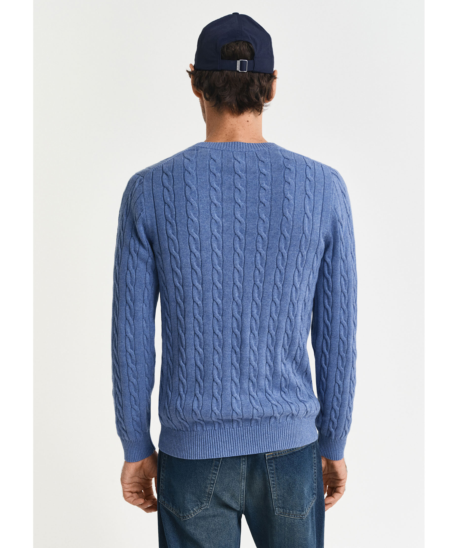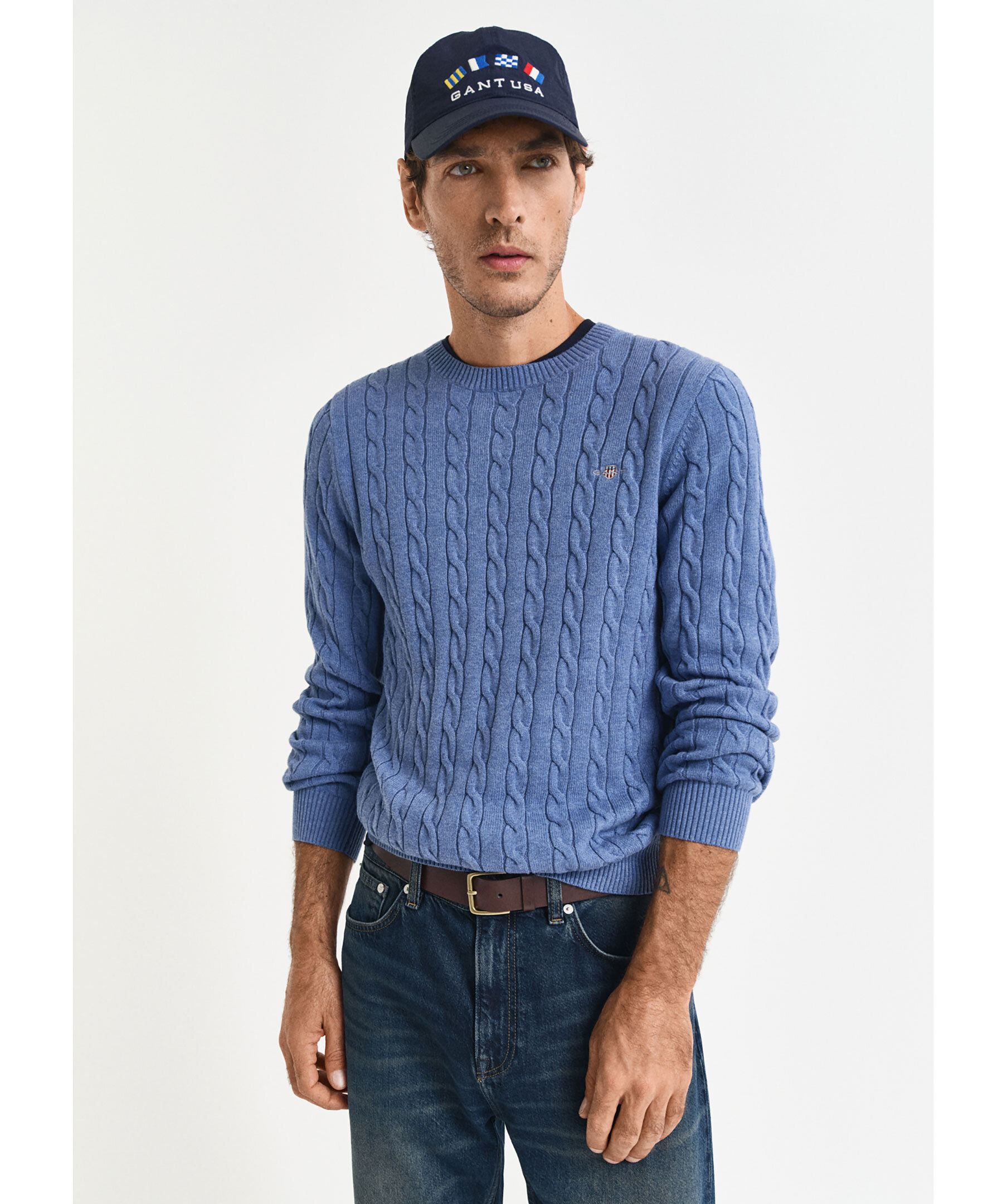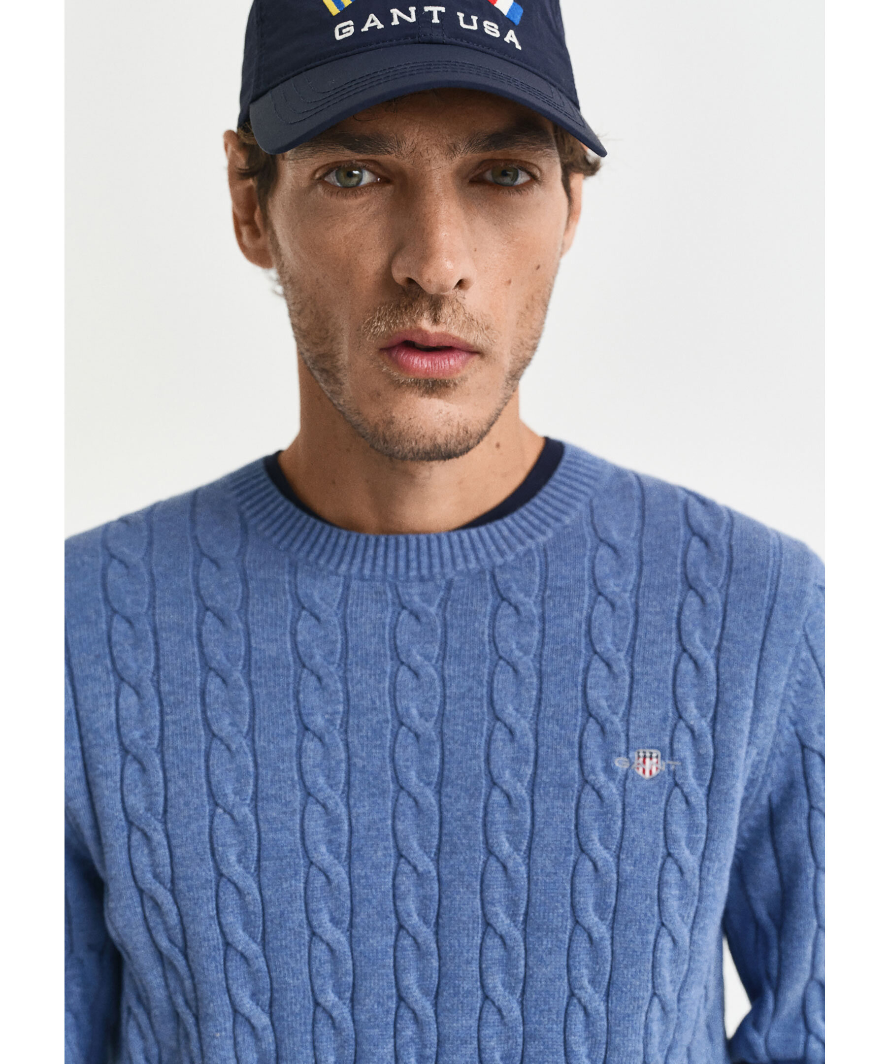Blå kabelstickad tröja från Gant. Tröjan har ribbstickad krage och ribbstickade muddar samt broderad Gant-logotyp på bröstet. Tillverkad i bomull.