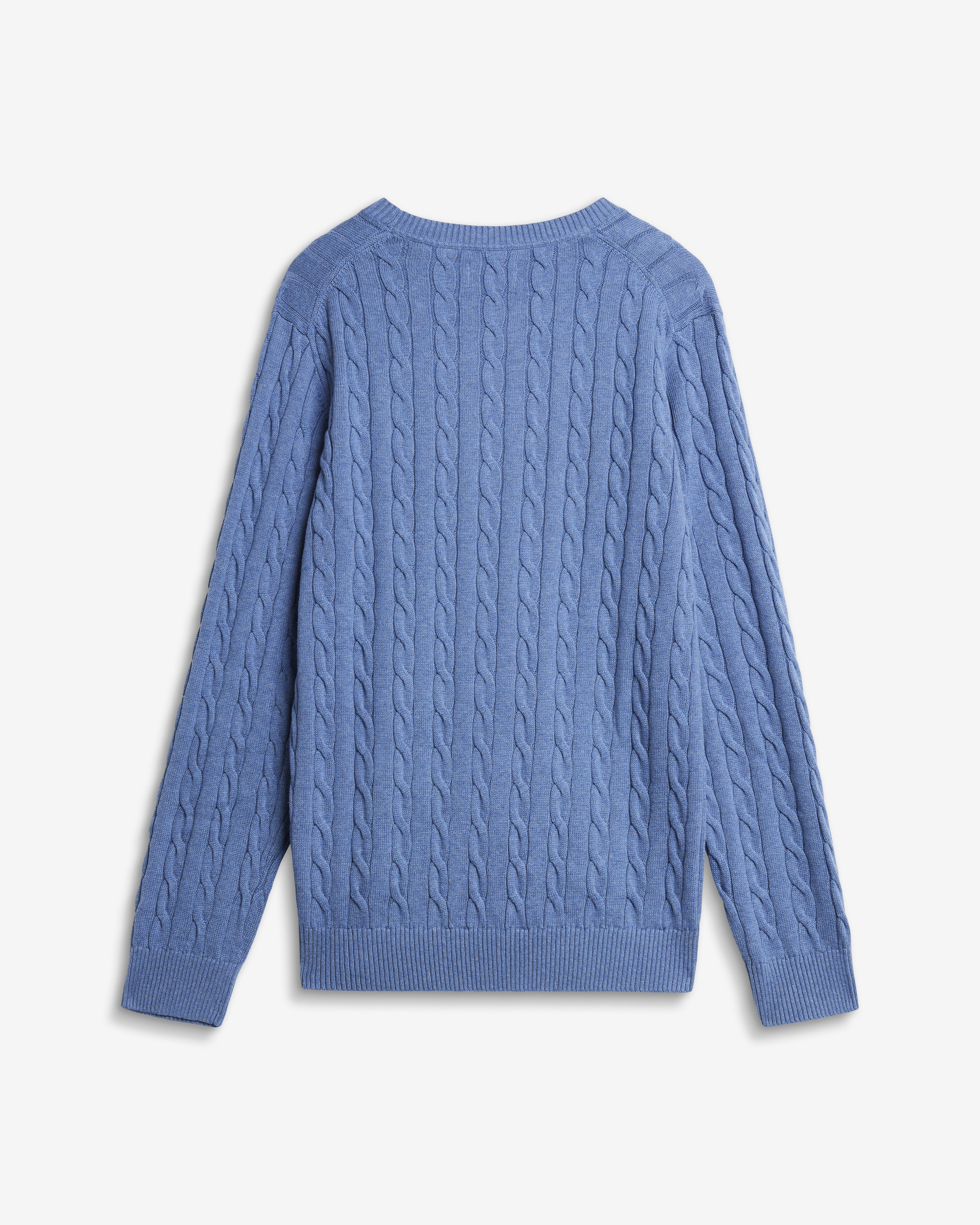 Tröja med en heltäckande kabelstickad struktur från Gant, regular fit och klassisk rund halsringning. Den är en tidlös, preppy klassiker, prydd med Gants ikoniska sköldlogo broderad på bröstet. Ribbstickade muddar vid halsen, nederkanten och ärmsluten ger en stilren finish.