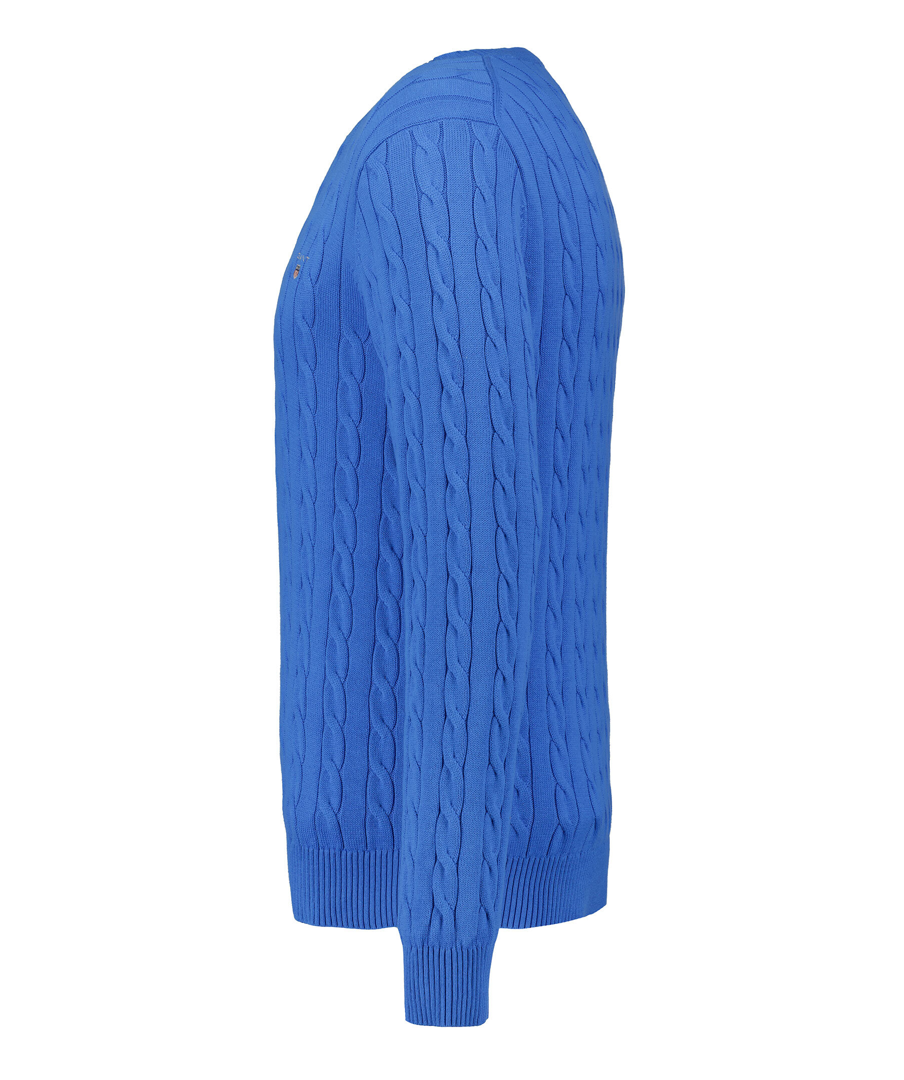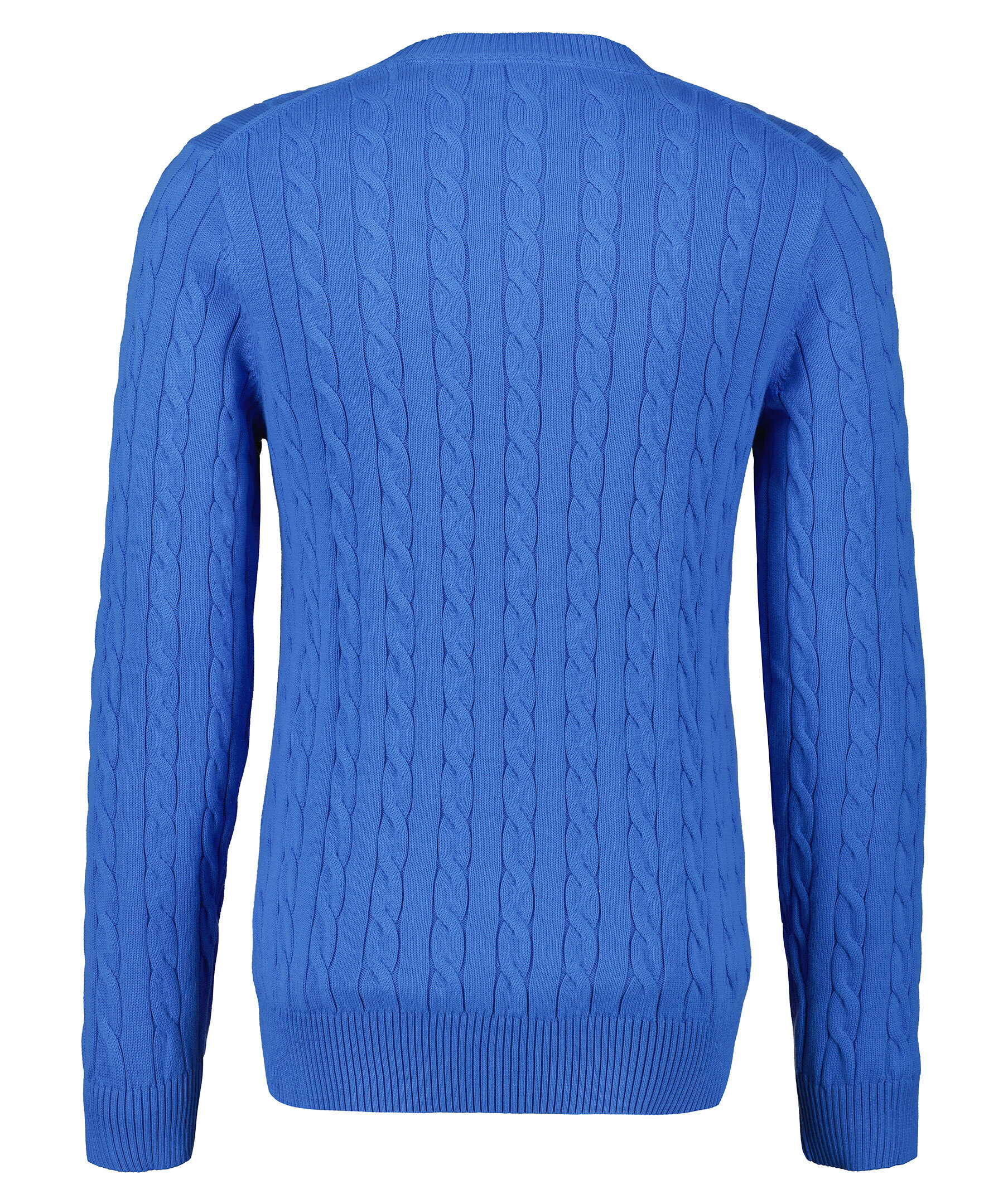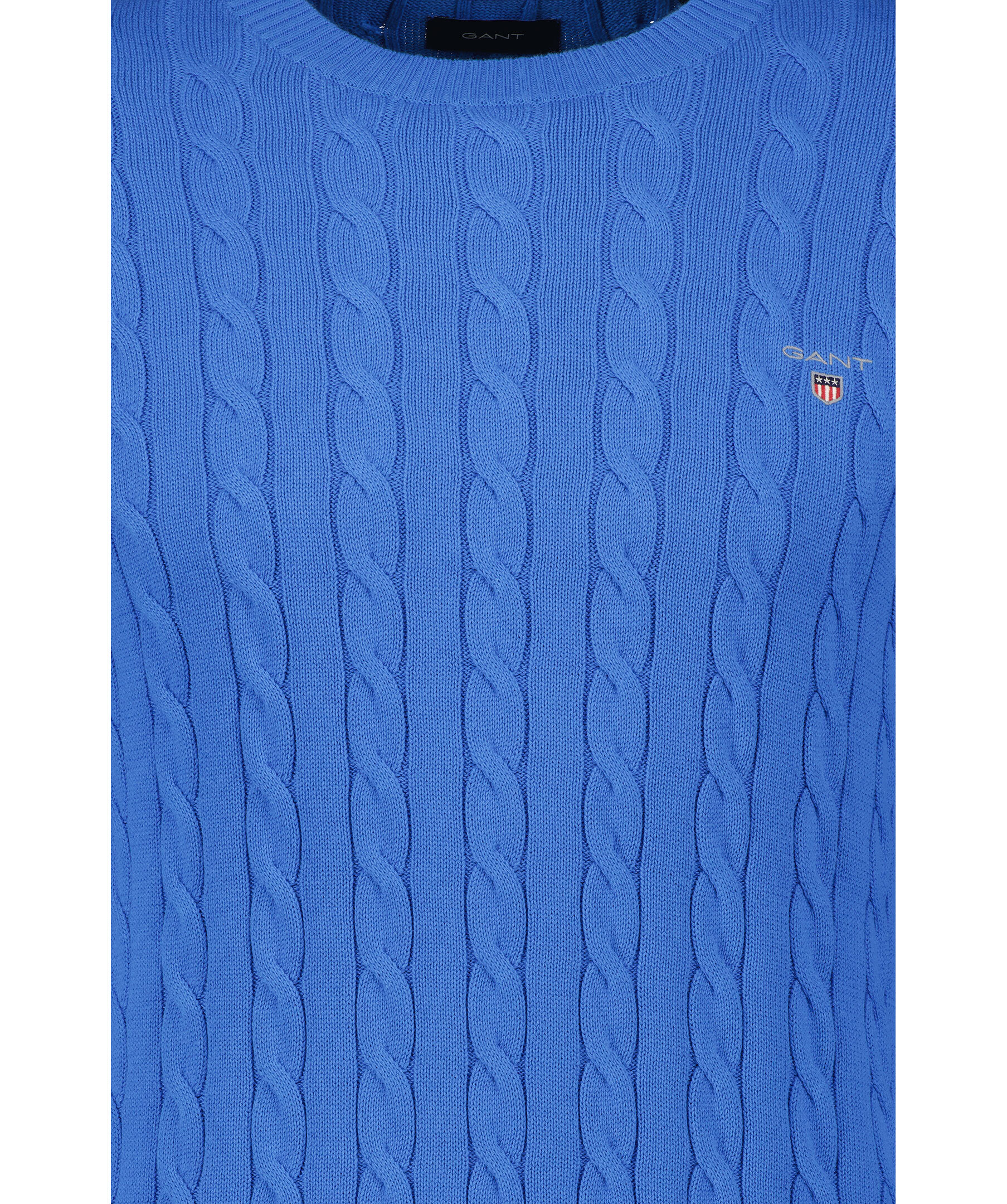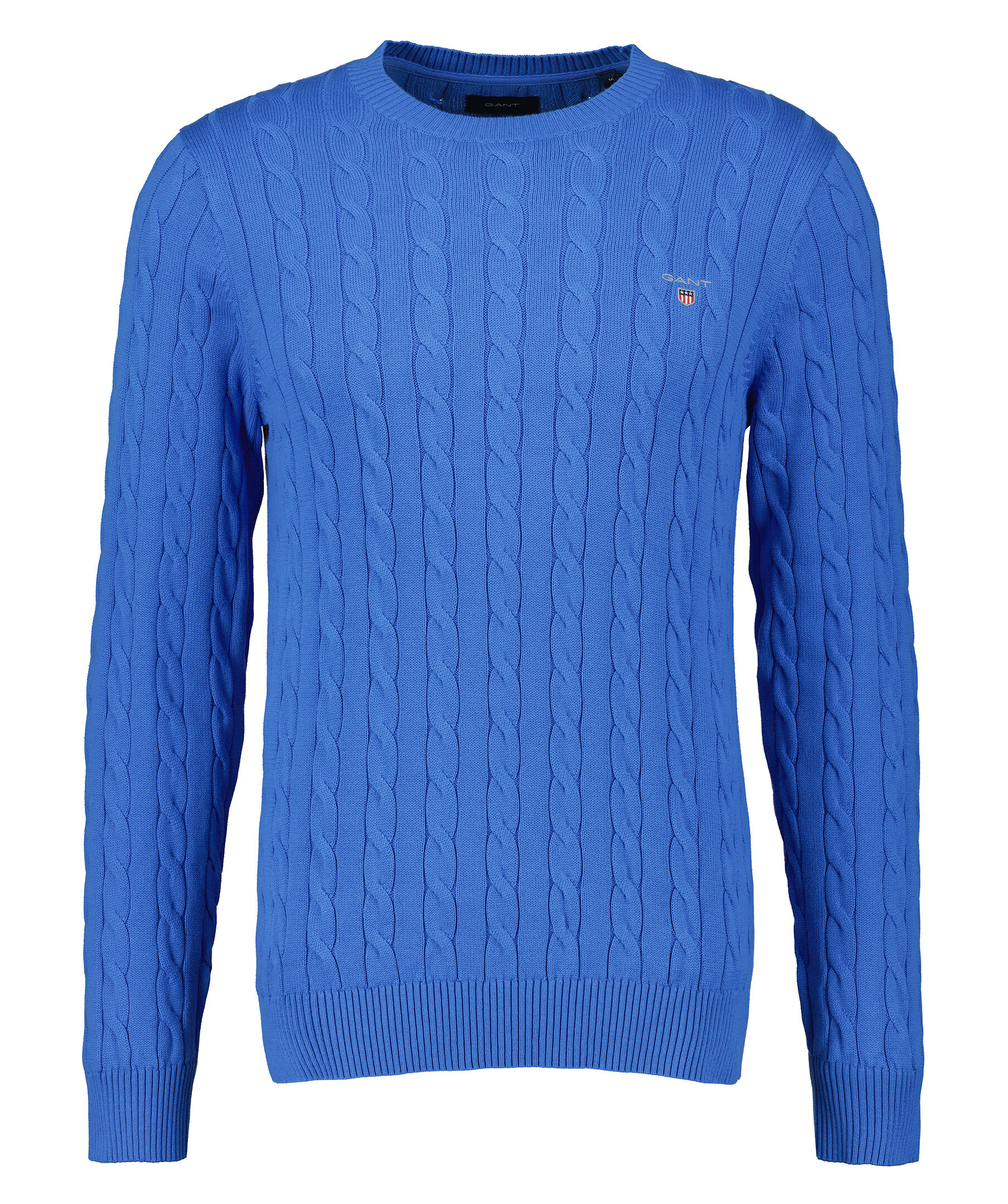 Blå kabelstickad crew neck från Gant. Tröjan har en normal passform och är gjord av 100% bomull, broderad logotyp på bröstet och ribbstickade muddar.