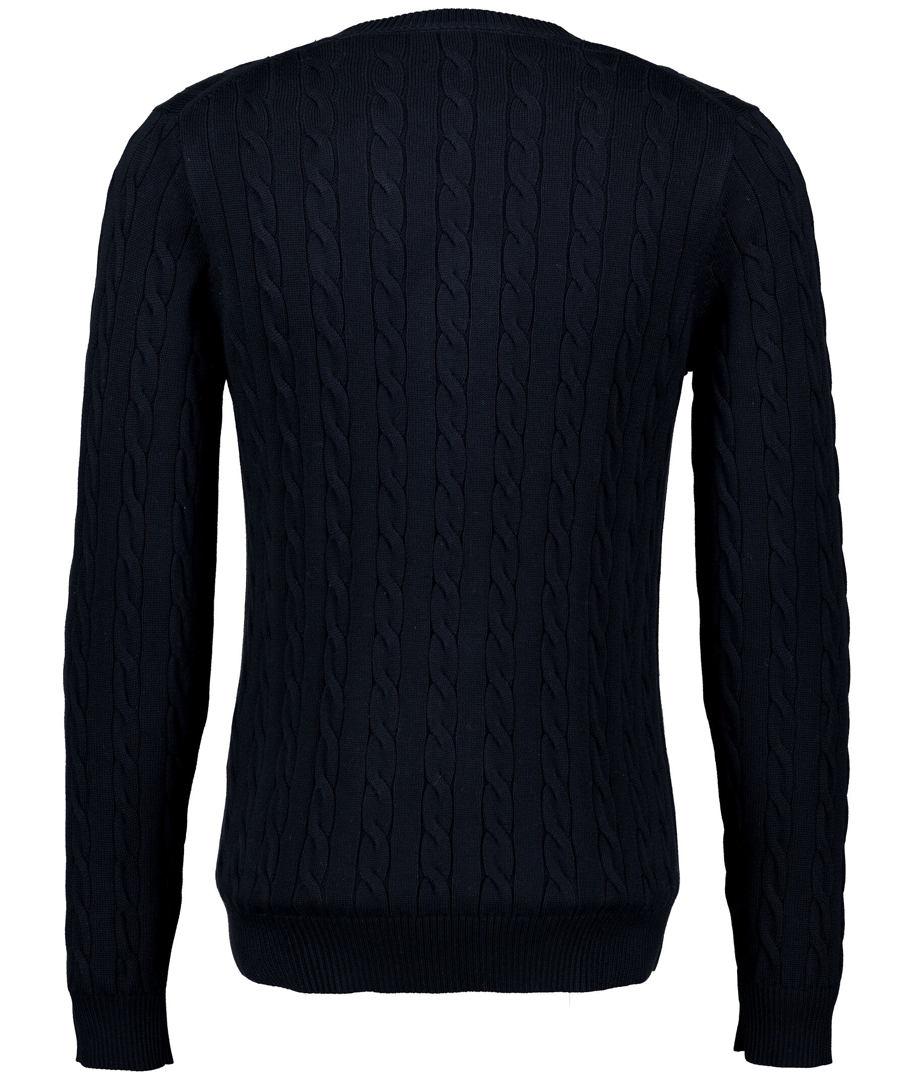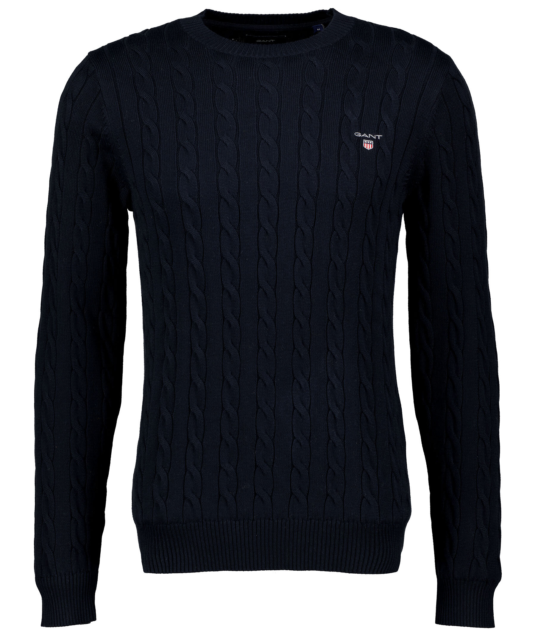 Marinblå, kabelstickad tröja från Gant. Tillverkad i 100% bomull. Broderad logga på bröstet och rundad halsringning. *100% bomulls *Broderad logga *Rundhalsad