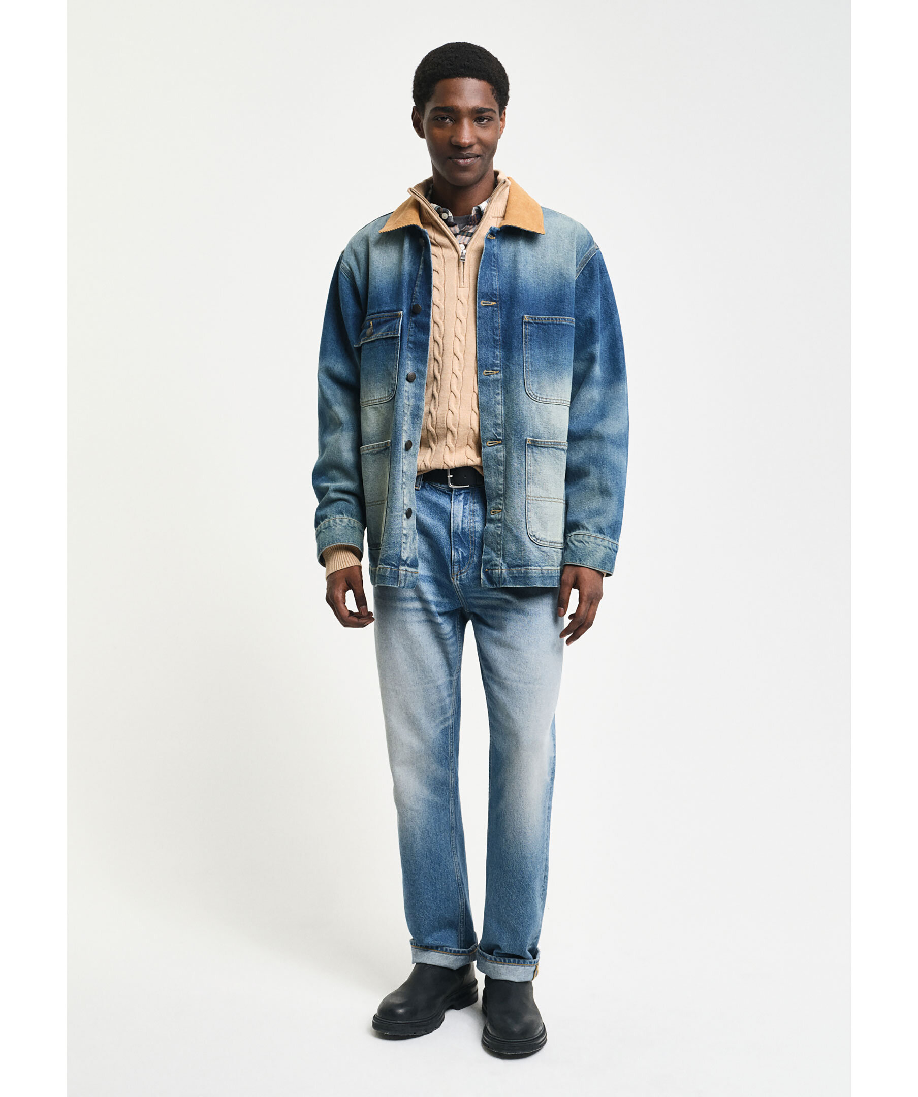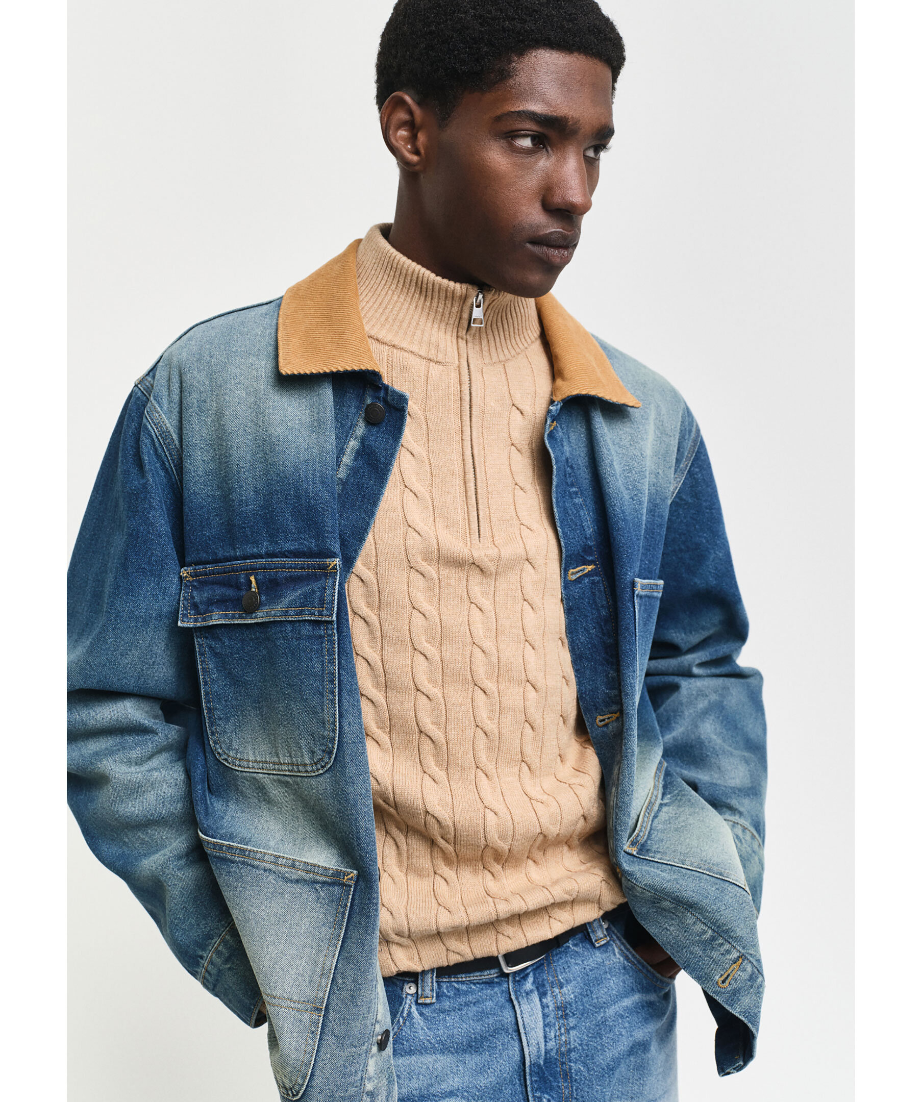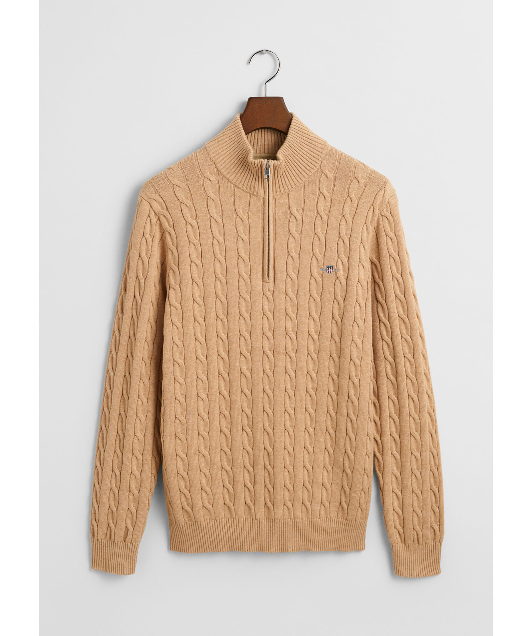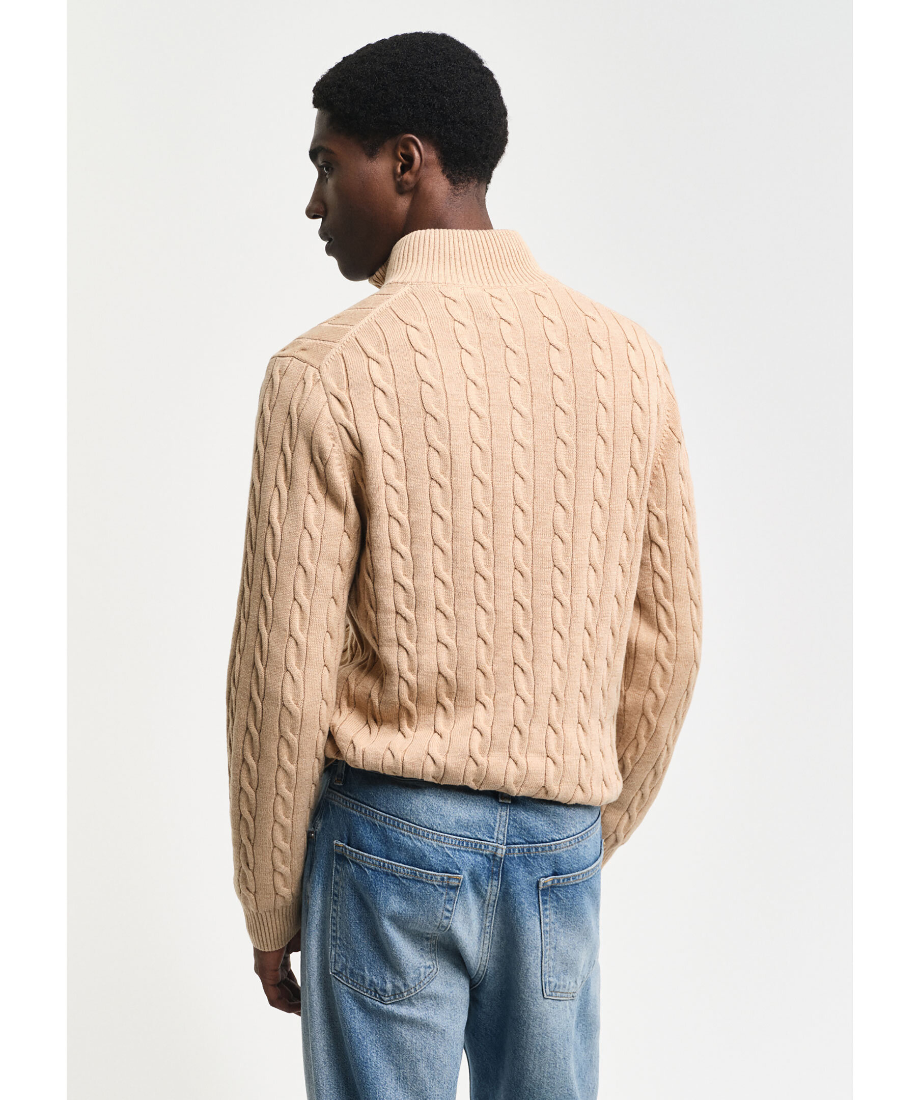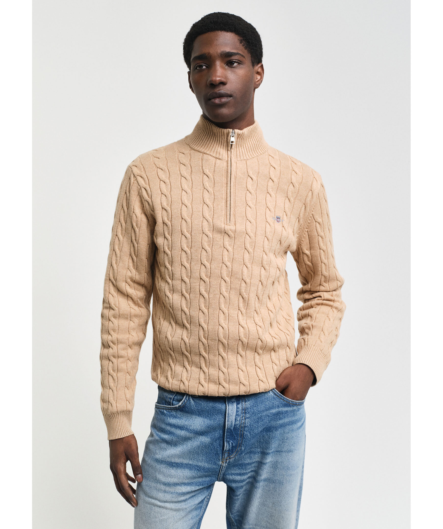 Khakifärgad, kabelstickad half-zip från Gant. Tröjan har ribbstickad krage samt muddar vid ärm- och plaggslut och en broderad GANT-logotyp på bröstet. Tillverkad i bomull.