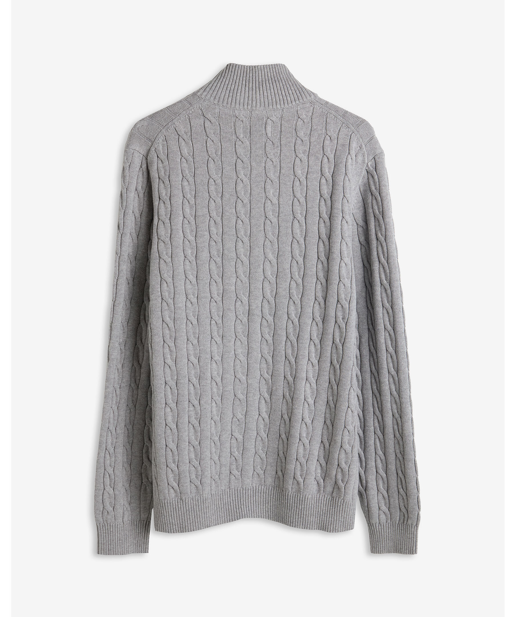Ljusgrå, kabelstickad kofta från Gant. Koftan stängs med tvåvägsdragkedja och har ribbstickade muddar vid krage, ärmslut och fåll. Tillverkad i 100% bomull.