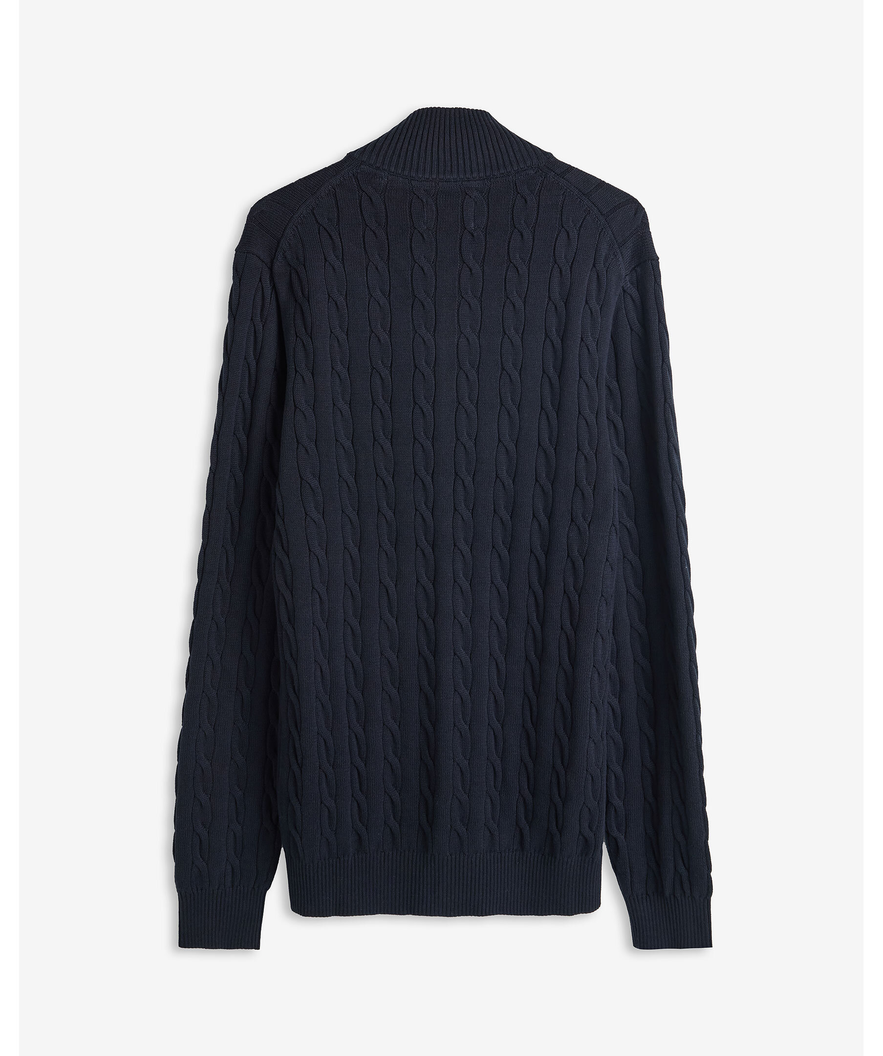 Mörkblå, kabelstickad kofta från Gant. Koftan stängs med tvåvägsdragkedja och har ribbstickade muddar vid krage, ärmslut och fåll. Tillverkad i 100% bomull.