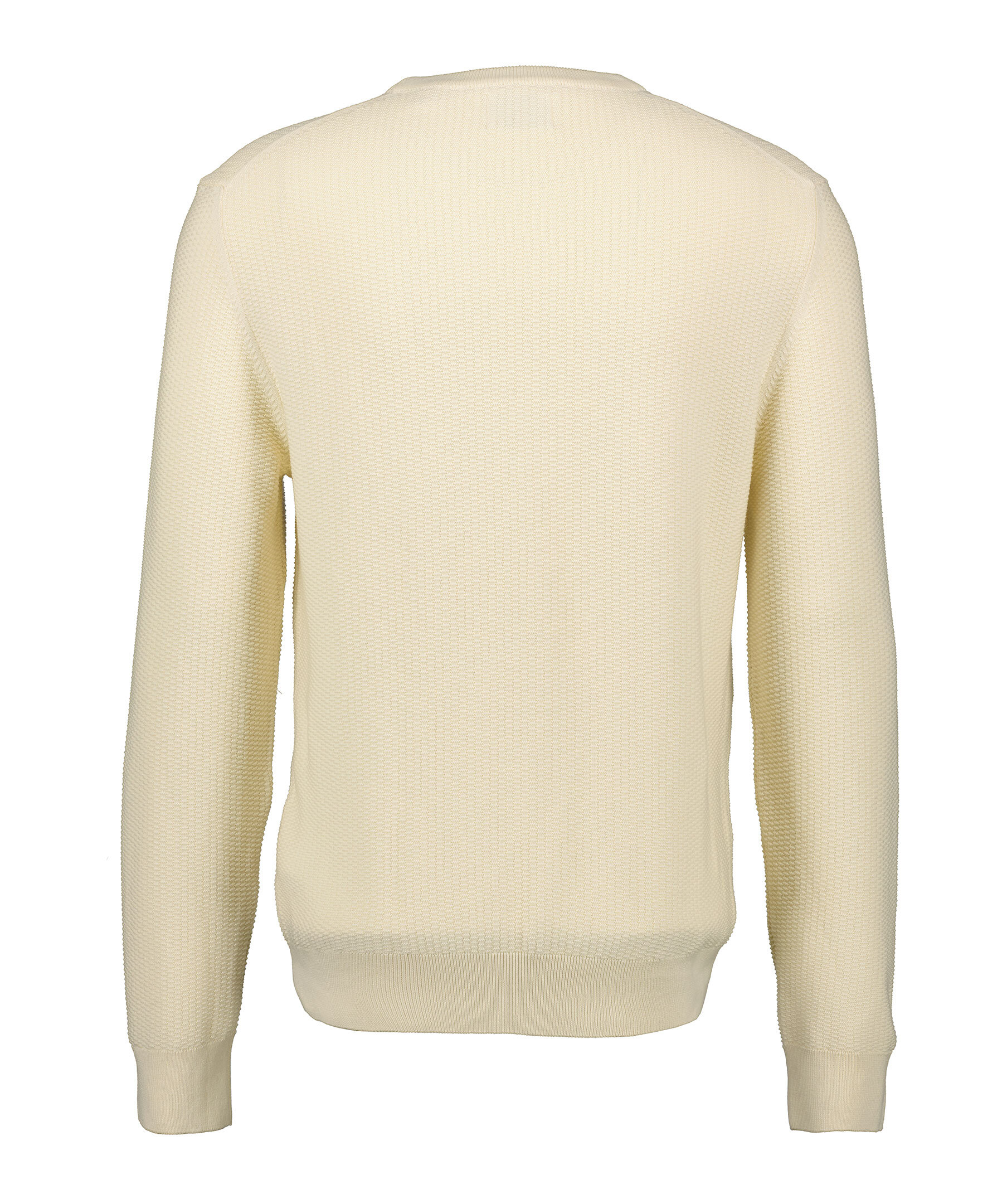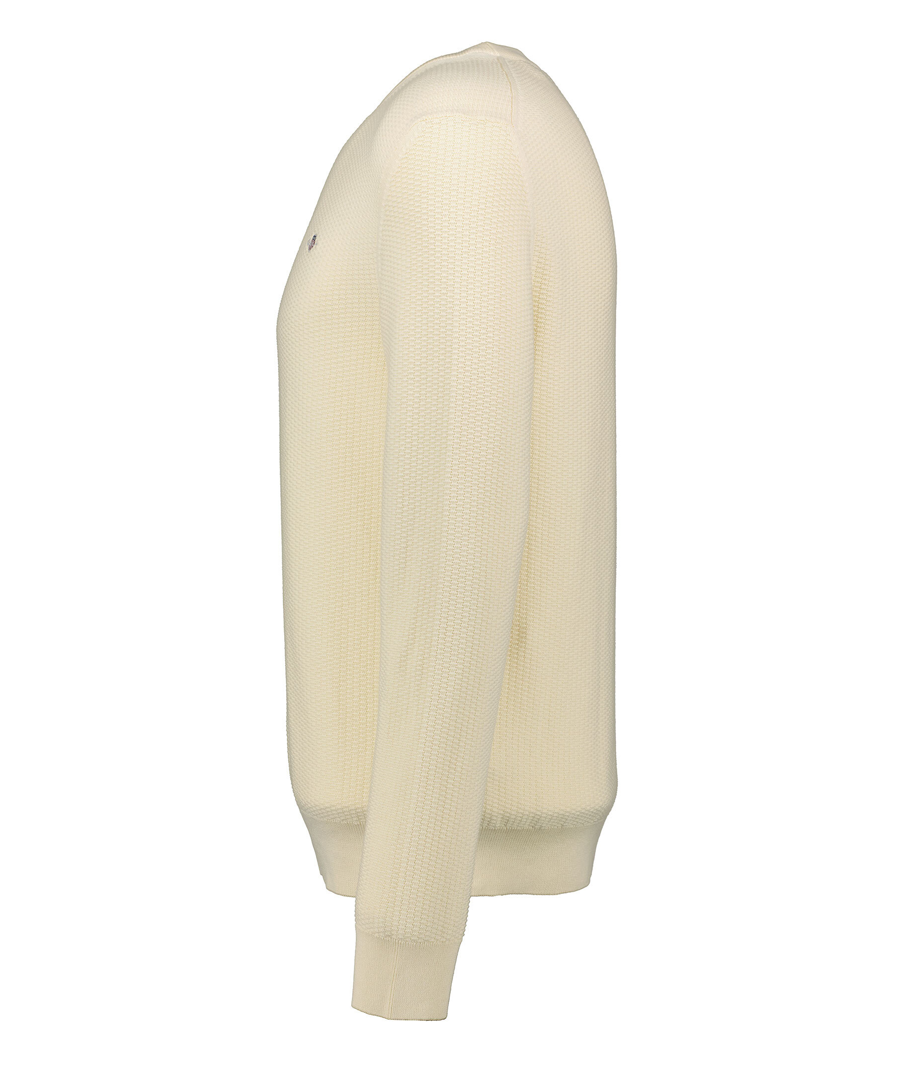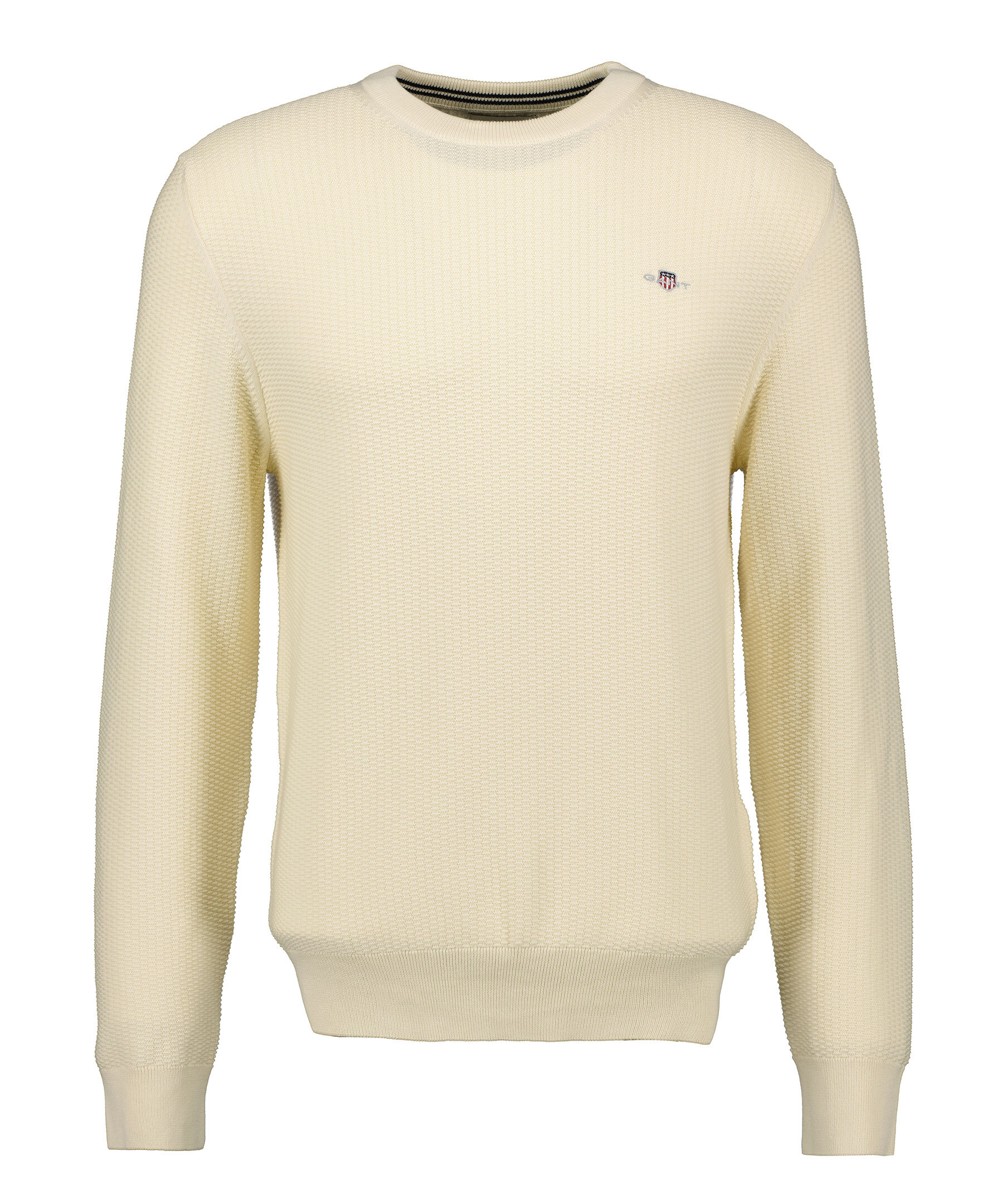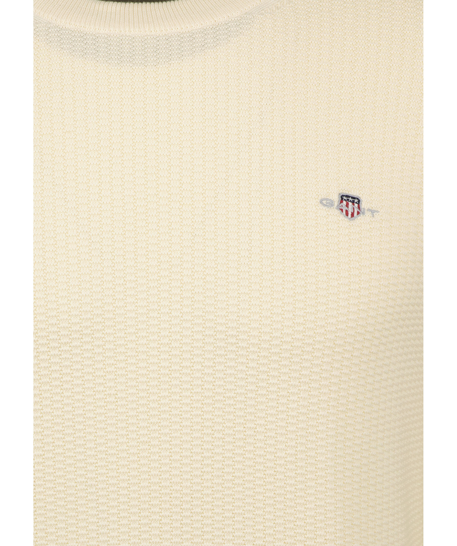Krämvit stickad tröja från Gant med mikrotextur. Tröjan har rund halsringning och ribbstickade muddar samt liten broderad Gant-logotyp på bröstet. Tillverkad i bomull.