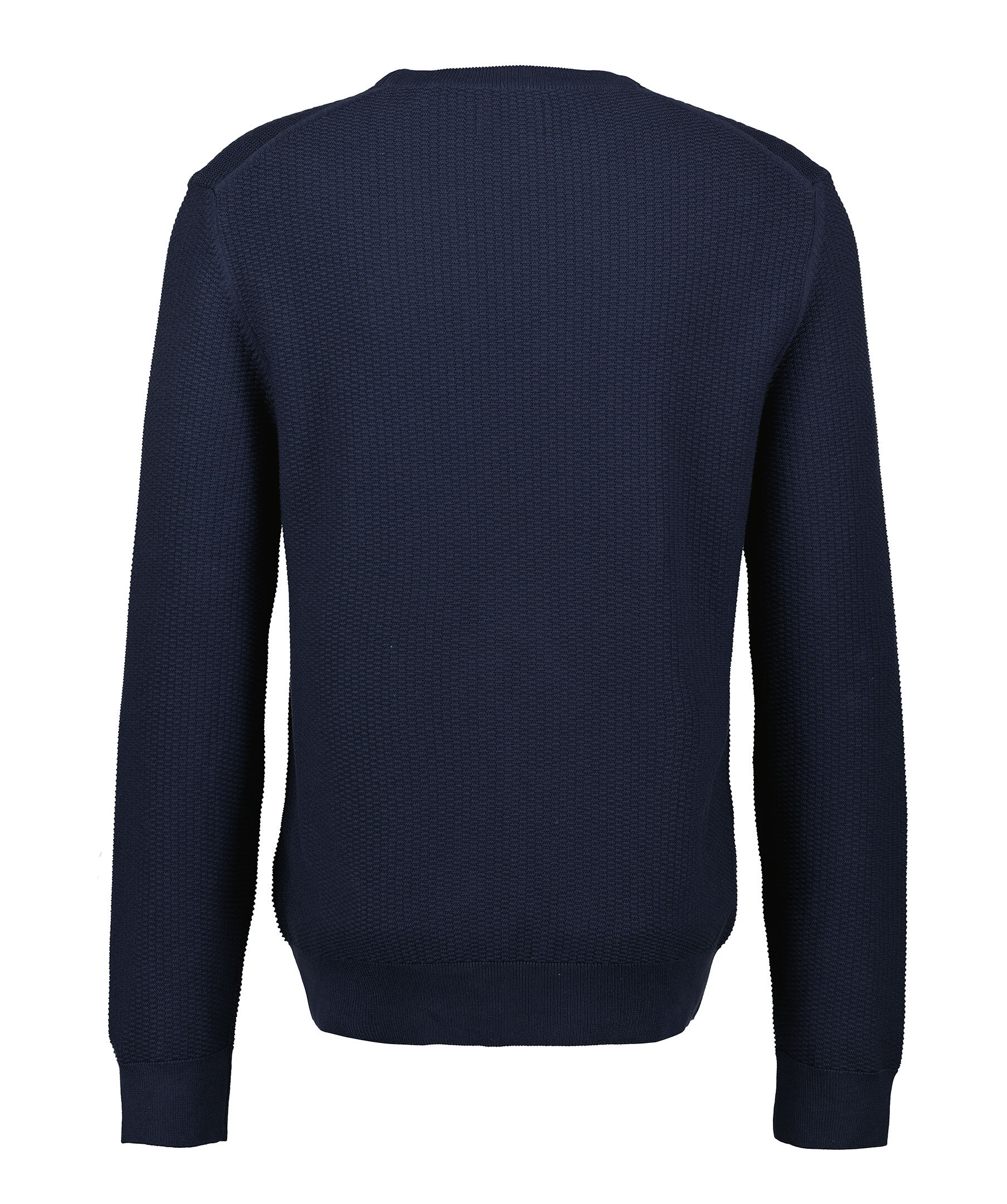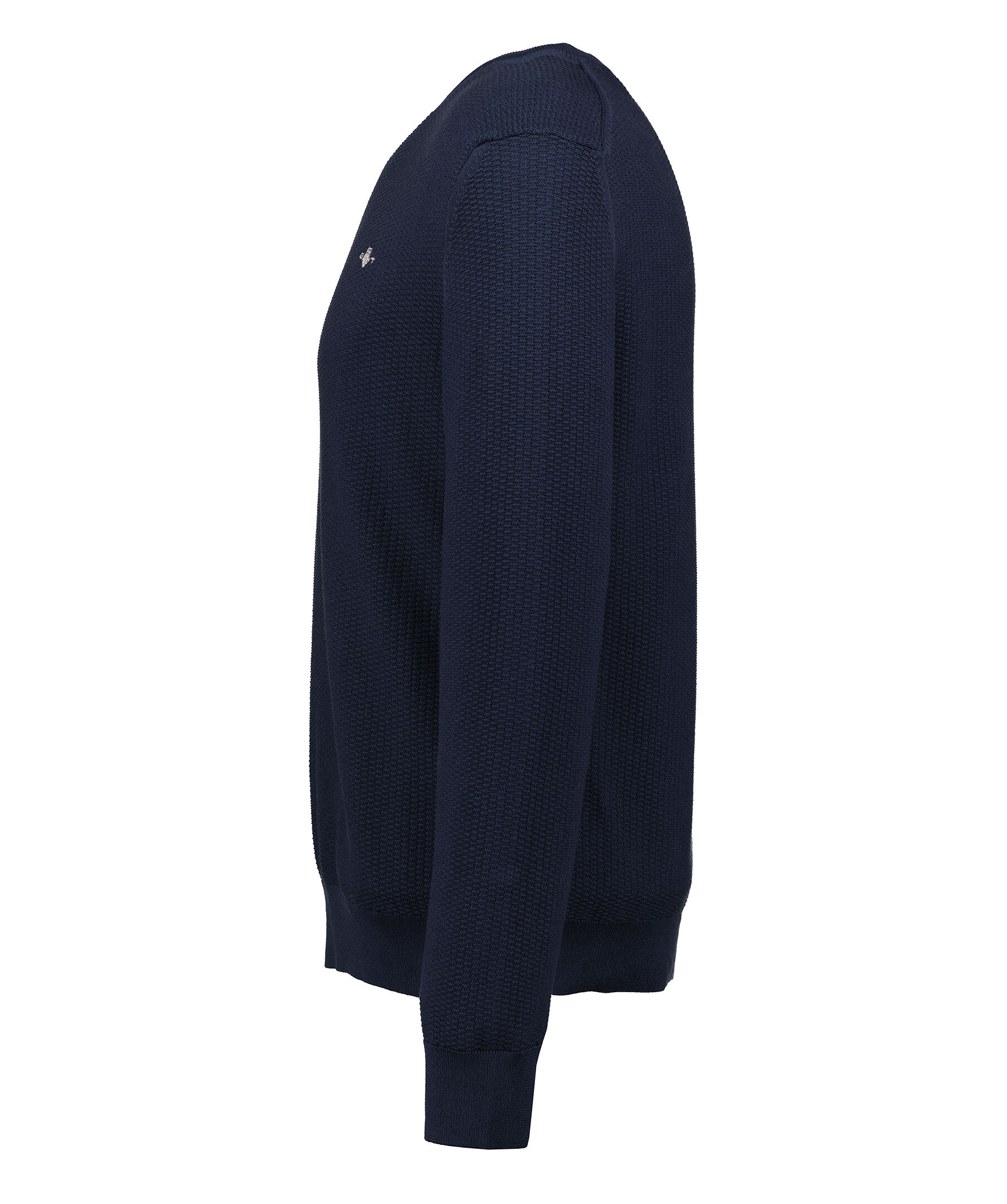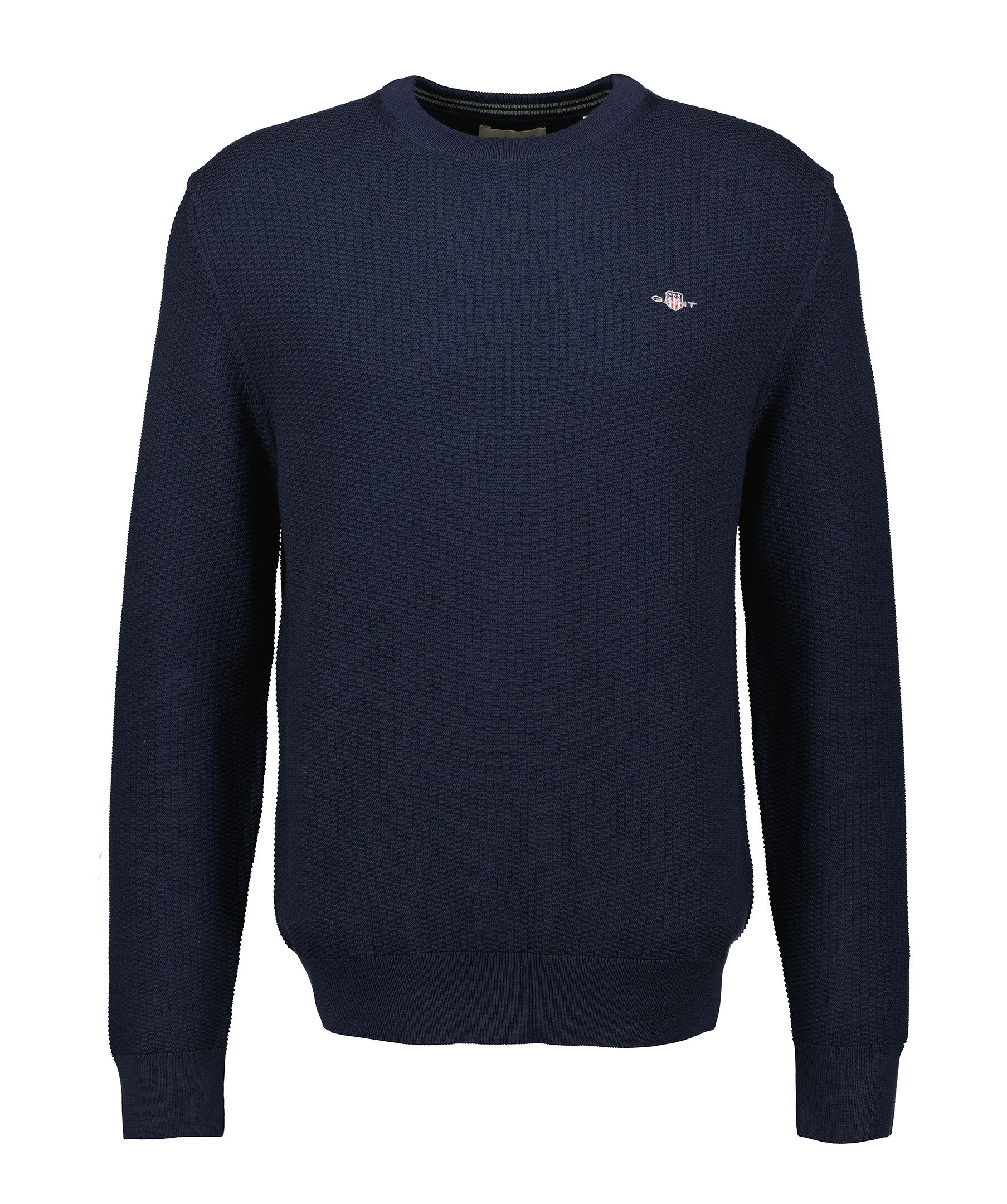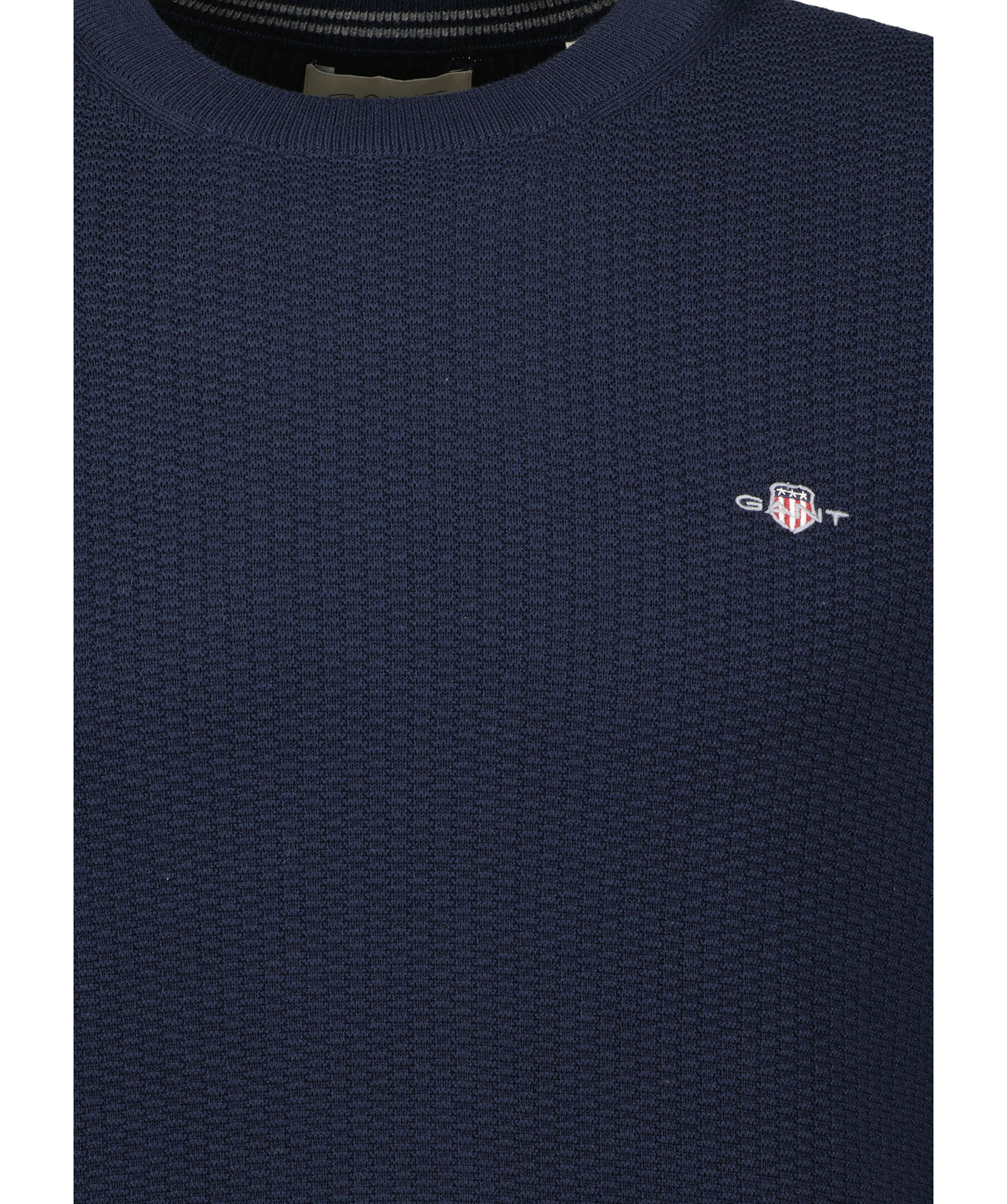 Mörkblå stickad tröja från Gant med mikrotextur. Tröjan har rund halsringning och ribbstickade muddar samt liten broderad Gant-logotyp på bröstet. Tillverkad i bomull.