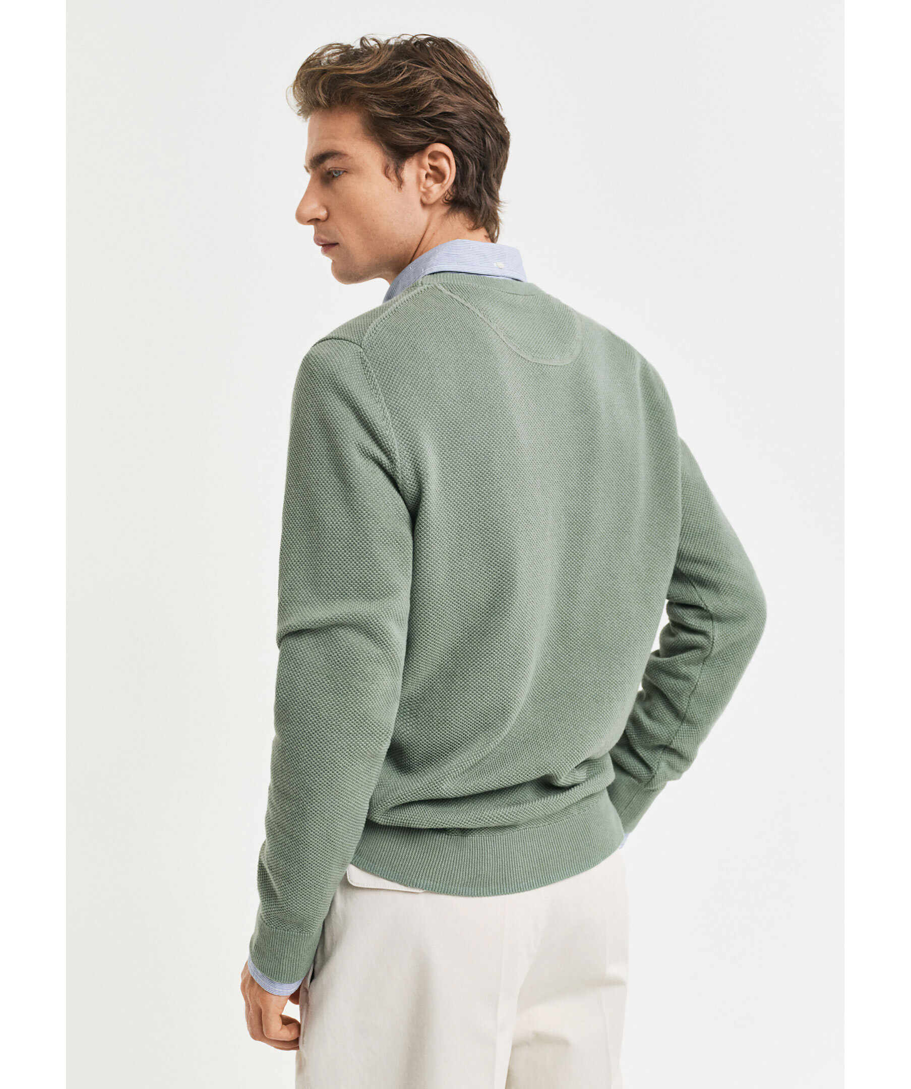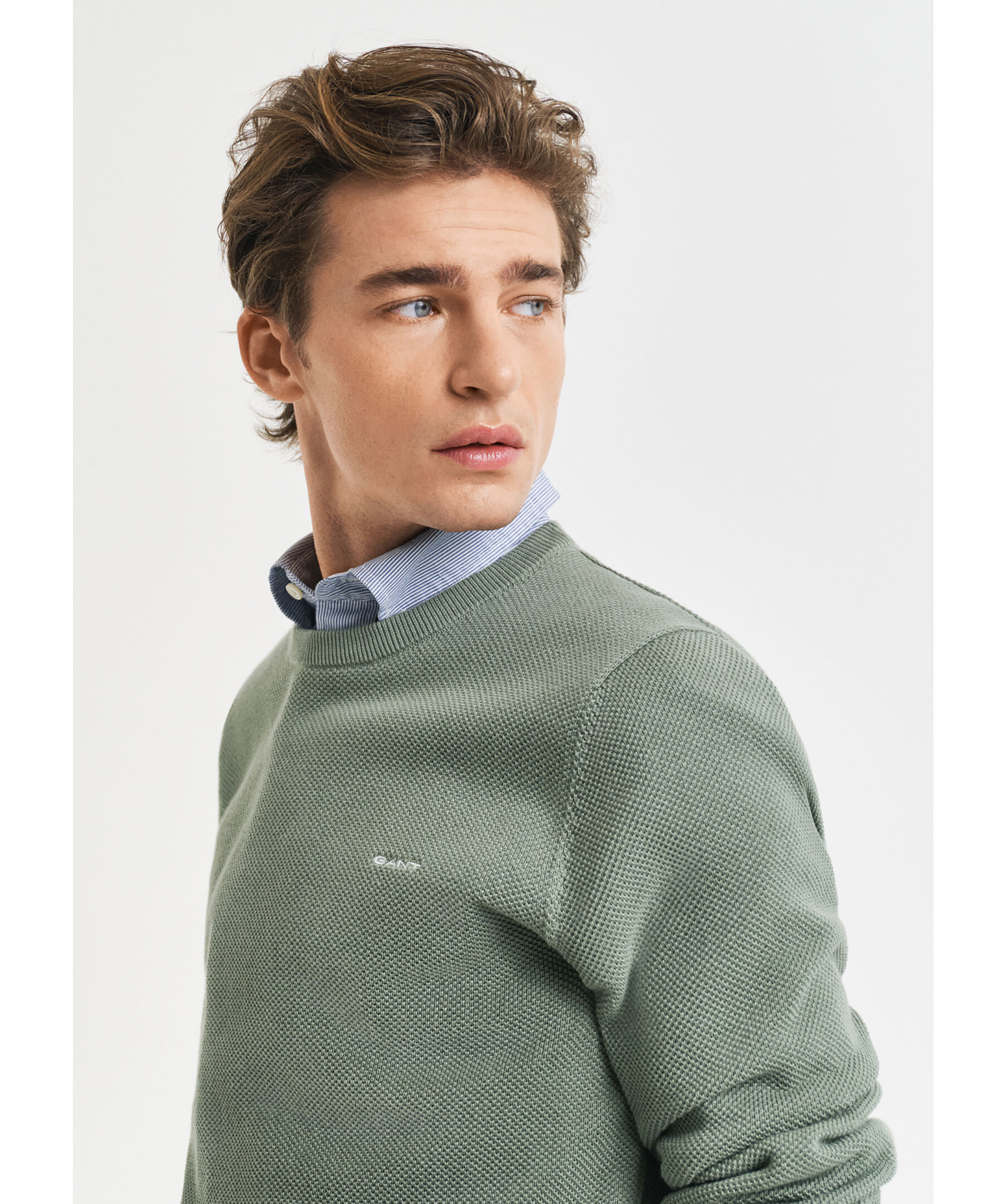 Grön tröja i tunn bomullspiké med rund halsringning från Gant. Ribbstickad krage och muddar samt broderad Gant-logotyp på bröstet. Tillverkad i bomull.