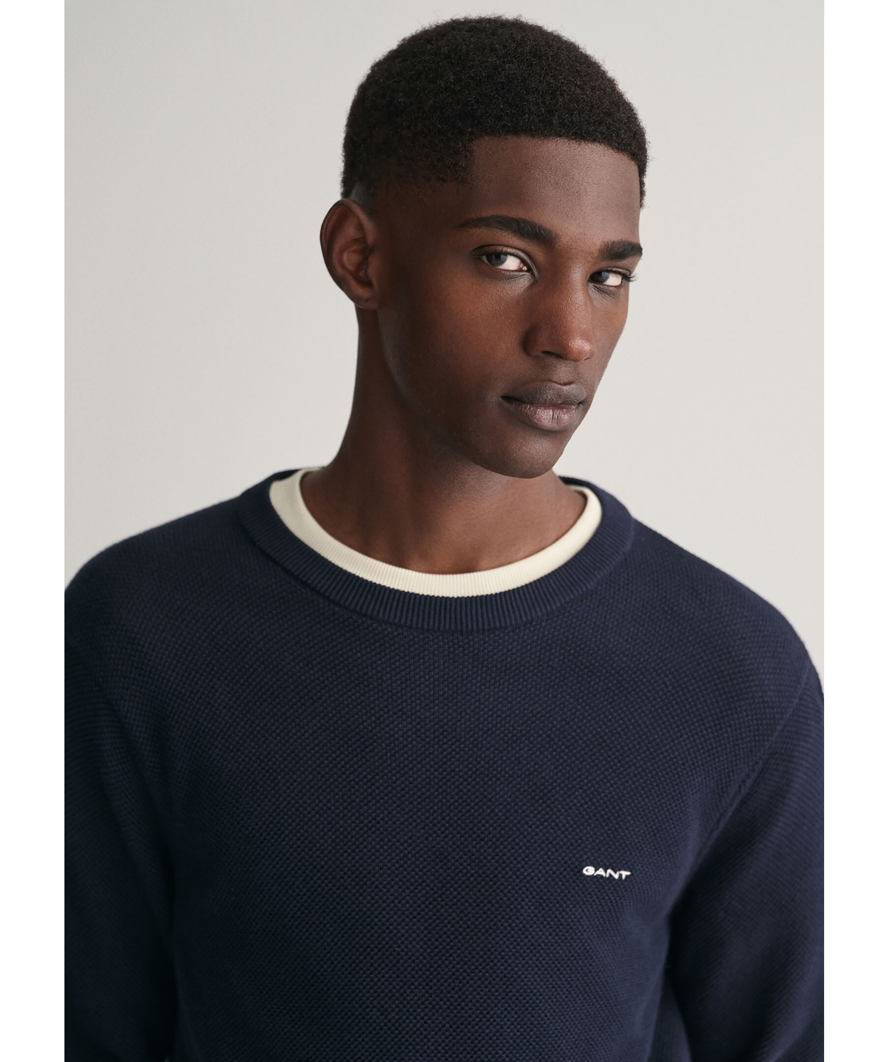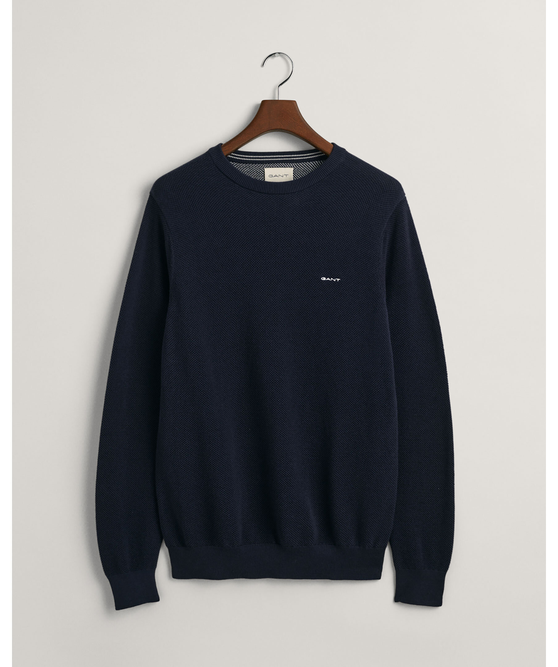 Mörkblå tröja i tunn bomullspiké med rund halsringning från Gant. Ribbstickad krage och muddar samt broderad Gant-logotyp på bröstet. Tillverkad i bomull.