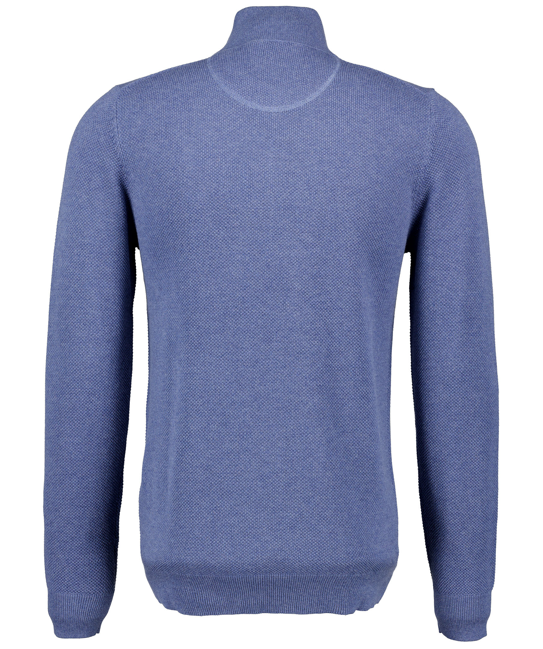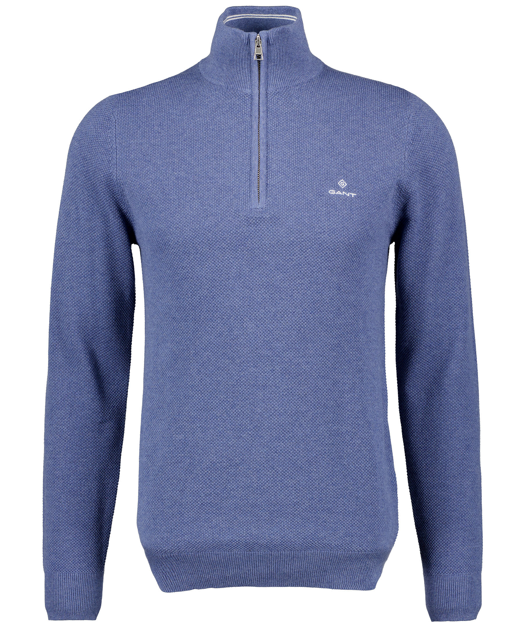 Blå, stickad pullover med half zip-krage från Gant. Pikéstruktur, broderad logotyp i vitt på bröstet. Normal passform och ribbade muddar.