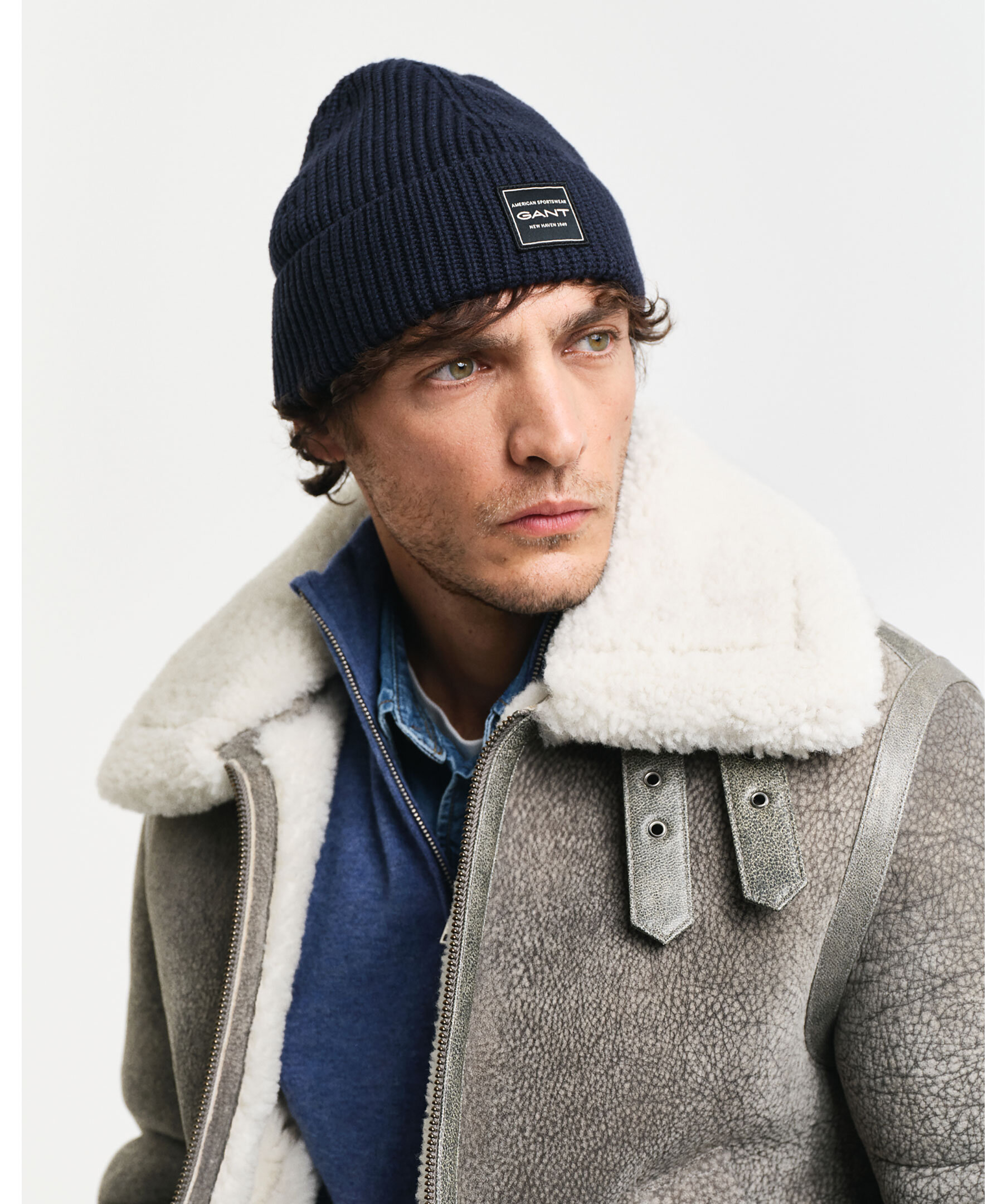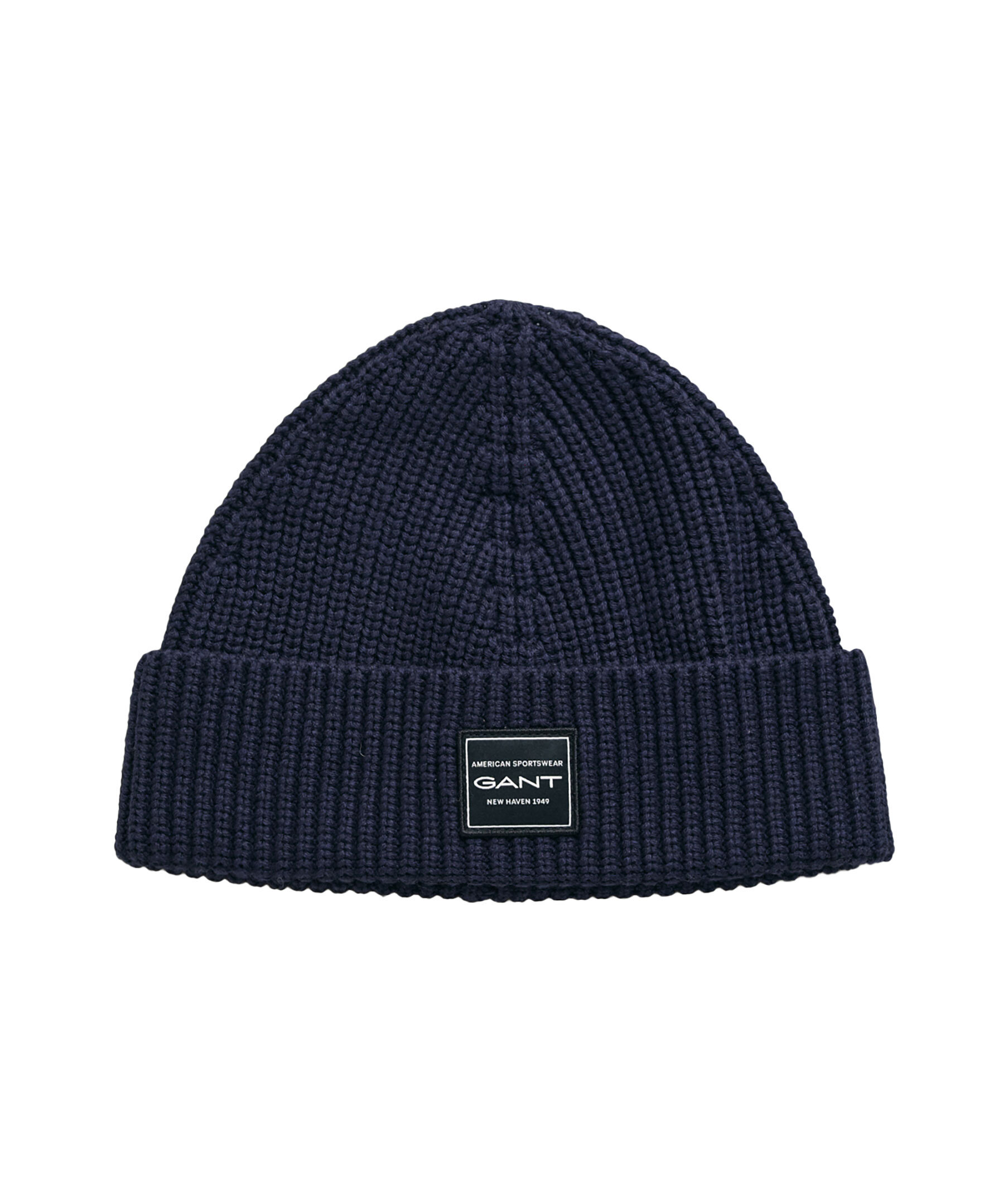 Marinblå ribbstickad mössa från GANT. Snygg uppvikt kant med GANT-flaggan. Den är ett måste på vintern.