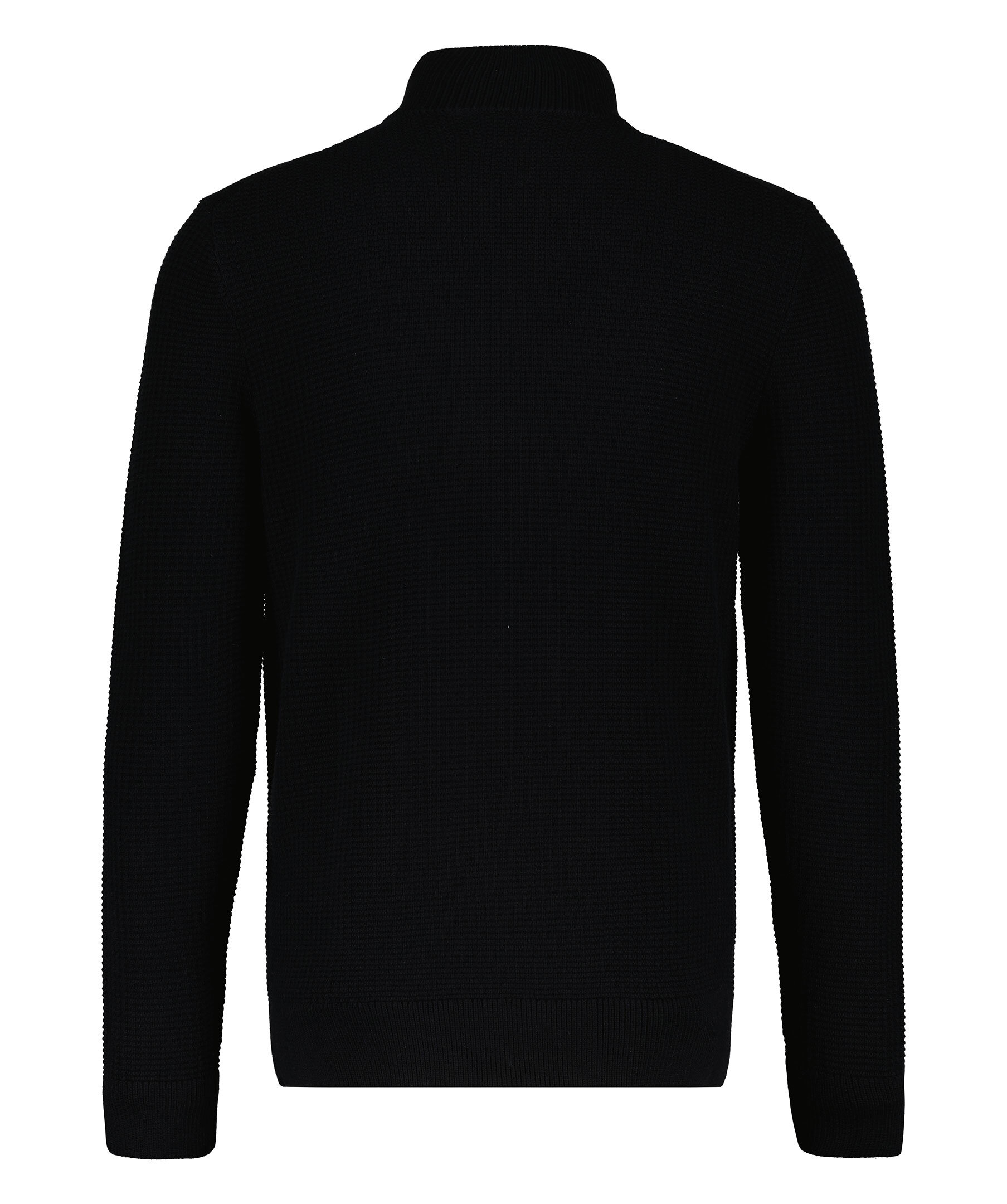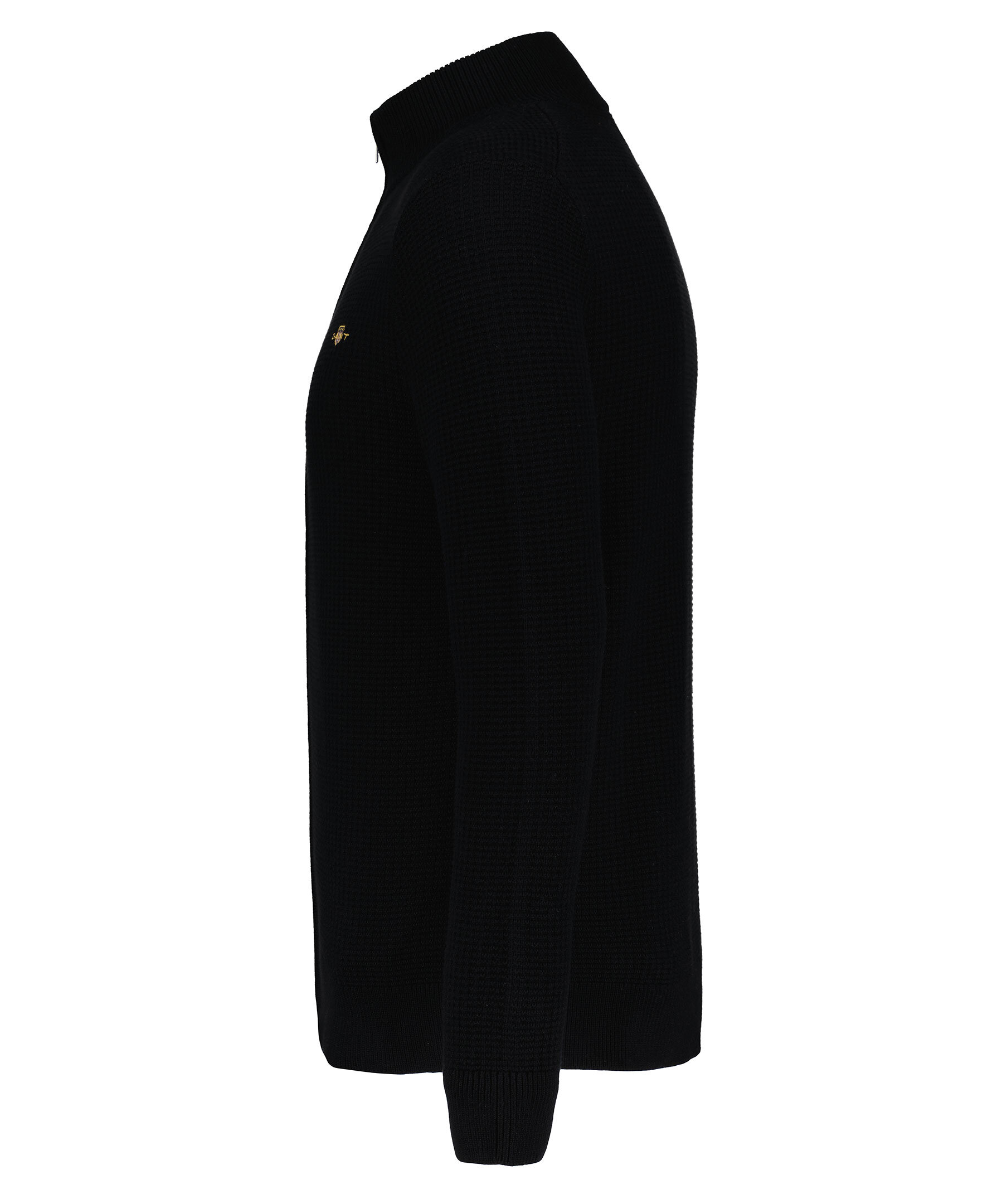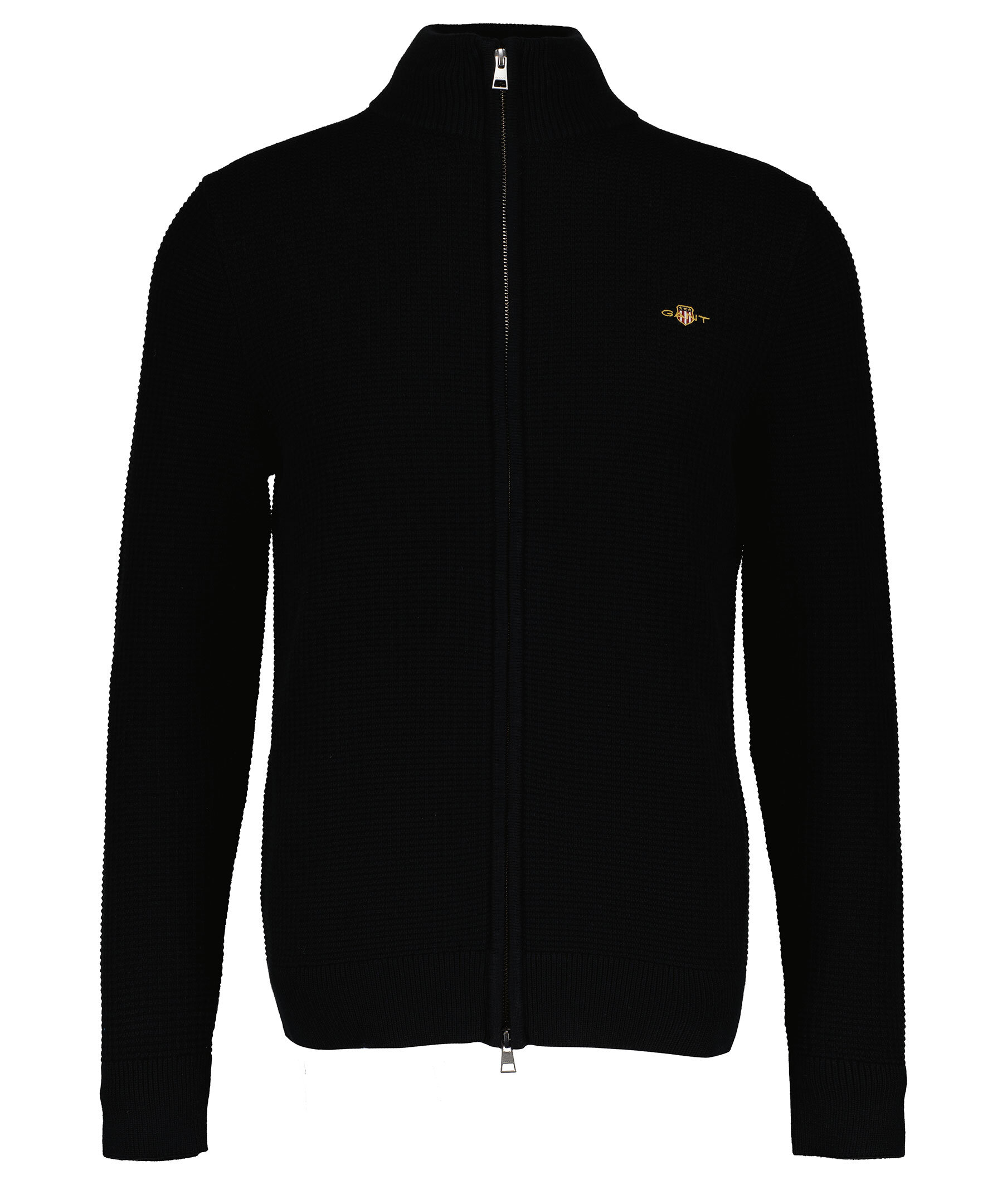 Svart texturstickad zip tröja från Gant. Tröjan har en normal passform, ribbstickade muddar, broderad logotyp på bröstet och stängs med tvåvägsdragkedja. Gjord i 100% bomull och har en hög krage.