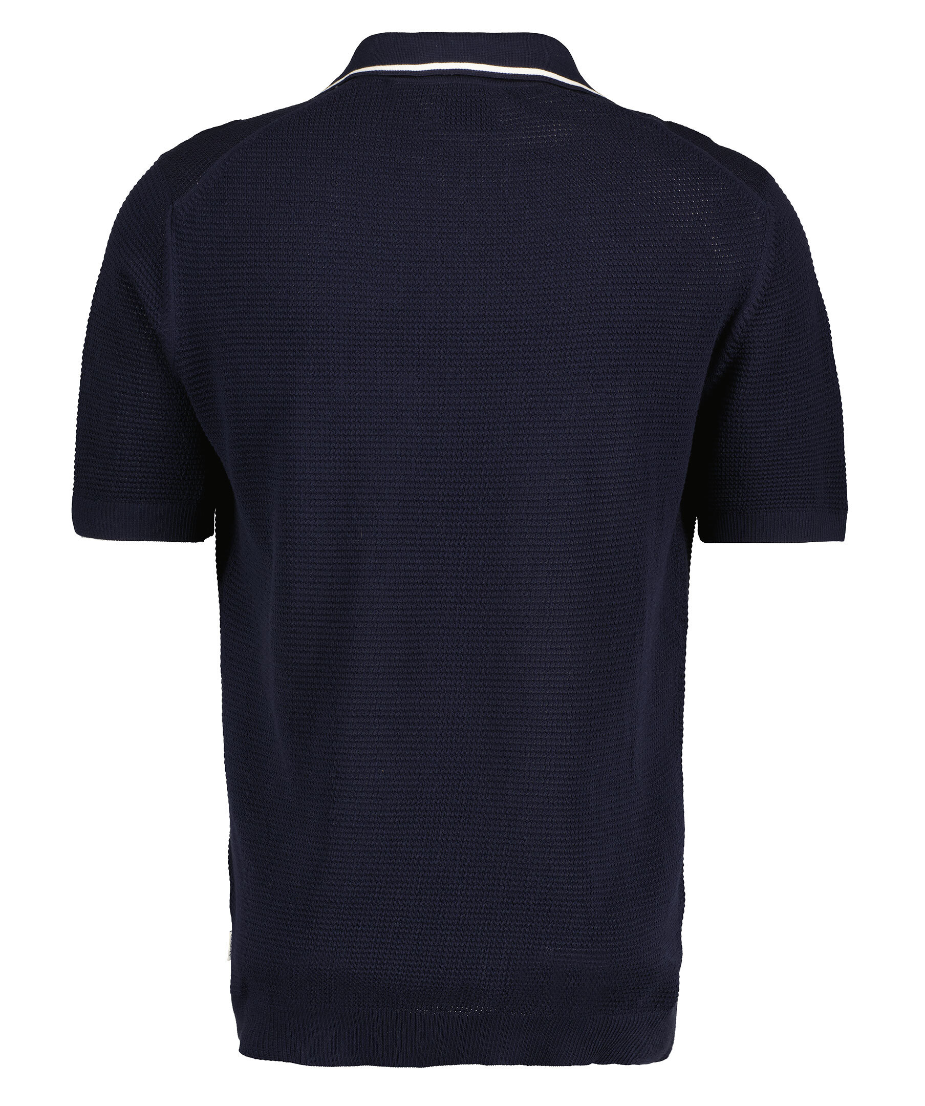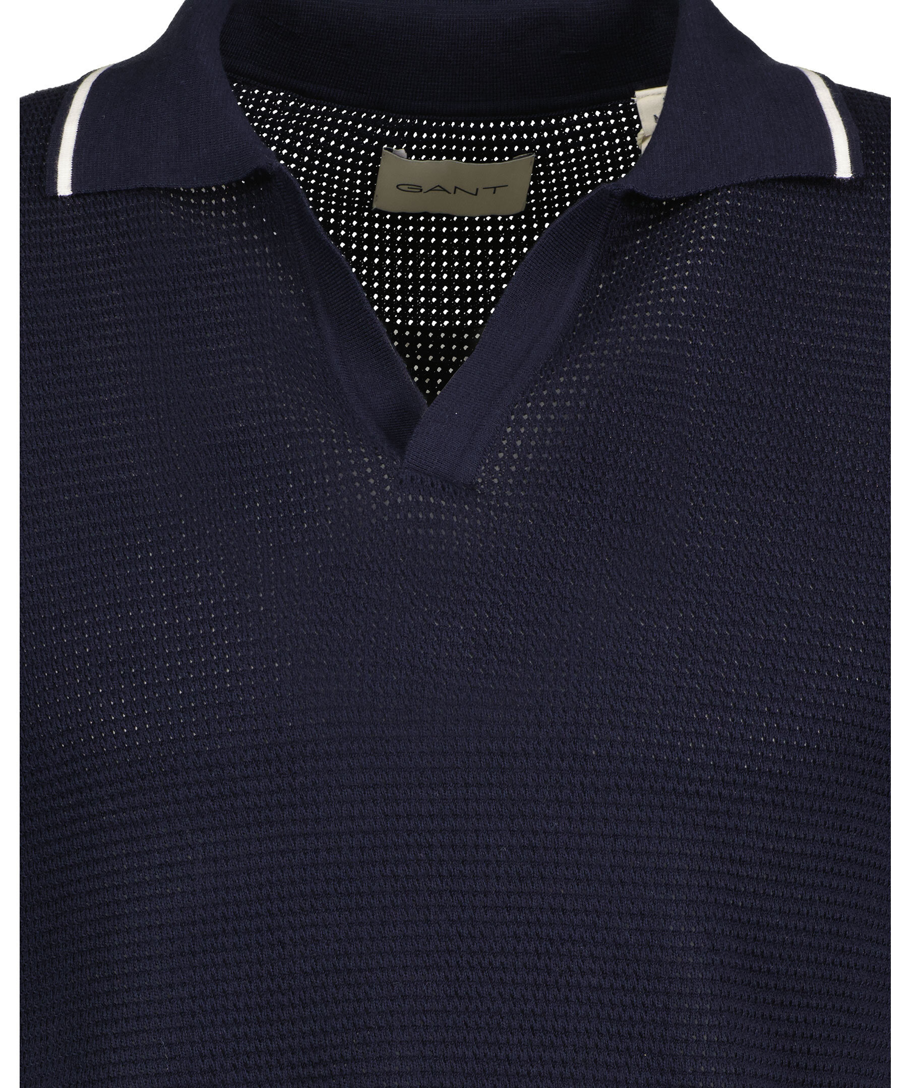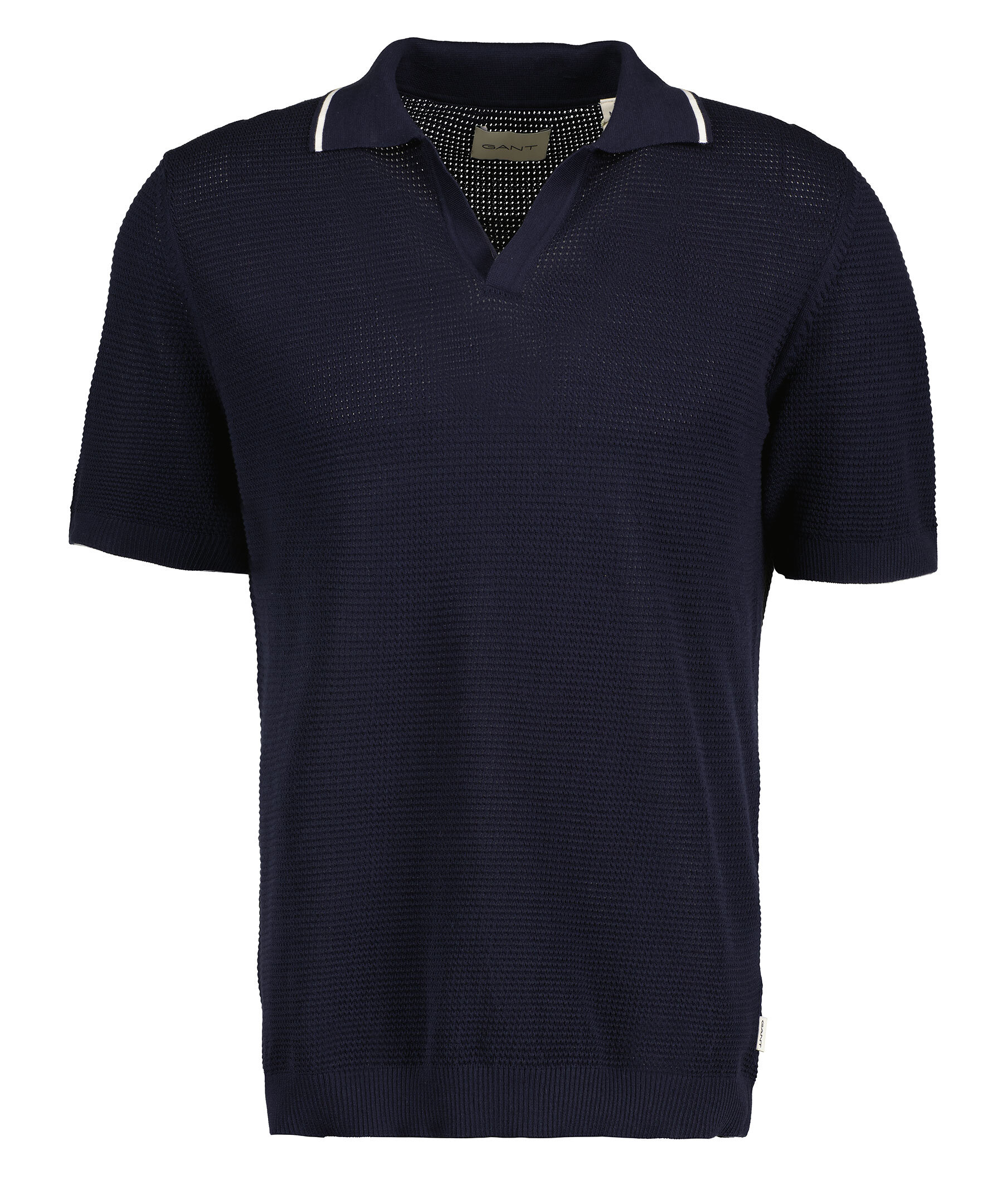 Mörkblå Piké tröja från Gant med öppen krage. Tröjan är finstickad och har en texturerad struktur. Slätstickad krage med vit detalj. Tillverkad i 100% bomull. Avslappnad passform.