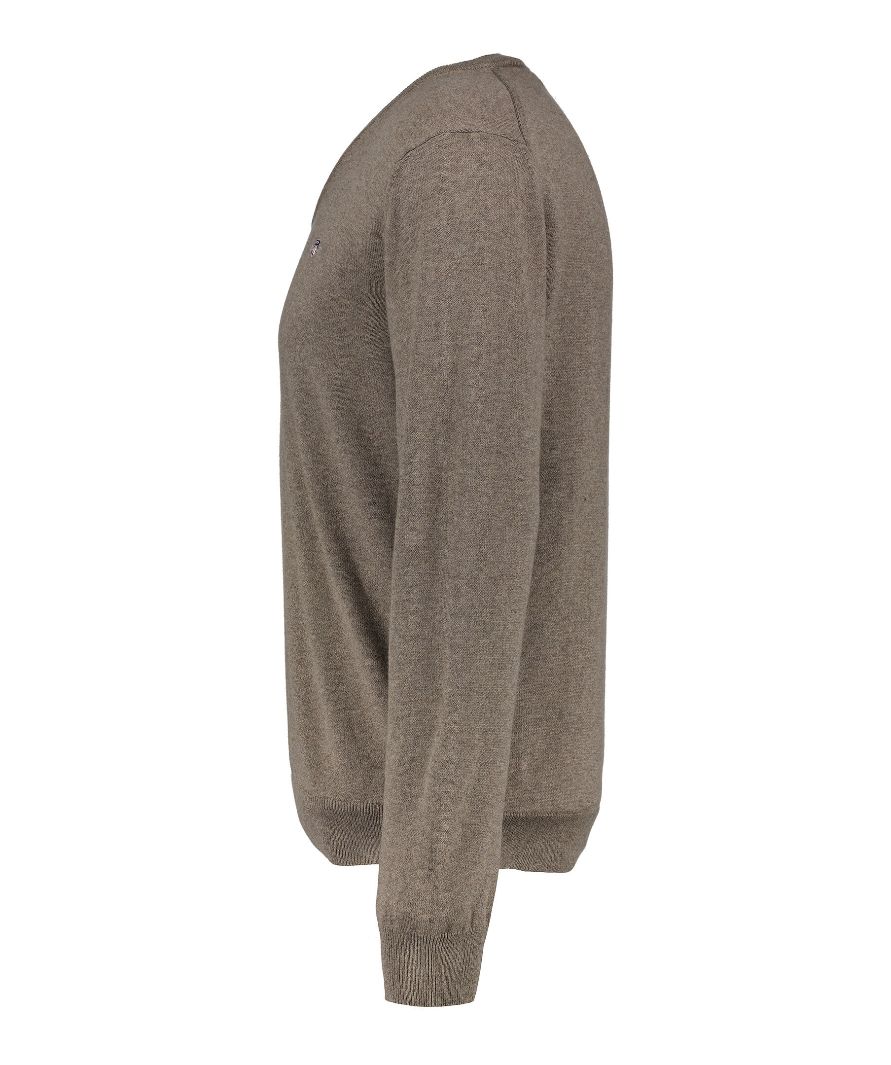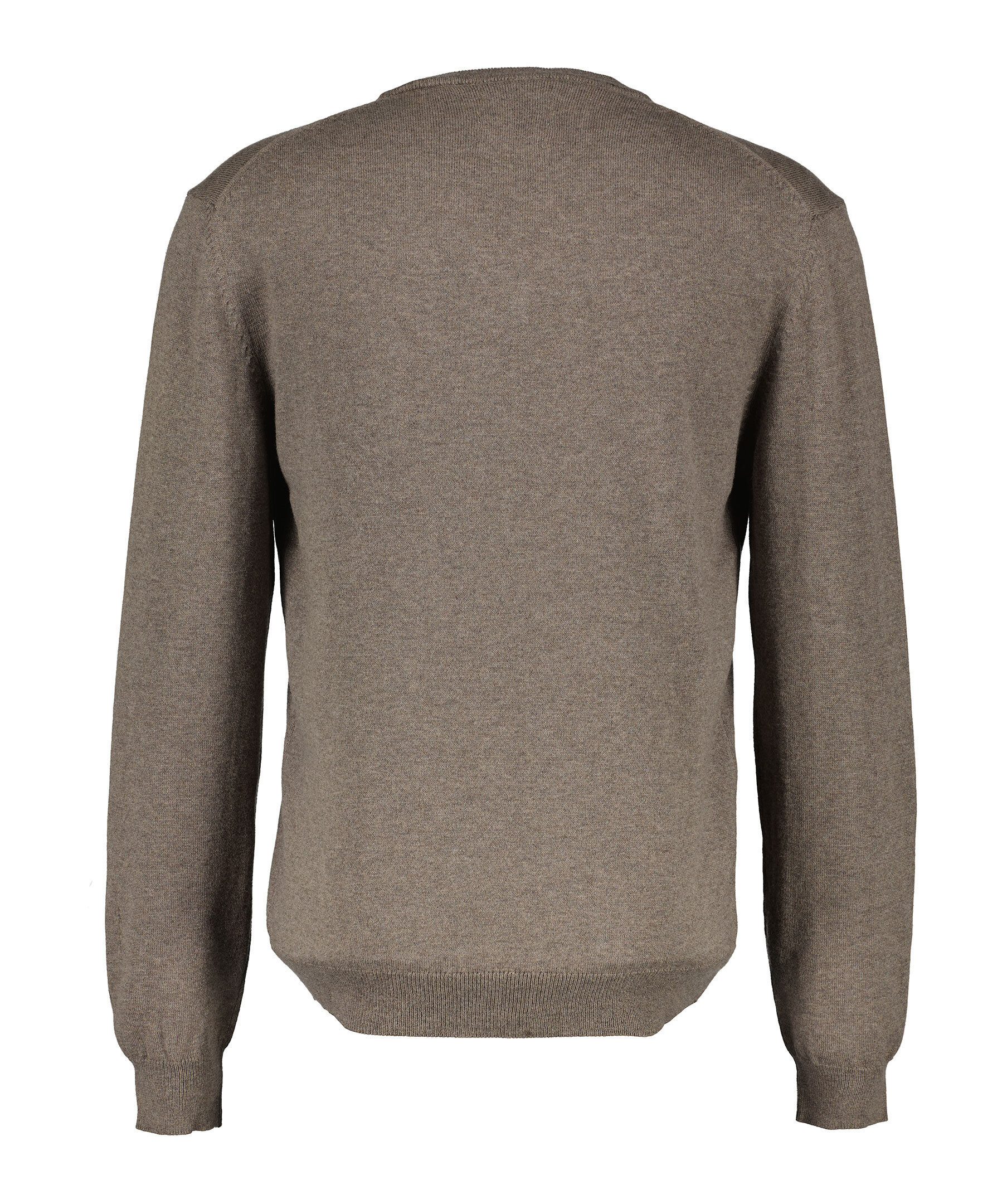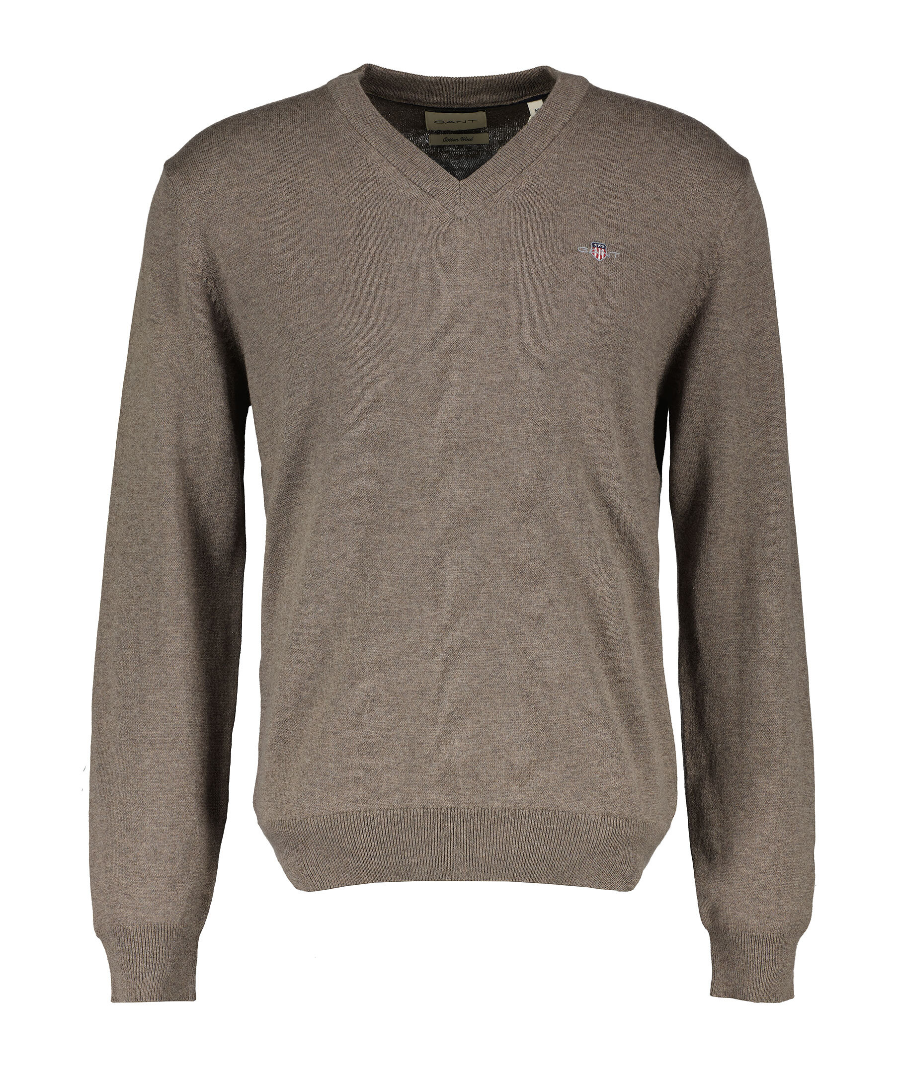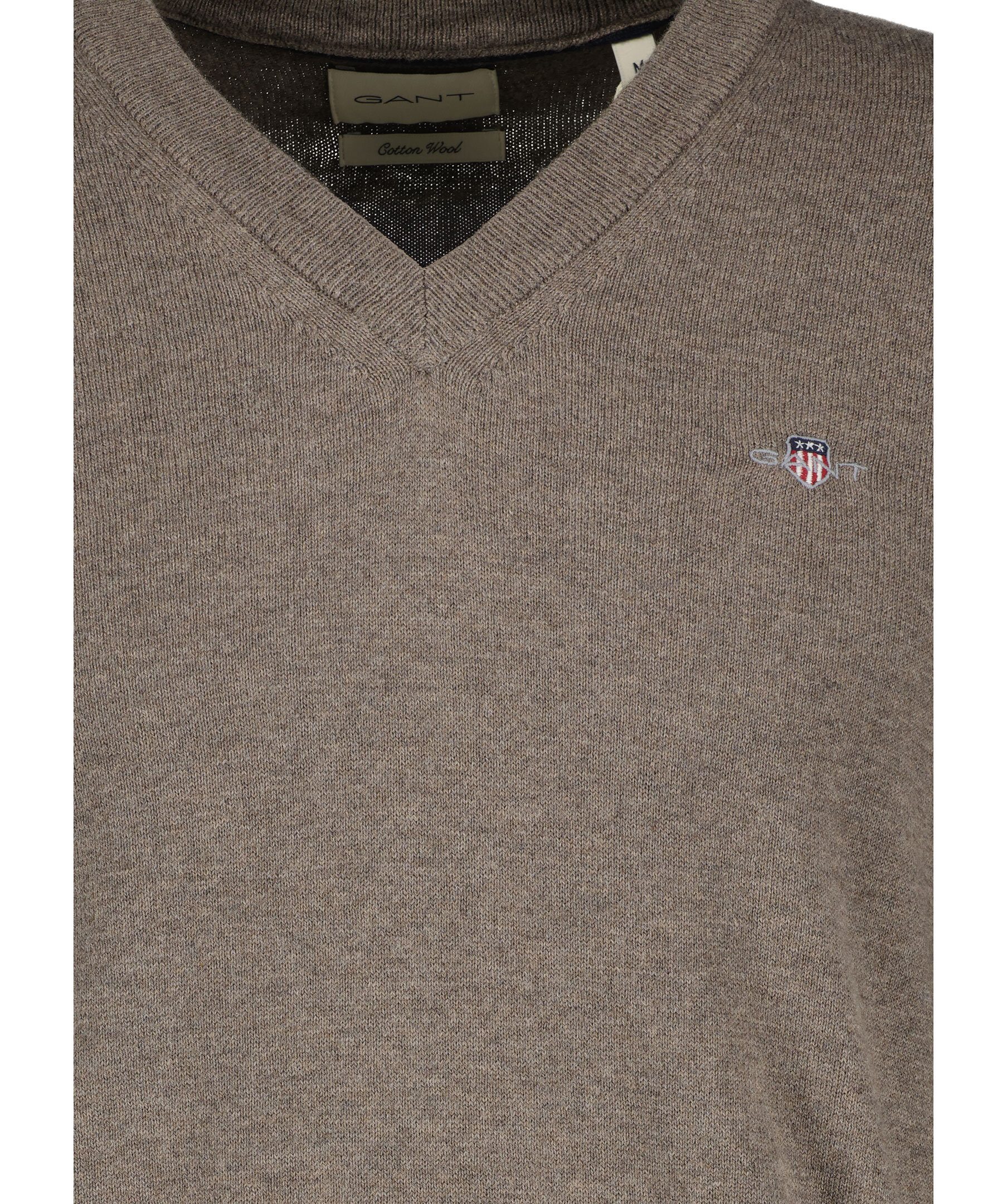 Gråbrun finstickad tröja från Gant. Tröjan har en ribbstickad, v-ringad halsringning samt ribbstickade muddar vid ärm- och plaggslut och en broderad logotyp på bröstet. Tillverkad i en ullblandning.