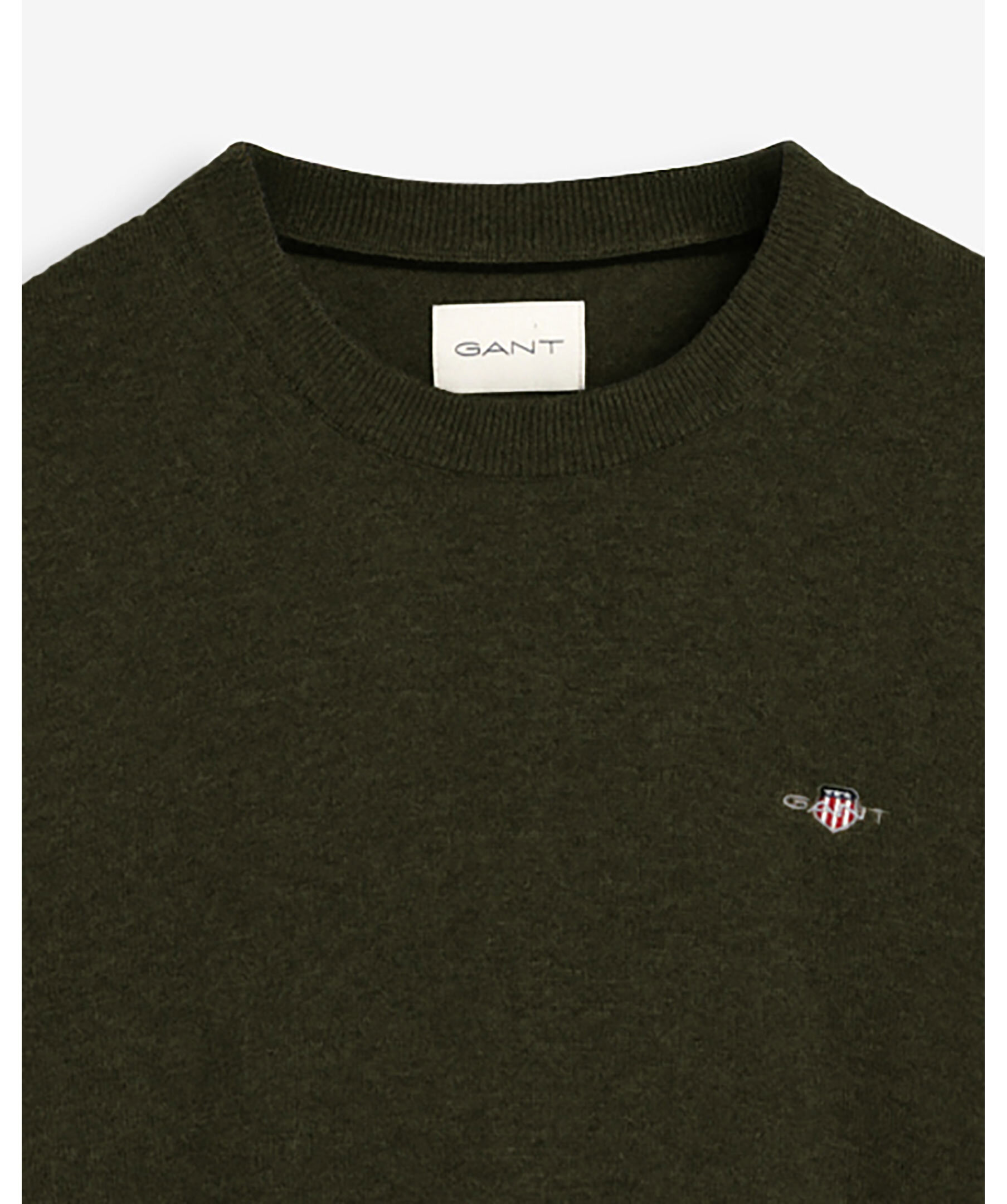 Mörkgrön, finstickad pullover från Gant. Tröjan har en rundad, ribbstickad halsringning, ribbstickade muddar vid ärm- och plaggslut samt broderad logotyp på bröstet. Tillverkad i en bomull- och ullblandning.