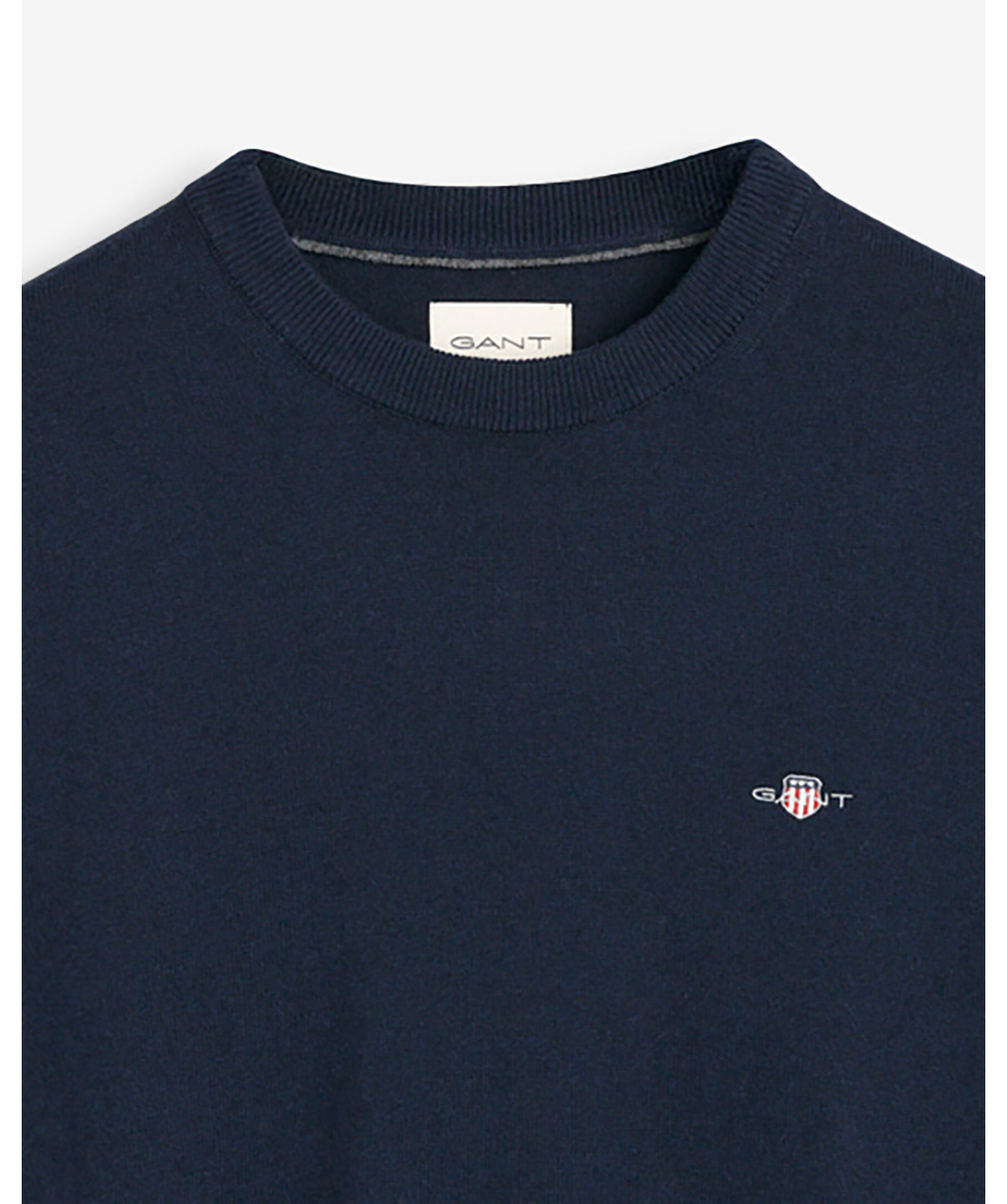 Mörkblå, finstickad pullover från Gant. Tröjan har en rundad, ribbstickad halsringning, ribbstickade muddar vid ärm- och plaggslut samt broderad logotyp på bröstet. Tillverkad i en bomull- och ullblandning.