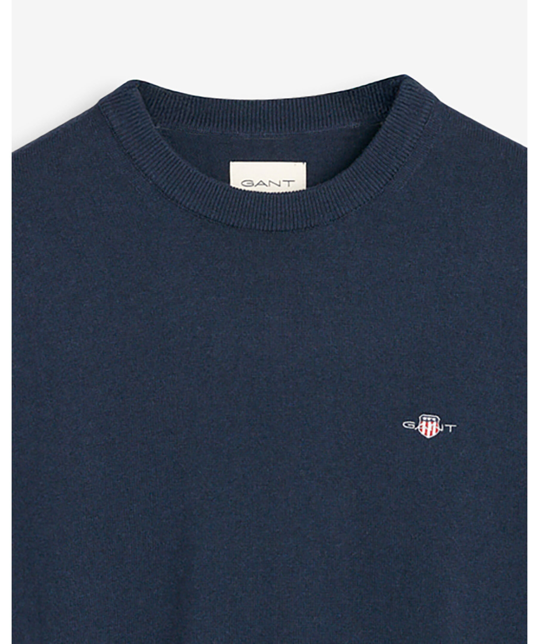 Marinblå, finstickad pullover från Gant. Tröjan har en rundad, ribbstickad halsringning, ribbstickade muddar vid ärm- och plaggslut samt broderad logotyp på bröstet. Tillverkad i en bomull- och ullblandning.