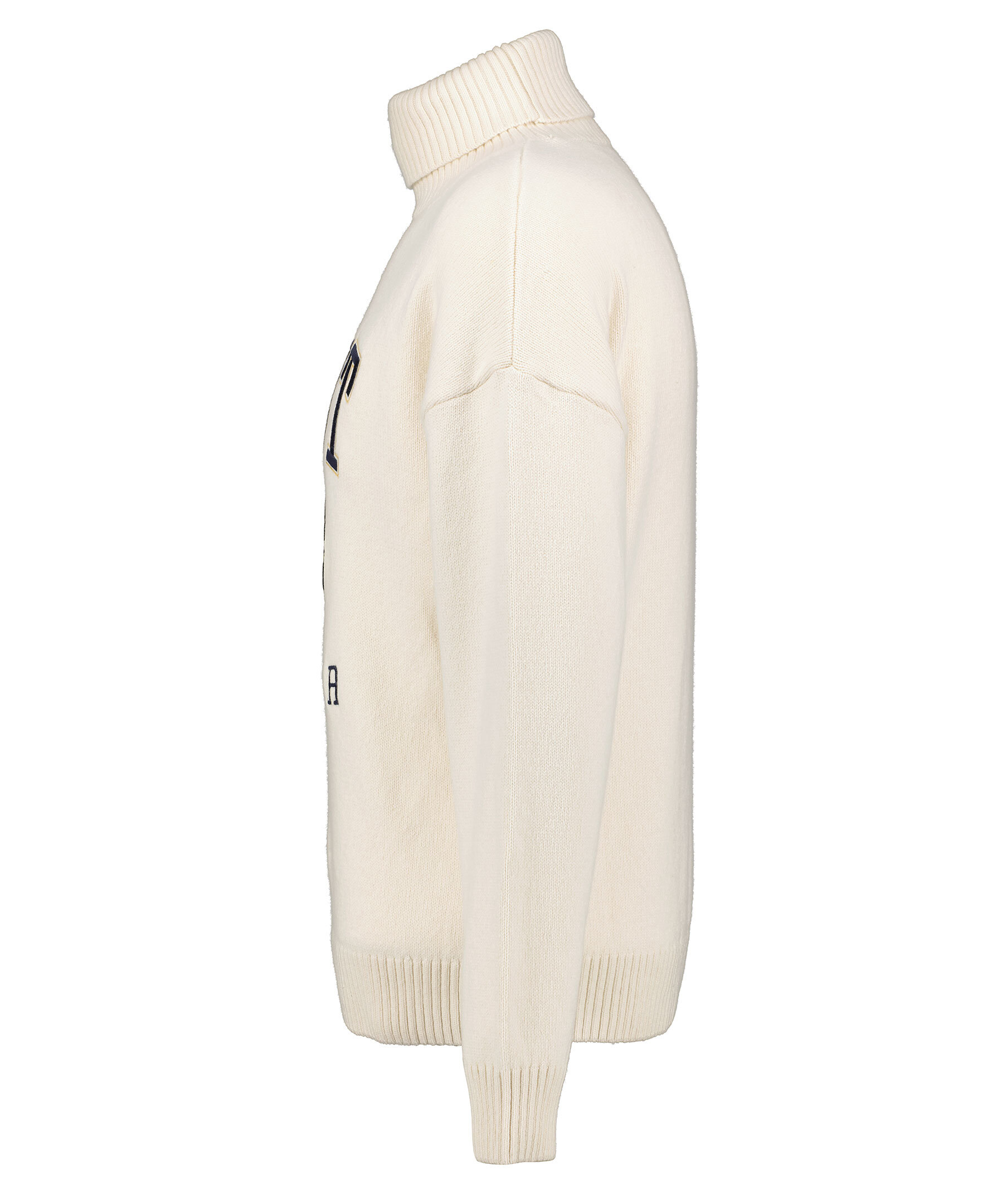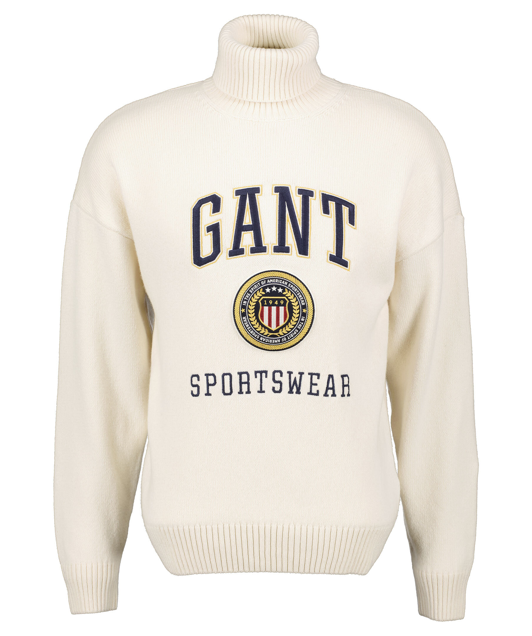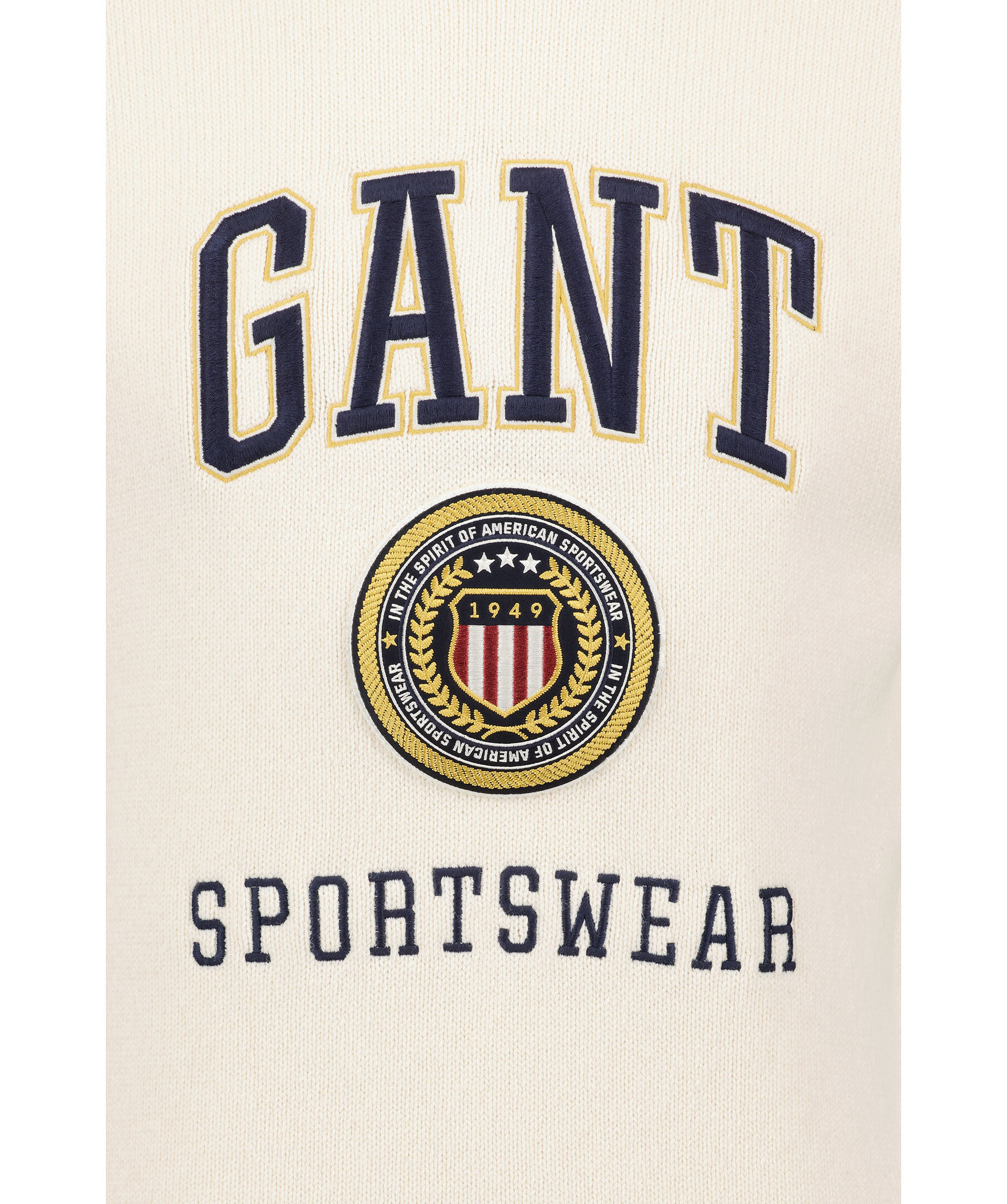Krämvit stickad polotröja från Gant. Broderad logotyp och patch på magen och bröstet. Ribbstickad, krage och muddar vid ärm- och plaggslut. Tillverkad i bomull och ullblandning.