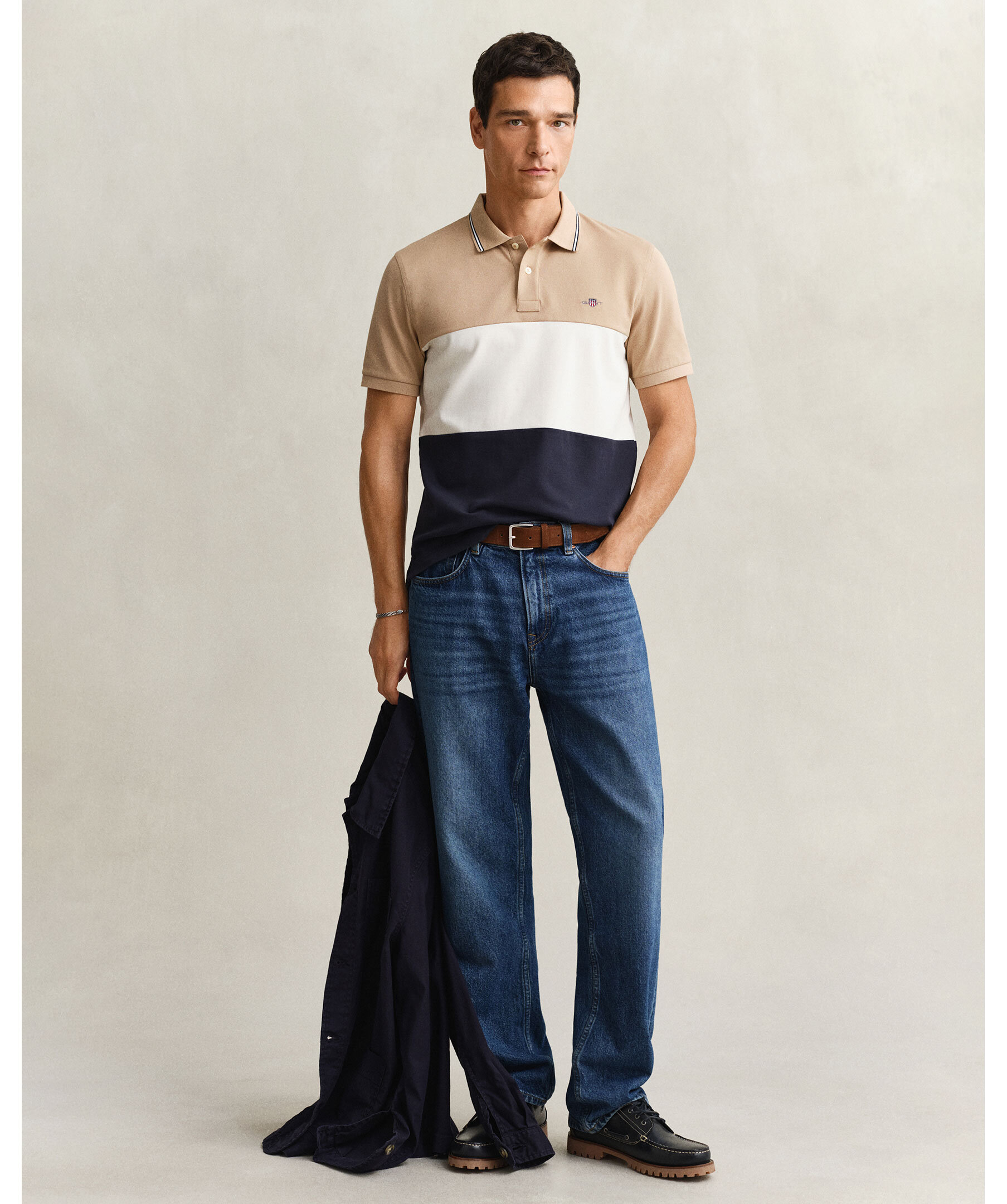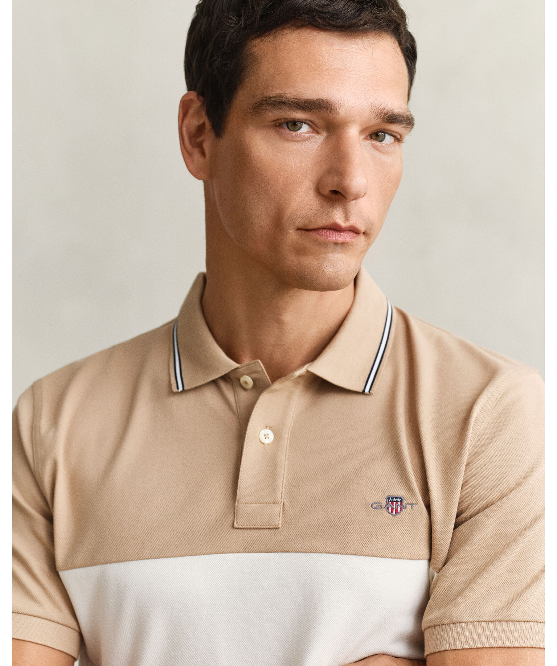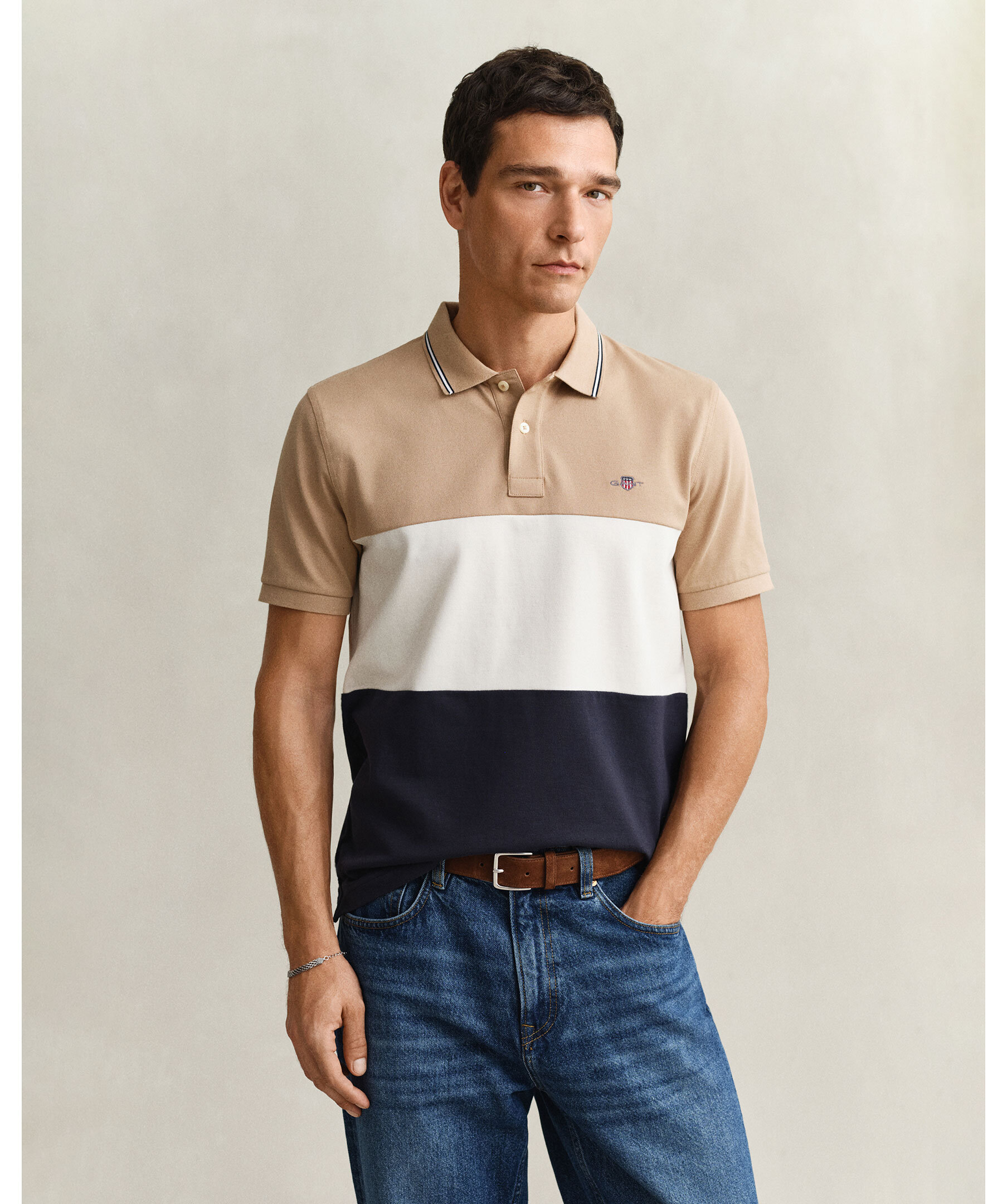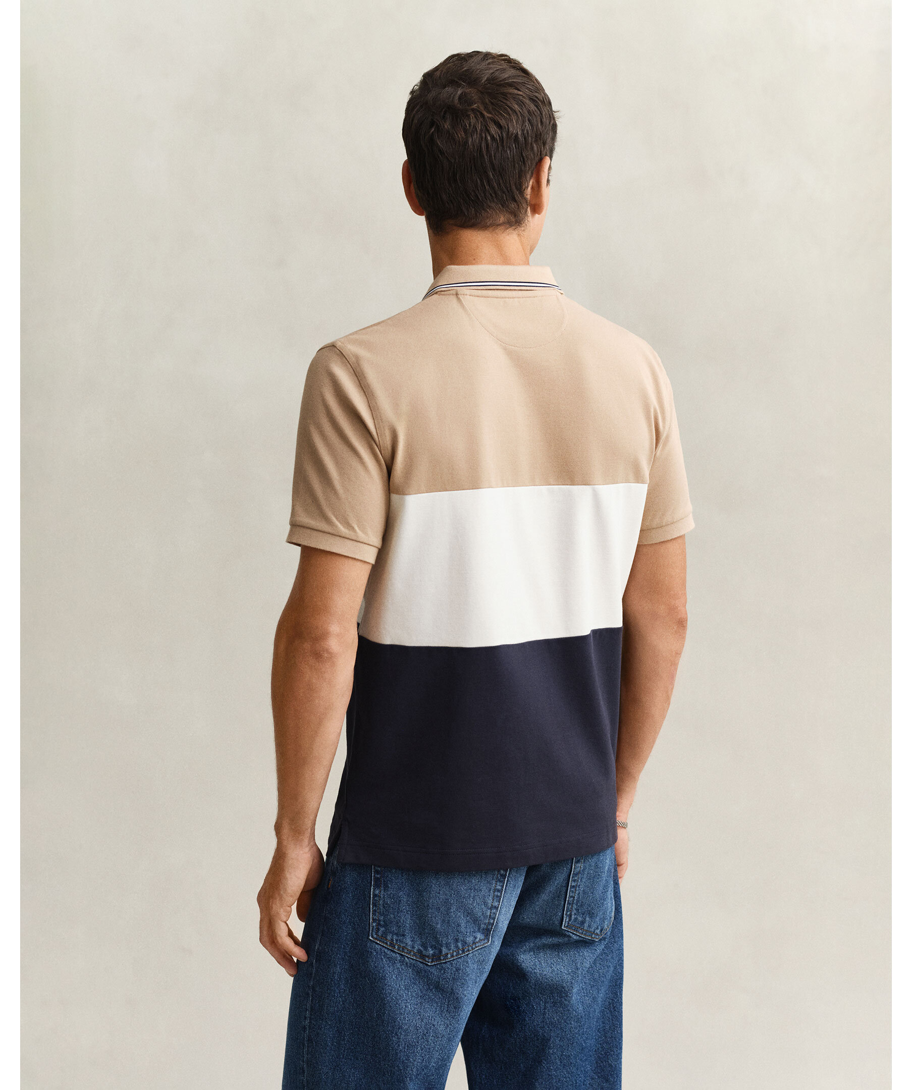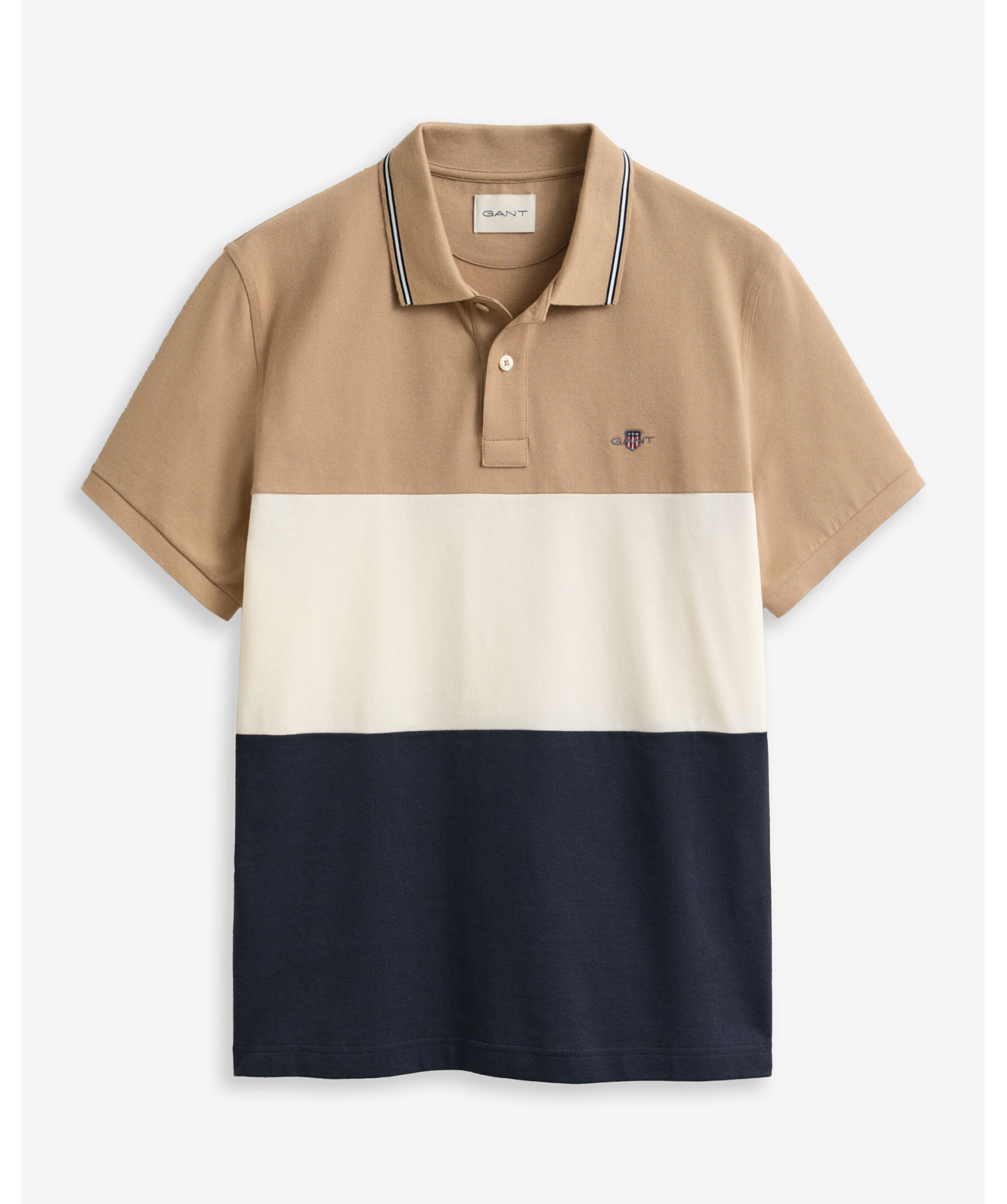 Kortärmad pikétröja från Gant. Randigt block mönster i beige, vitt och marinblått. Smal rand på kragen och logotyp på bröstet.