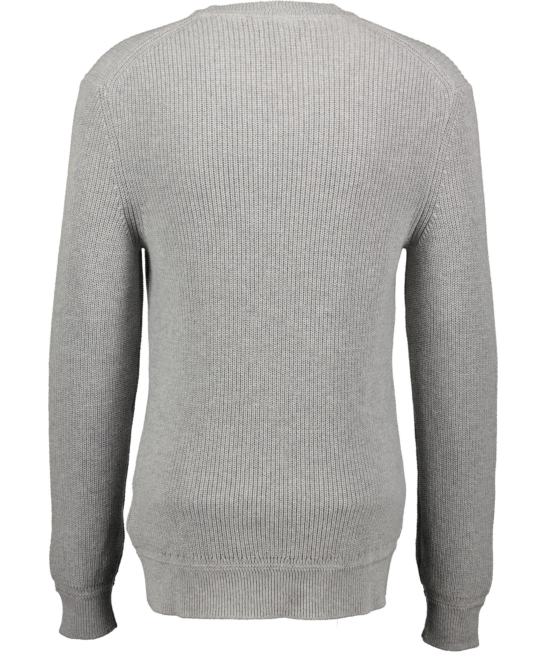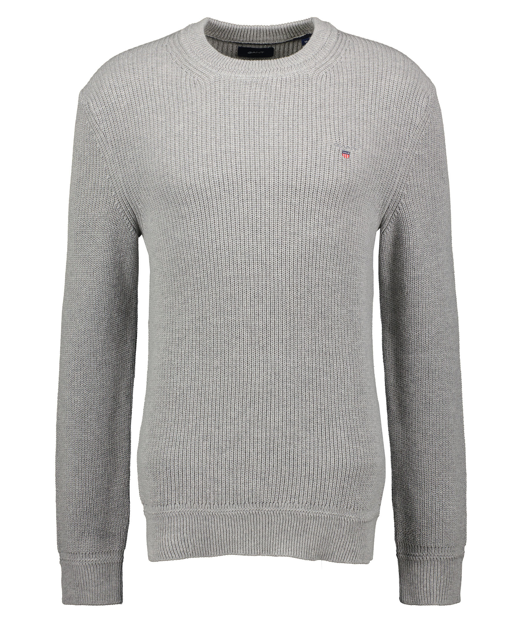 Grå stickad tröja från Gant. Rundad halsringning. Ribbstickade muddar vid ärm- och plaggslut. Broderad logotyp på vänster bröst. Tillverkad i ull och bommullsblandning.