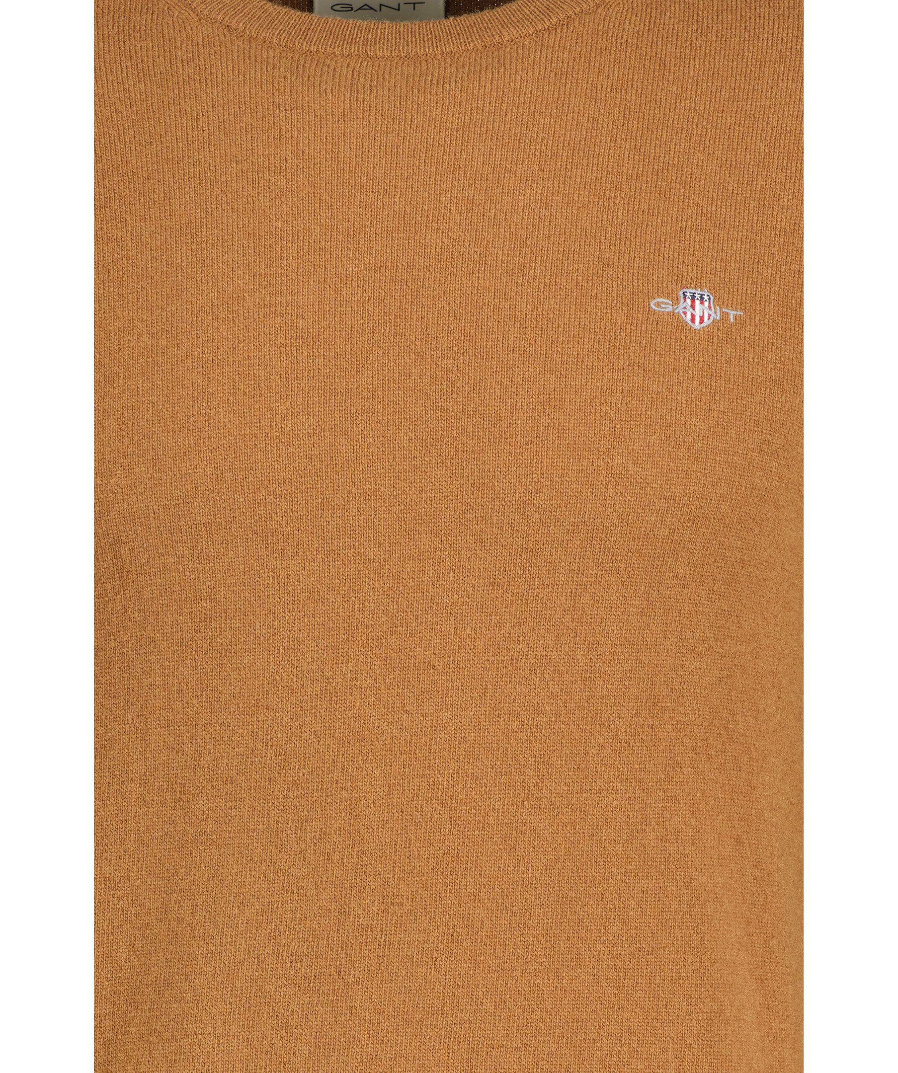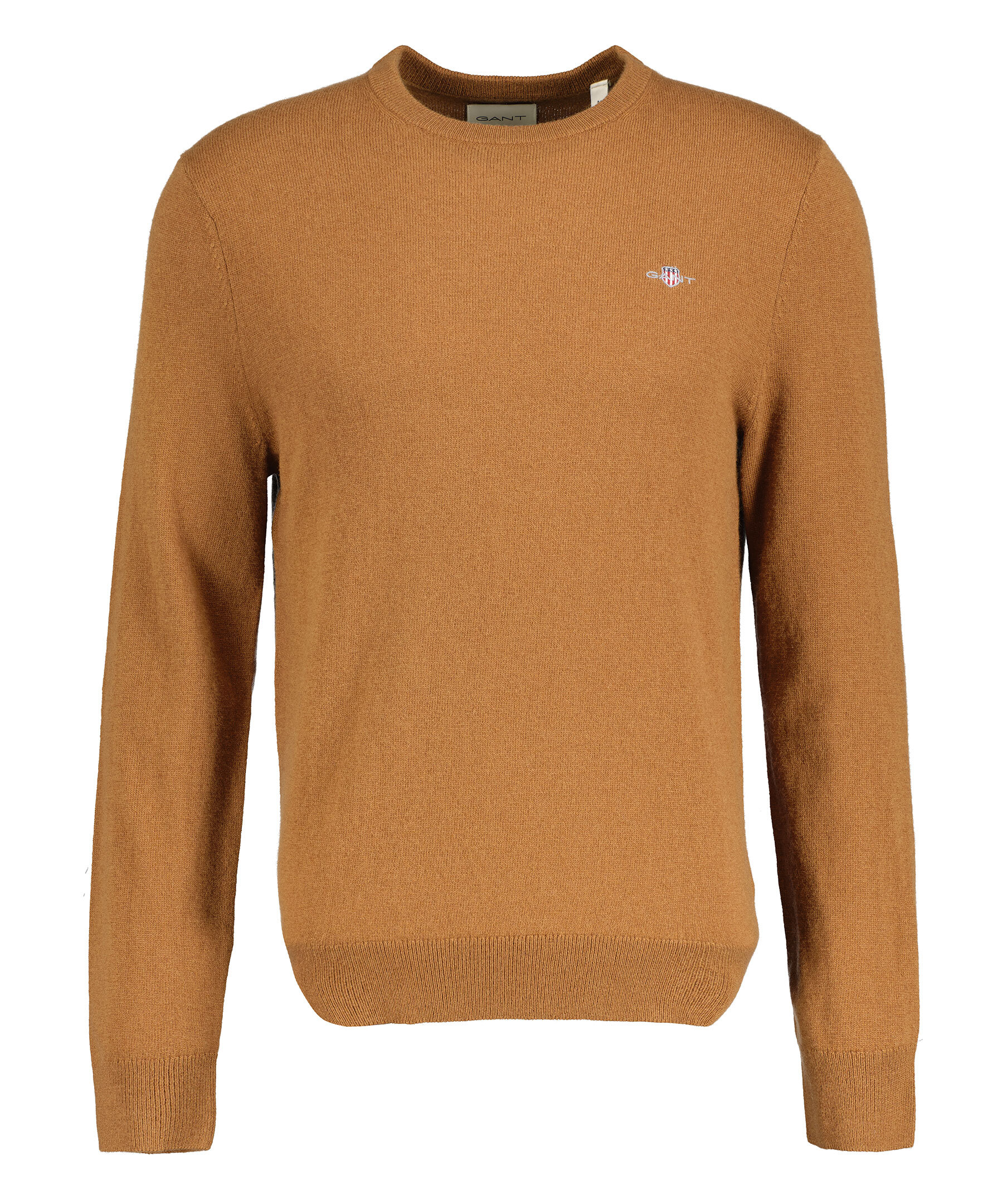 Brun, stickad tröja från Gant. Tröjan har en rund, ribbstickad halsringning, ribbstickade muddar vid ärm- och plaggslut samt en liten broderad sköldlogotyp på bröstet. Tillverkad i en ullblandning.