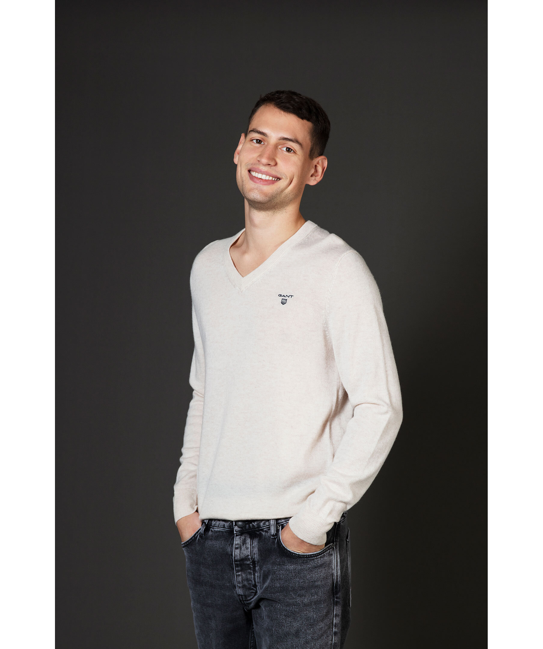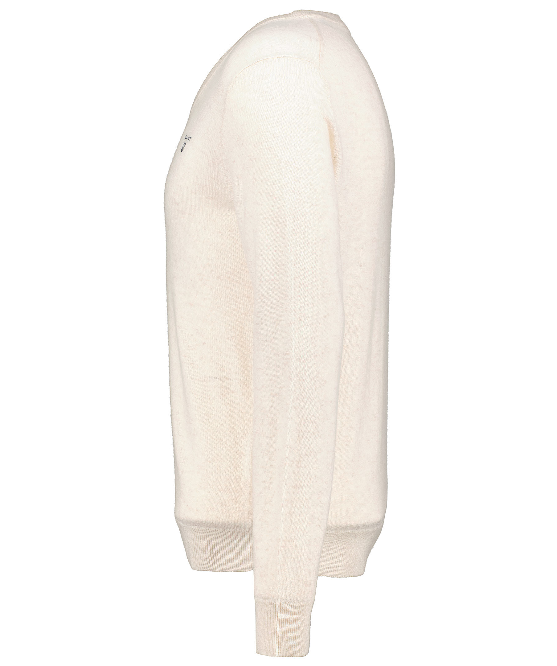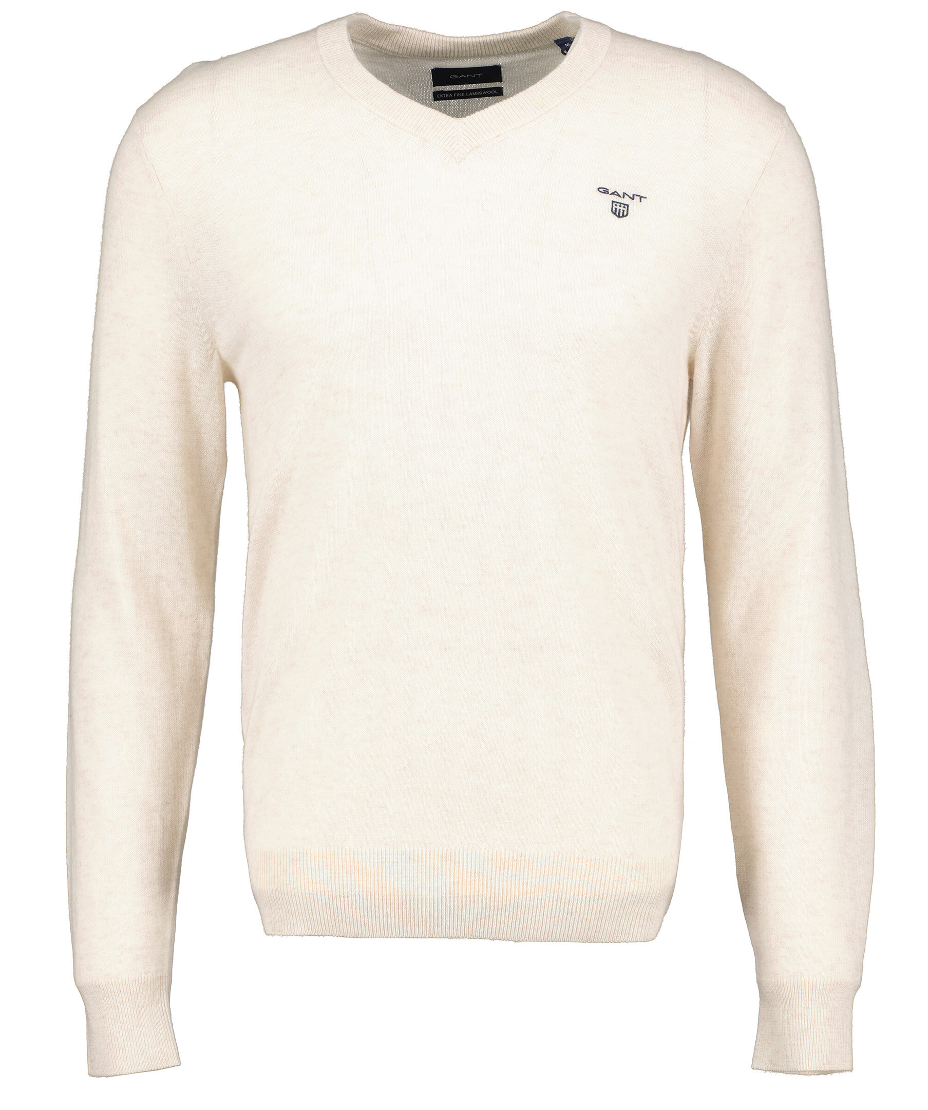 Ljusbeige finstickad V-ringad tröja från Gant. Tröjan är gjord i ett tunt superfint lammullsmaterial. Normal passform, ribbstickade muddar och broderad logotyp på bröstet. Perfekt att använda som en pullover.