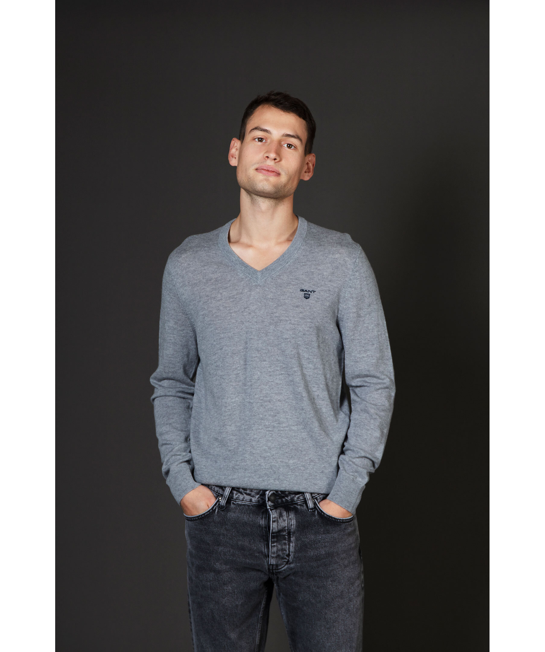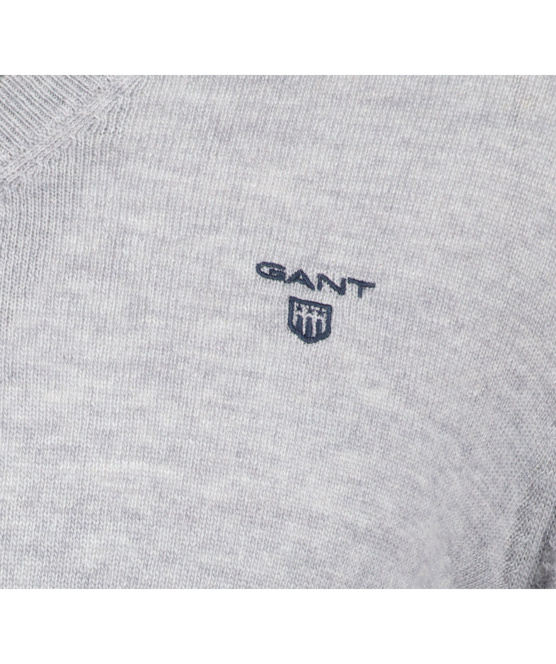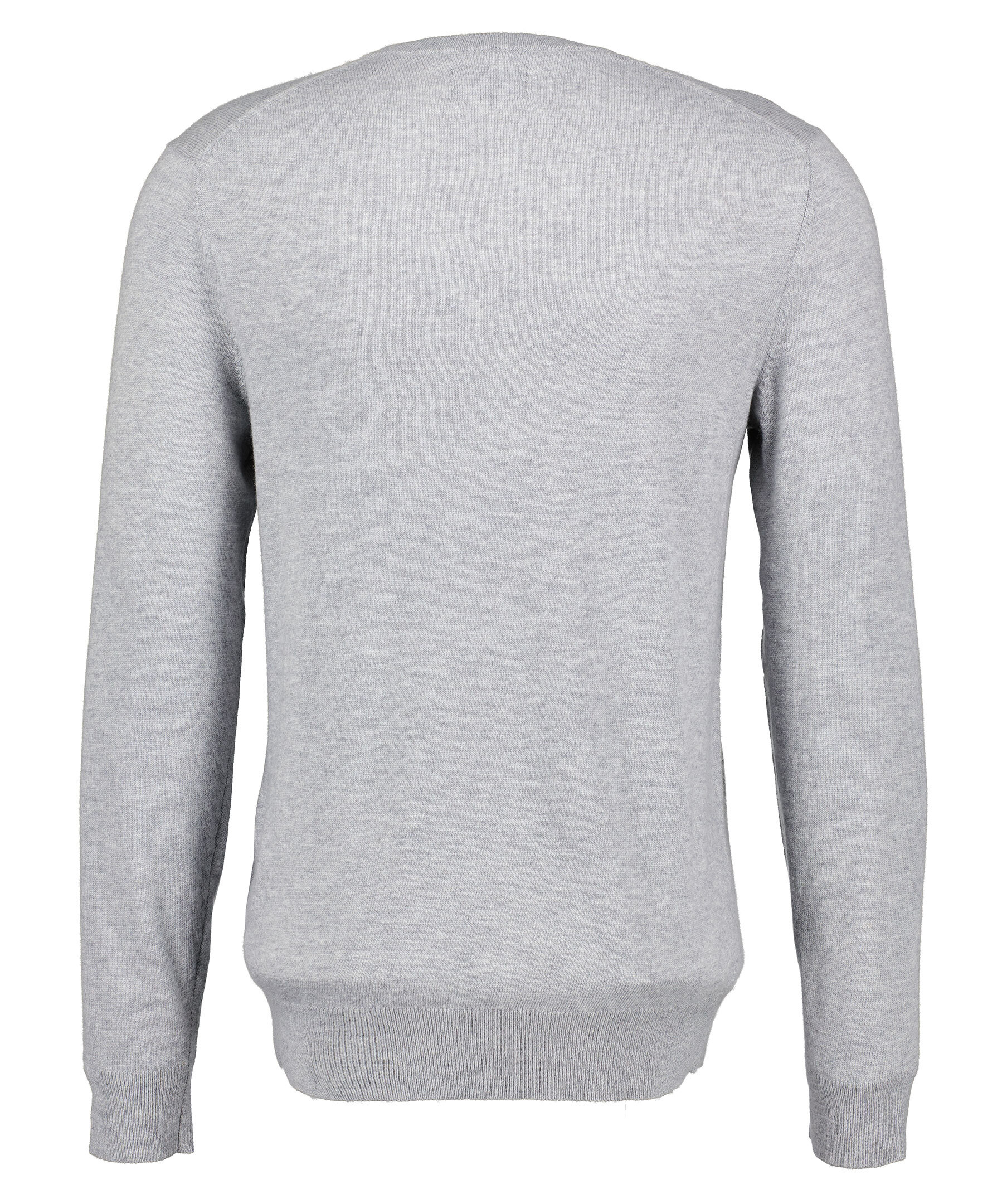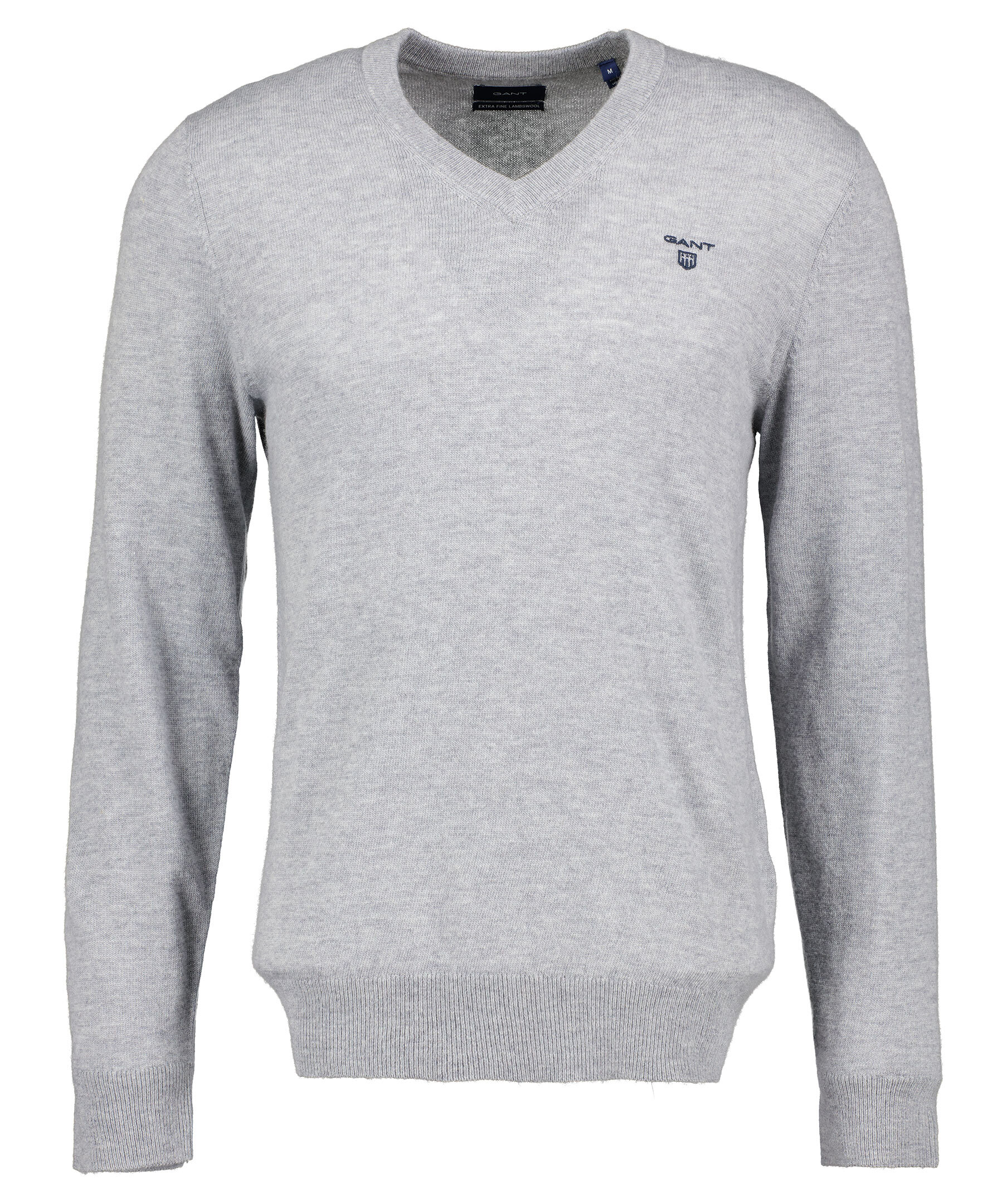 Gråmelerad finstickad V-ringad tröja från Gant. Tröjan är gjord i ett tunt superfint lammullsmaterial. Normal passform, ribbstickade muddar och broderad logotyp på bröstet. Perfekt att använda som en pullover.