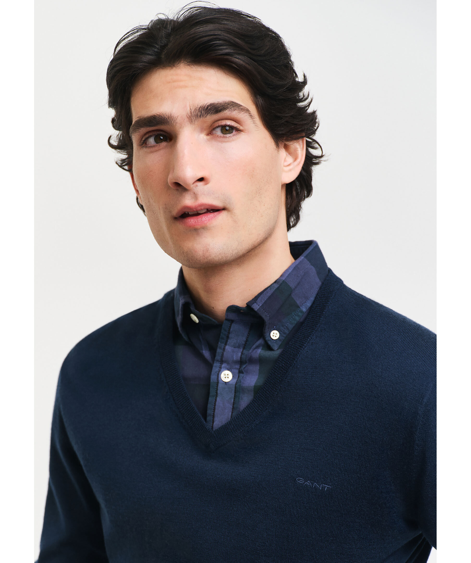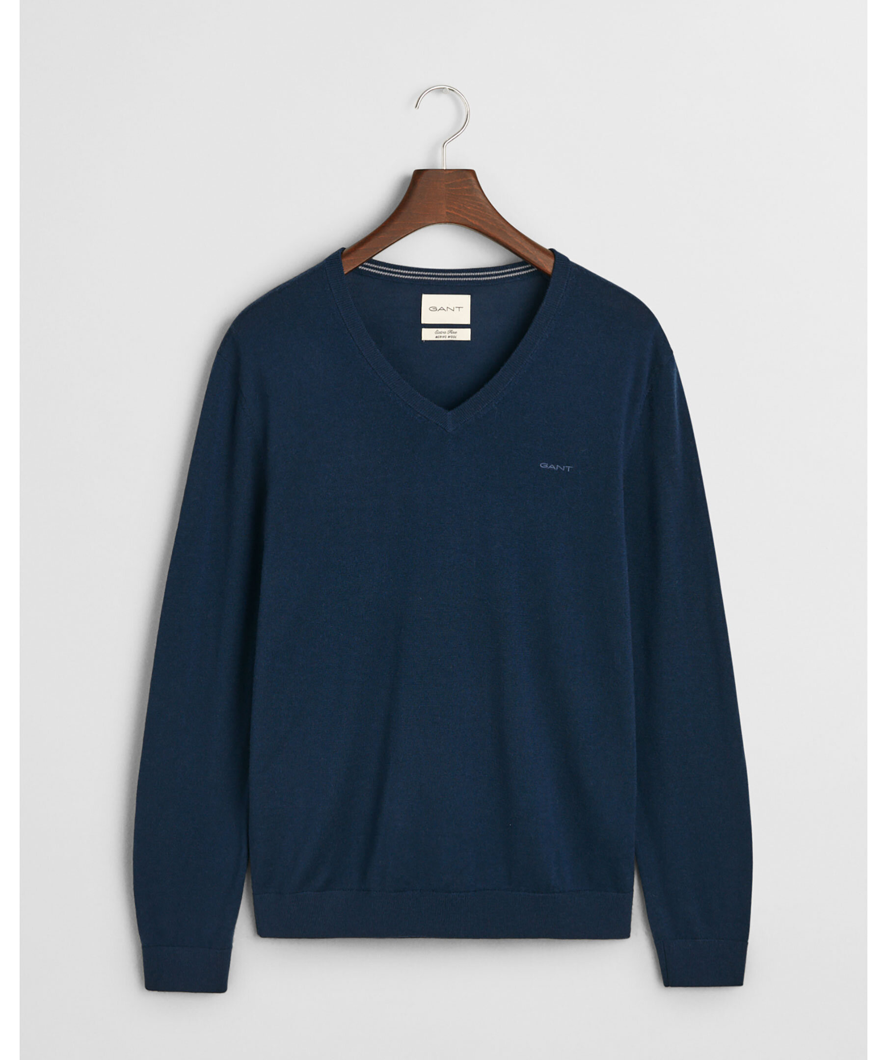Marinblå, stickad tröja från Gant. Tröjan har en v-ringad, ribbstickad halsringning, ribbstickade muddar vid ärm- och plaggslut samt en liten broderad logotyp på bröstet. Tillverkad i 100% merinoull.