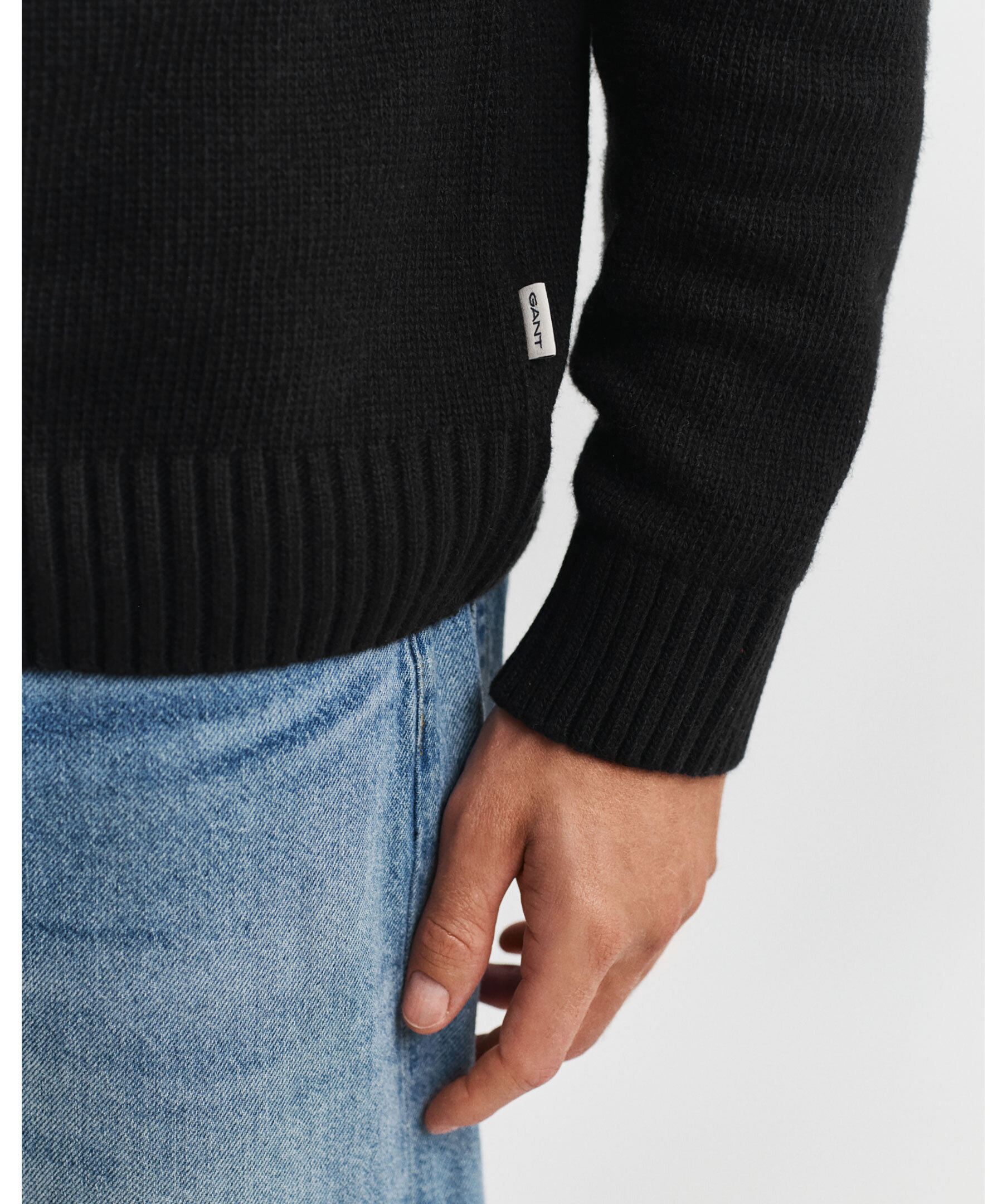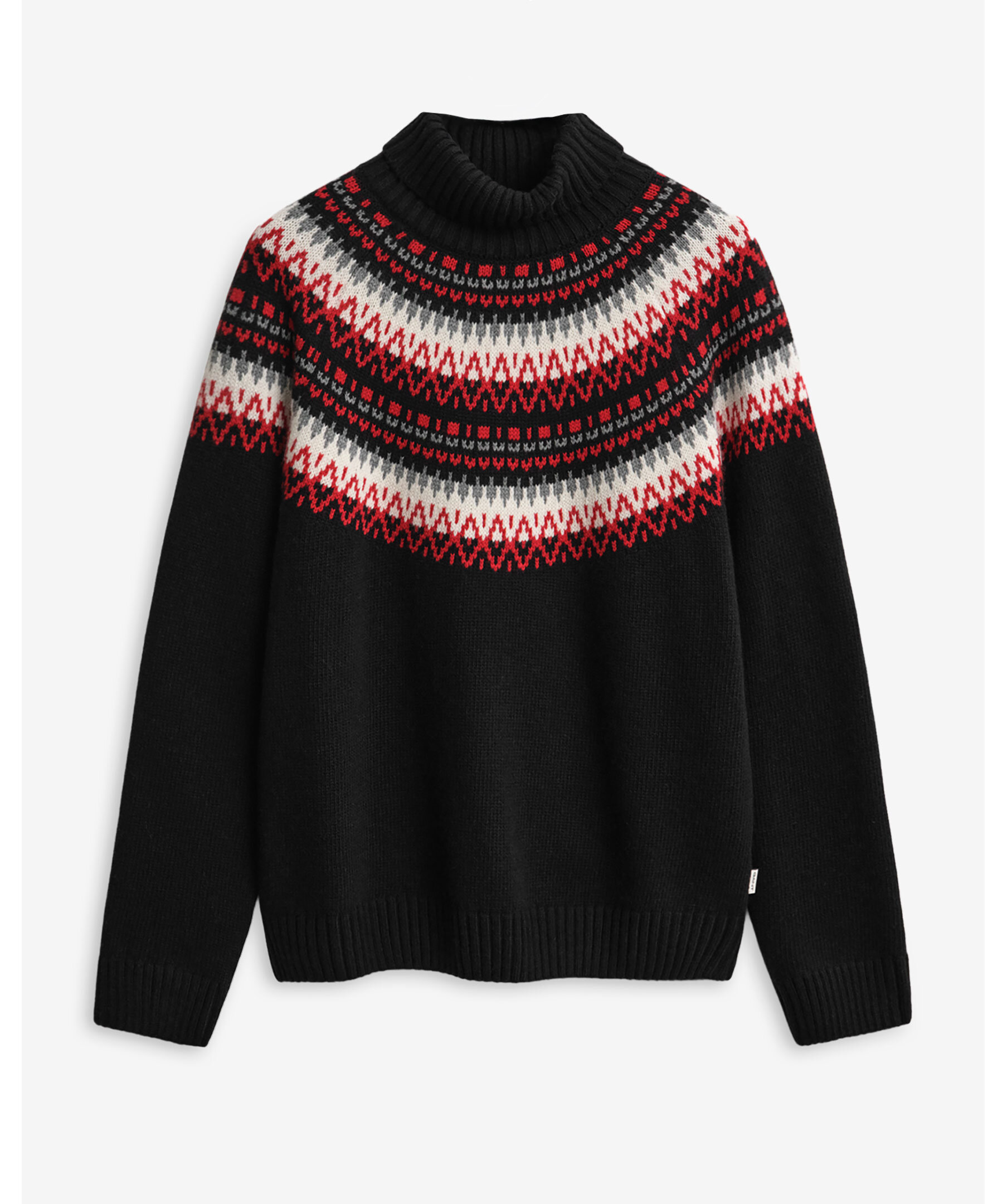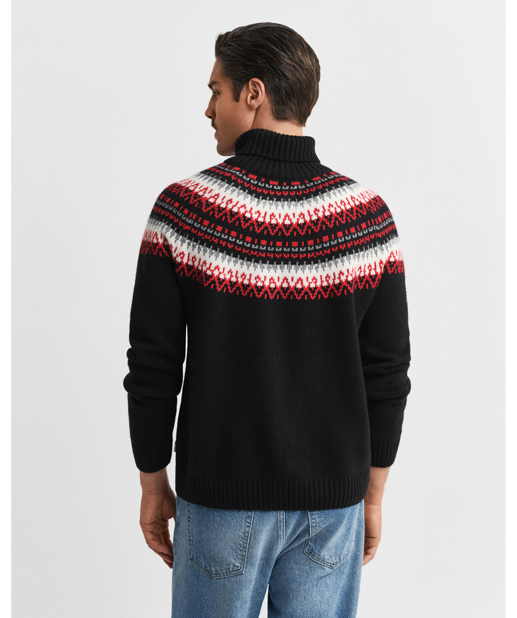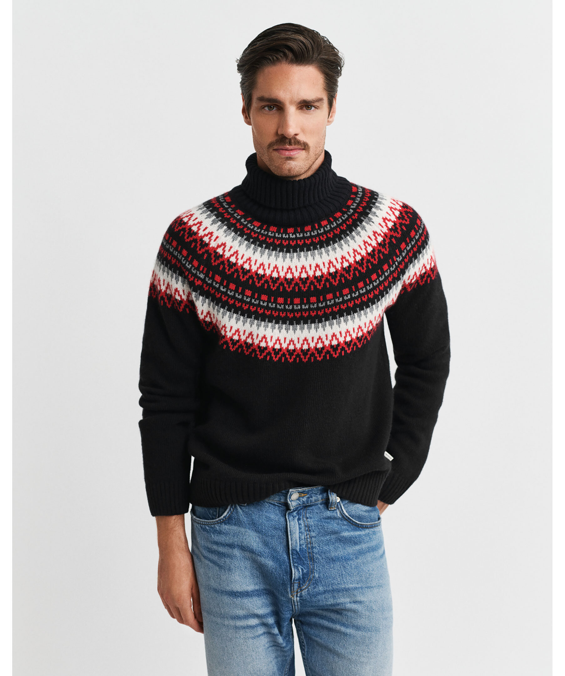 Svart stickad tröja från GANT med polokrage. Tillverkad av ekologisk bomull, ull och viskos, och pryds av ett klassiskt Fair Isle-mönster. Regular passform och ribbstickade muddar samt krage.
