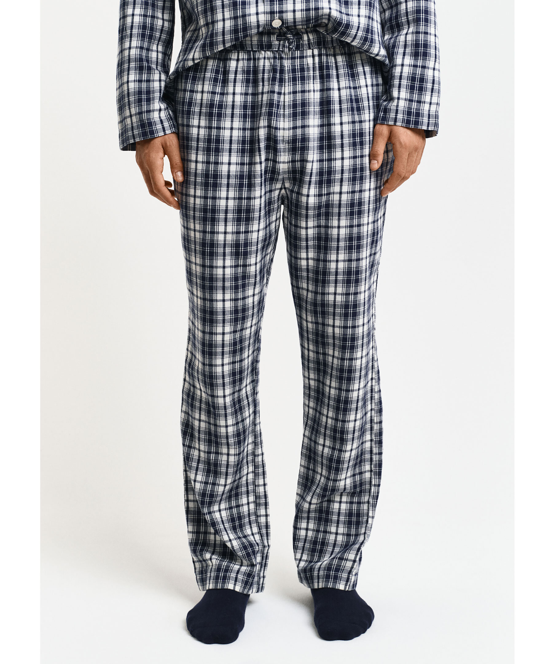 Blå och vitrutig pyjamas set från Gant. Flanellpyjamas men skjorta och byxor i regular fit. Skjortan knäpps framtill med knappar och har en broderad liten Gant logotyp på bröstfickan. Byxorna har sidofickor och elastisk midja med snörning. Tillverkad av 100% bomull.