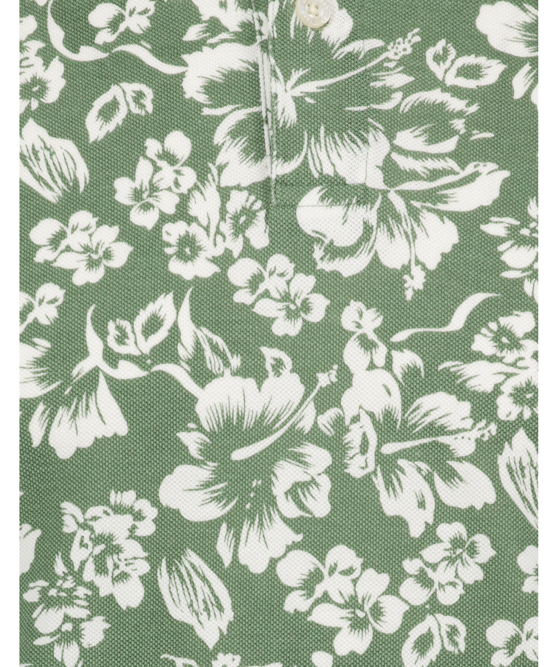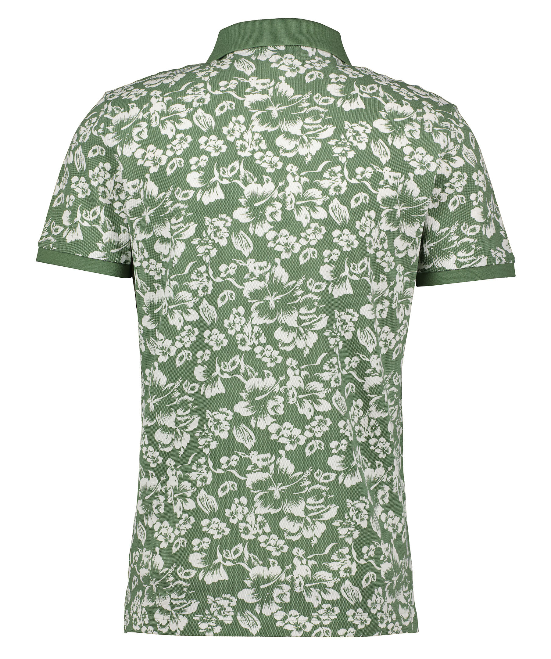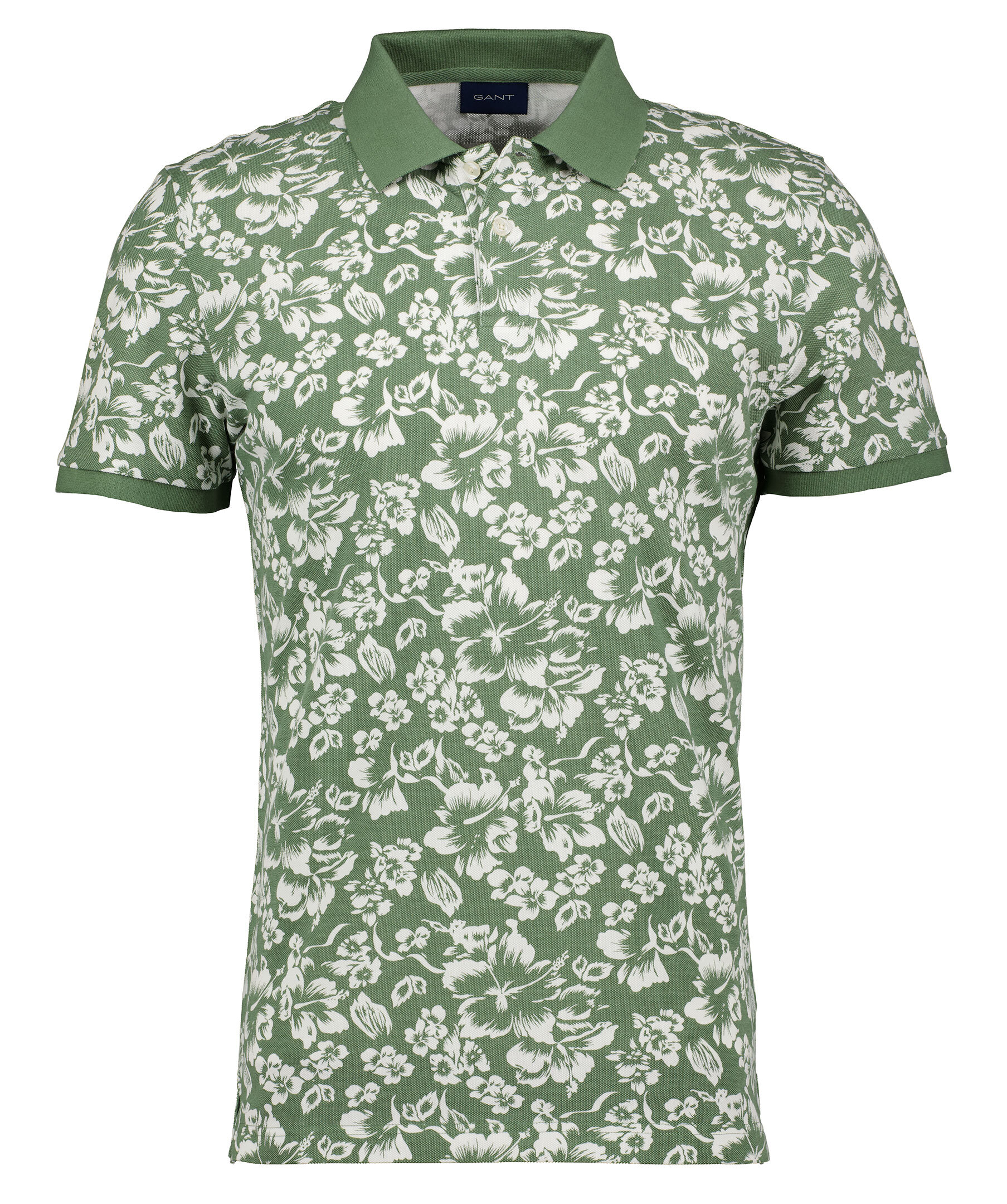 Olivgrön, blommönstrad och kortärmad pikétröja från Gant. Tillverkad i bomull, har en liten broderad gant-logga på bröstet och två knappar fram. Ribbstickade muddar och korta sidoslitsar.
